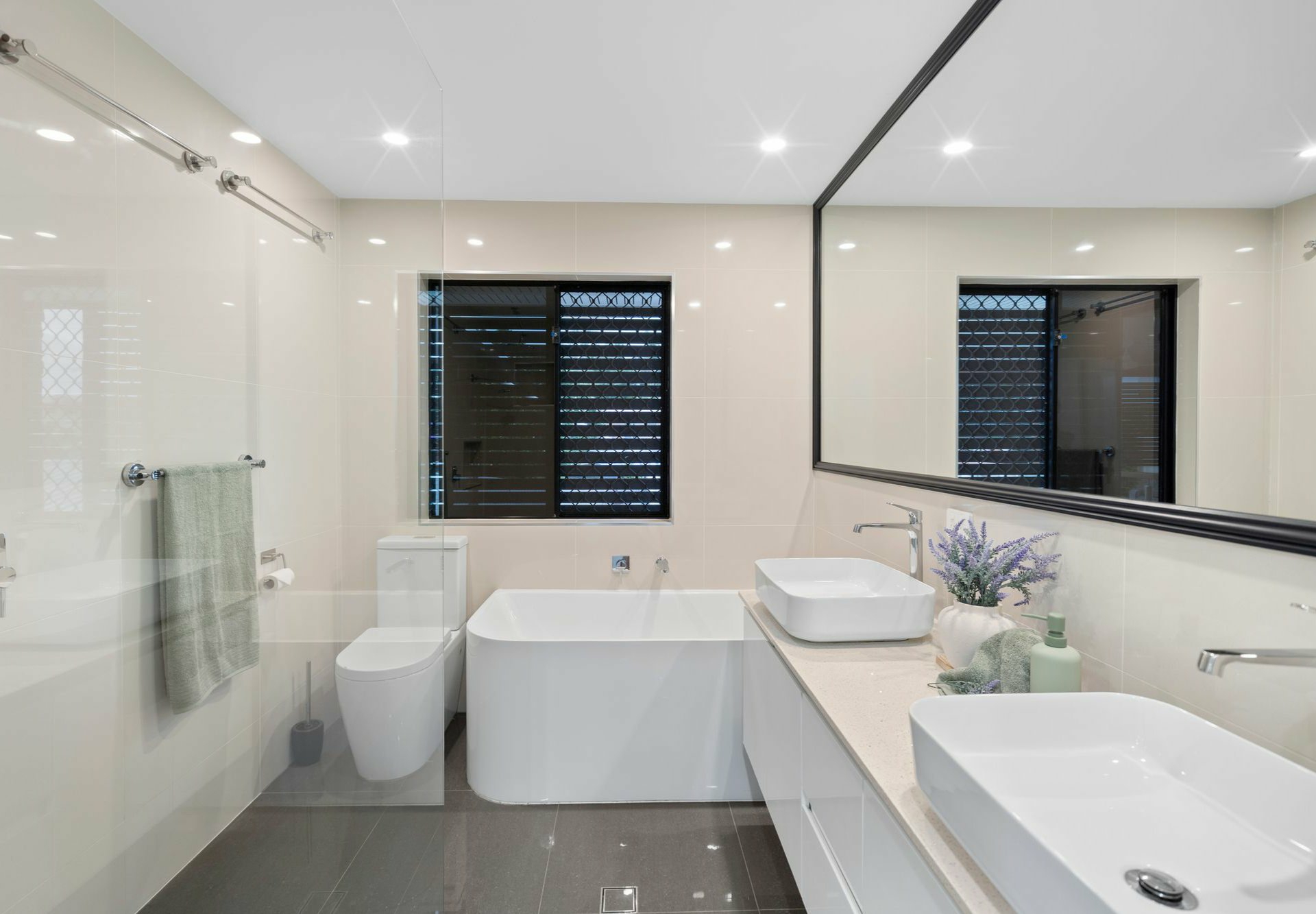 - Luxe bathroom: twin basins, floating vanity, curved tub, frameless glass enclosed shower