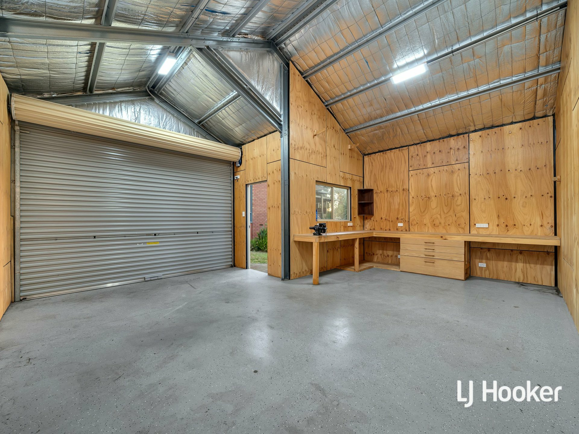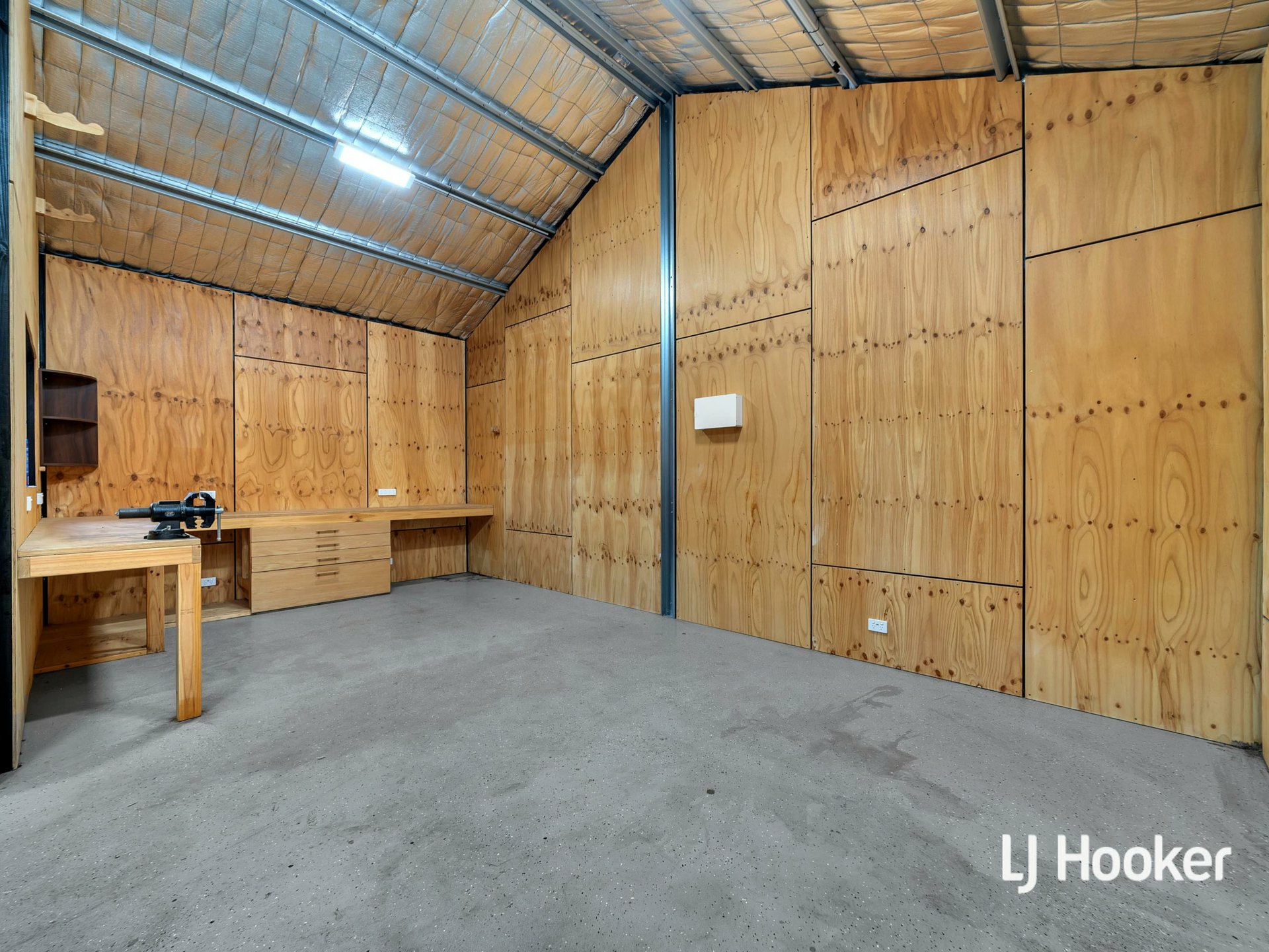 Car accommodation and storage are exceptional. The property features an automatic double garage with rear access, ideal for secure everyday parking. Separate to this is a substantial garage or workshop complete with concrete flooring, built-in benches and cupboards, power supply and electric roller doors — perfect for tradies, hobbyists or additional storage.
