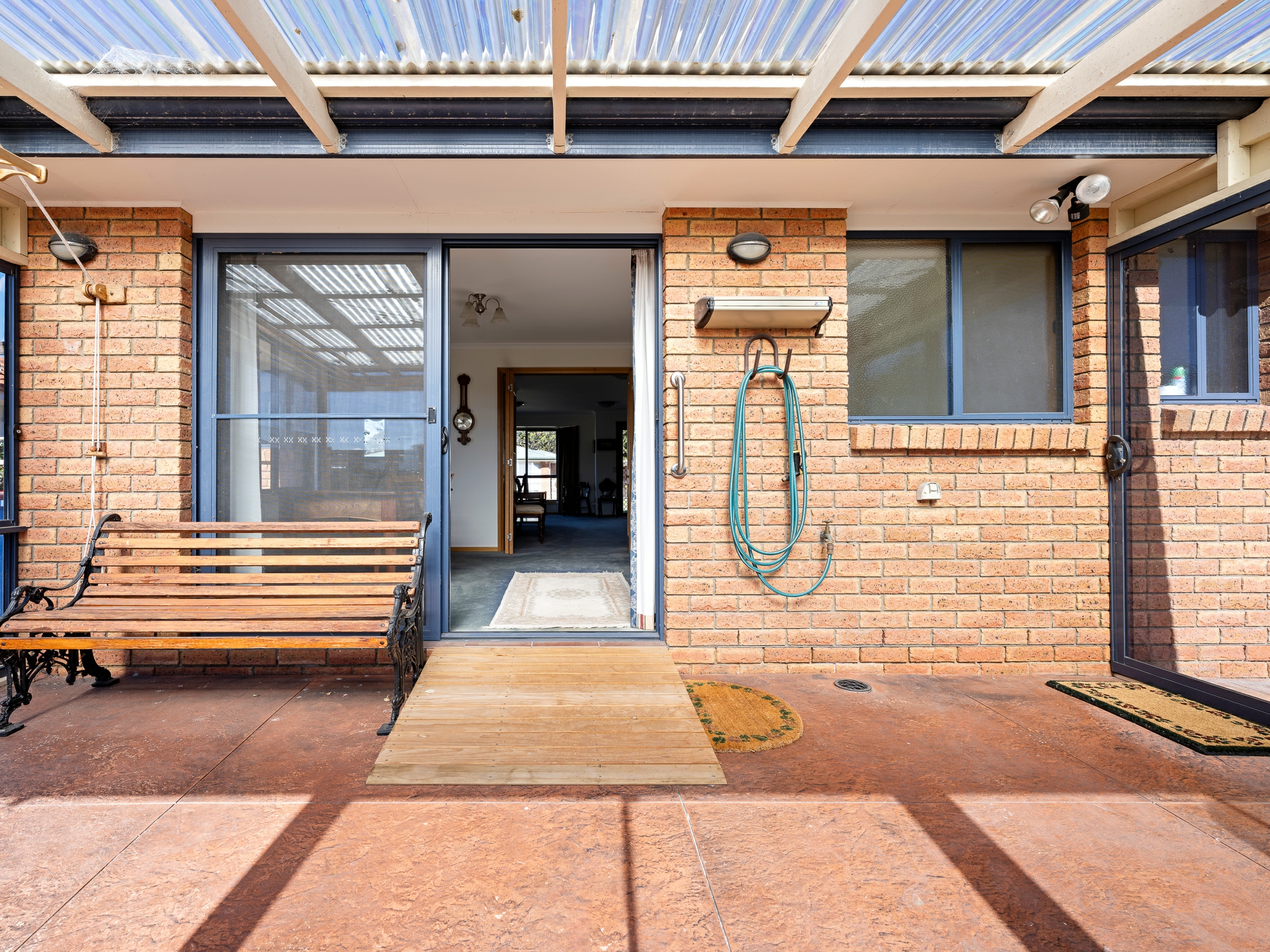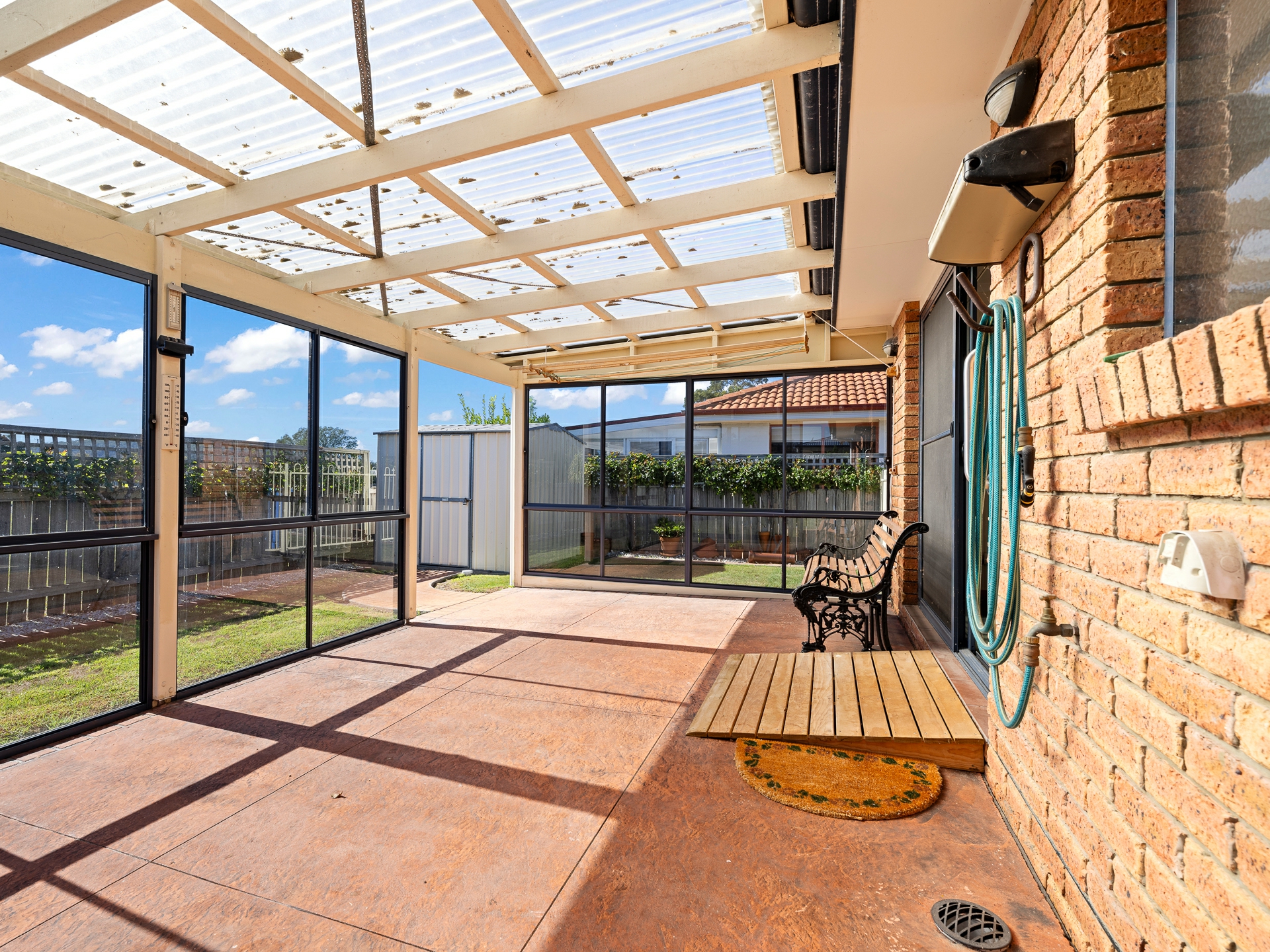 This home offers the bonus configuration of either three bedrooms or two bedrooms and second lounge room. The huge master bedroom has a generous walk-in wardrobe and ensuite. The centrally located kitchen is well appointed for a villa, with loads of cupboard and bench space, gas cooking and a corner pantry. The separate dining area flows out to the glassed-in outdoor area, which provides a wonderful suntrap to enjoy during cool winter days, while it is drying your clothes and transferring warmth to the rest of the house. The rear garden offers the opportunity to indulge your cottage garden green-thumb or to maintain the existing lawn area with its water tank and garden shed, all at the same level.