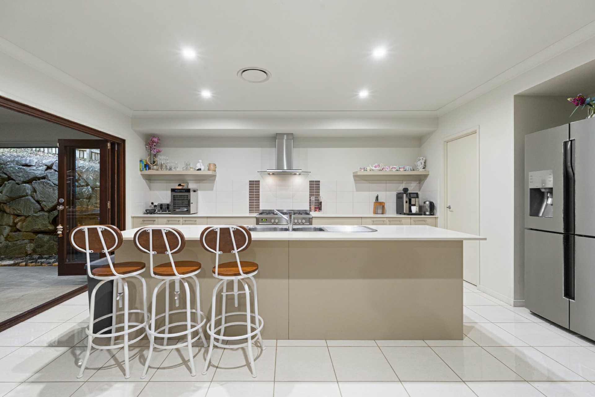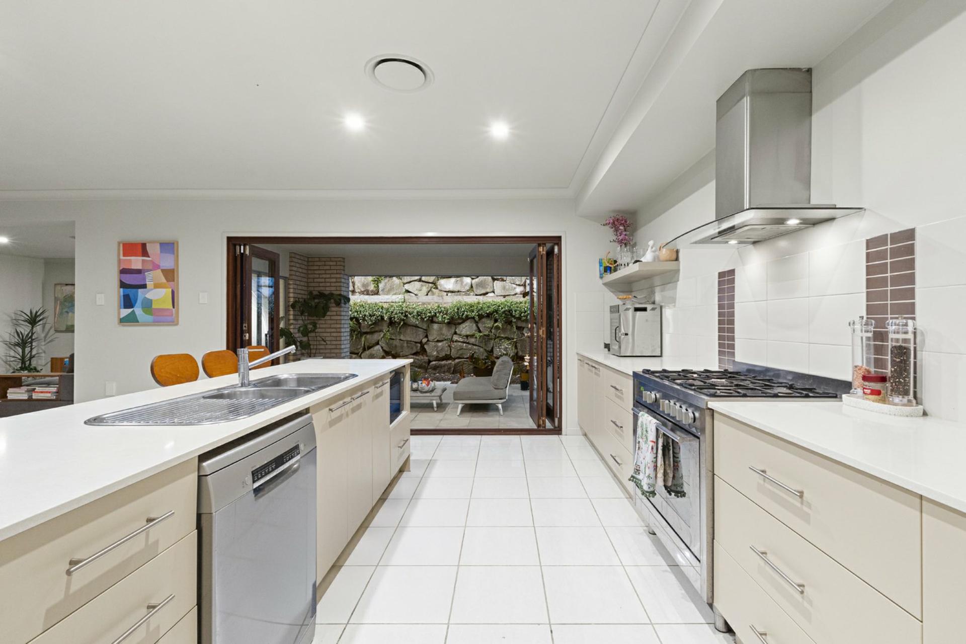Entertaining is effortless, with stunning timber-framed bi-fold doors opening to a generous outdoor area, framed by private rock walls and landscaped gardens.