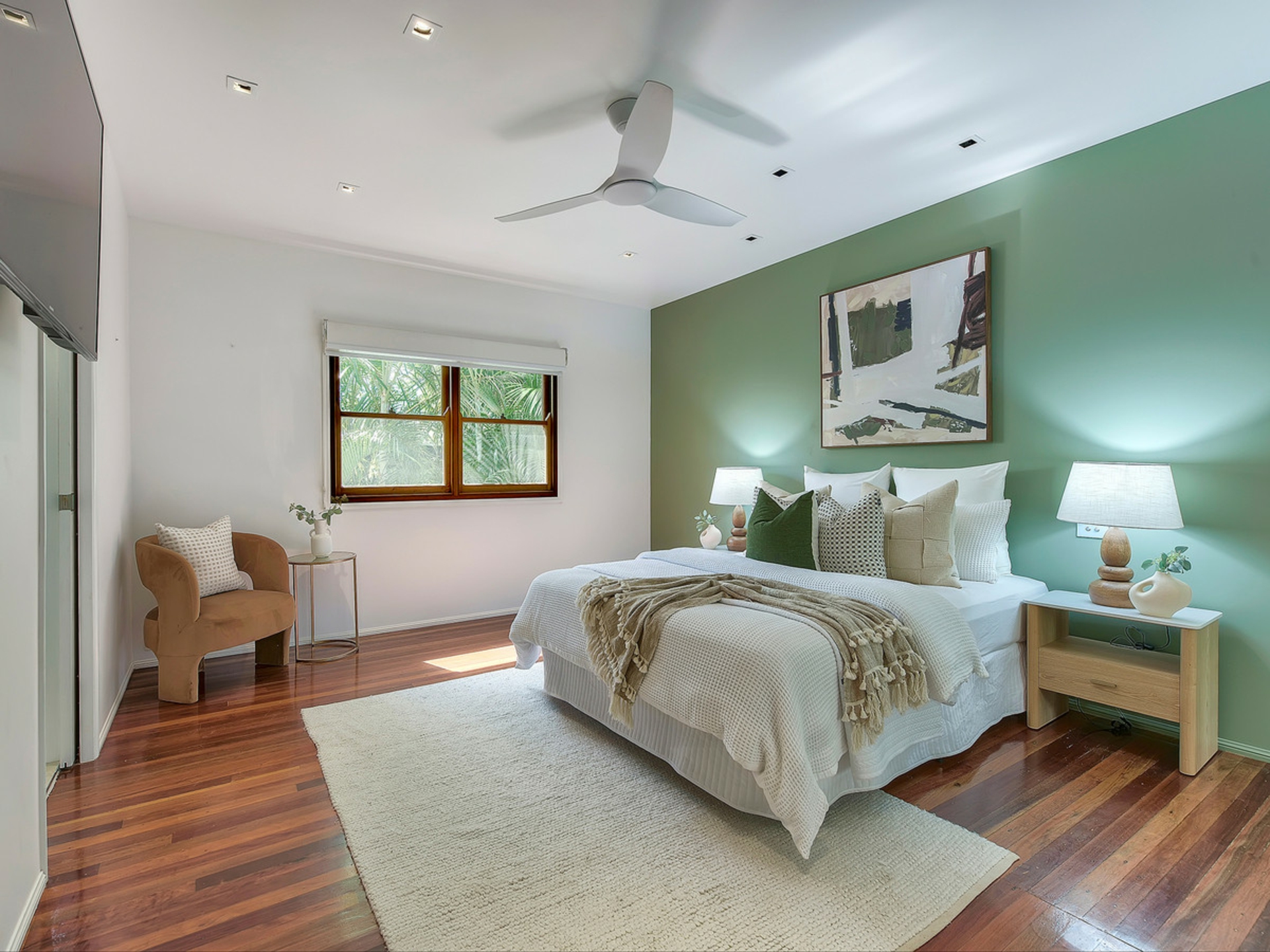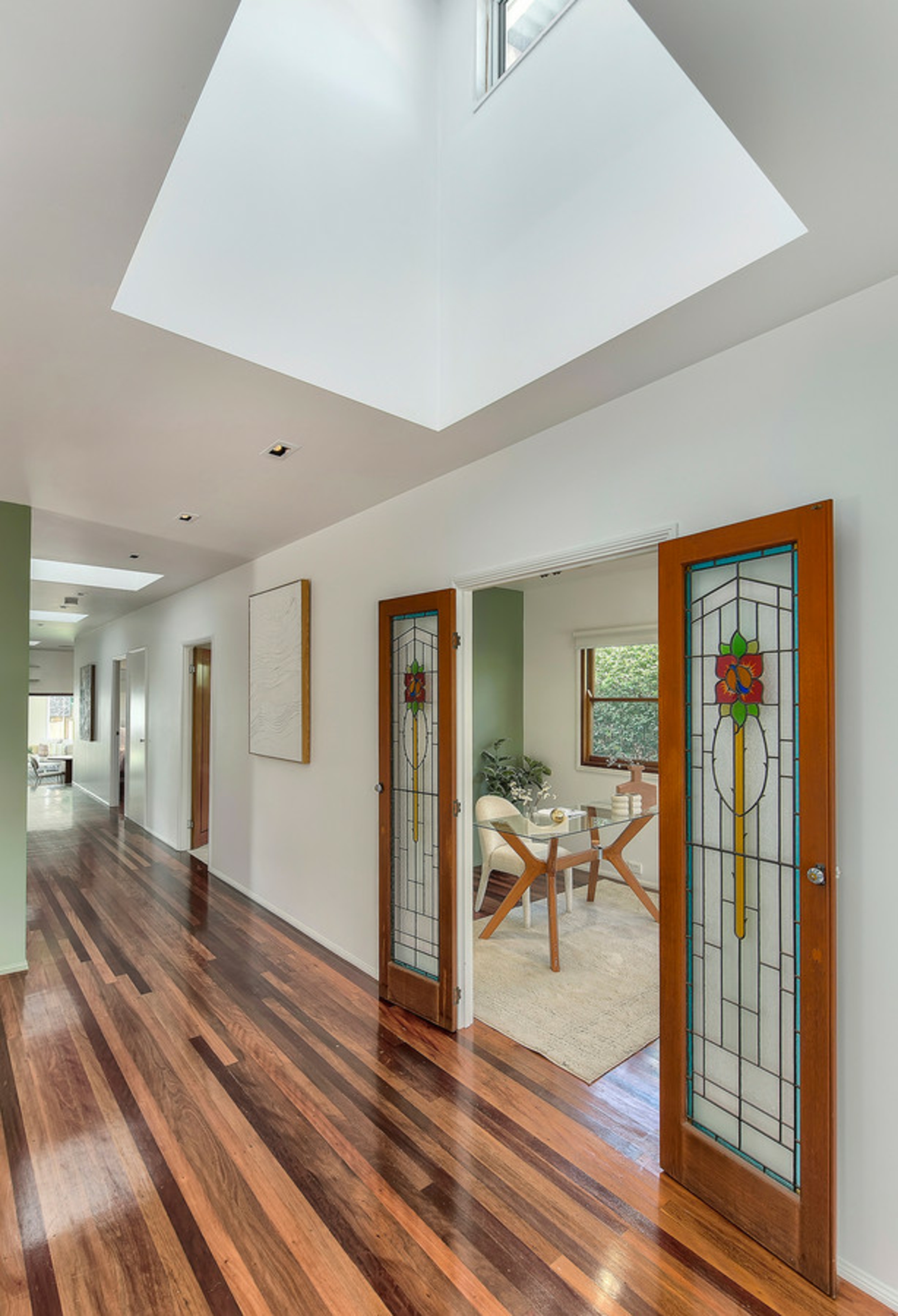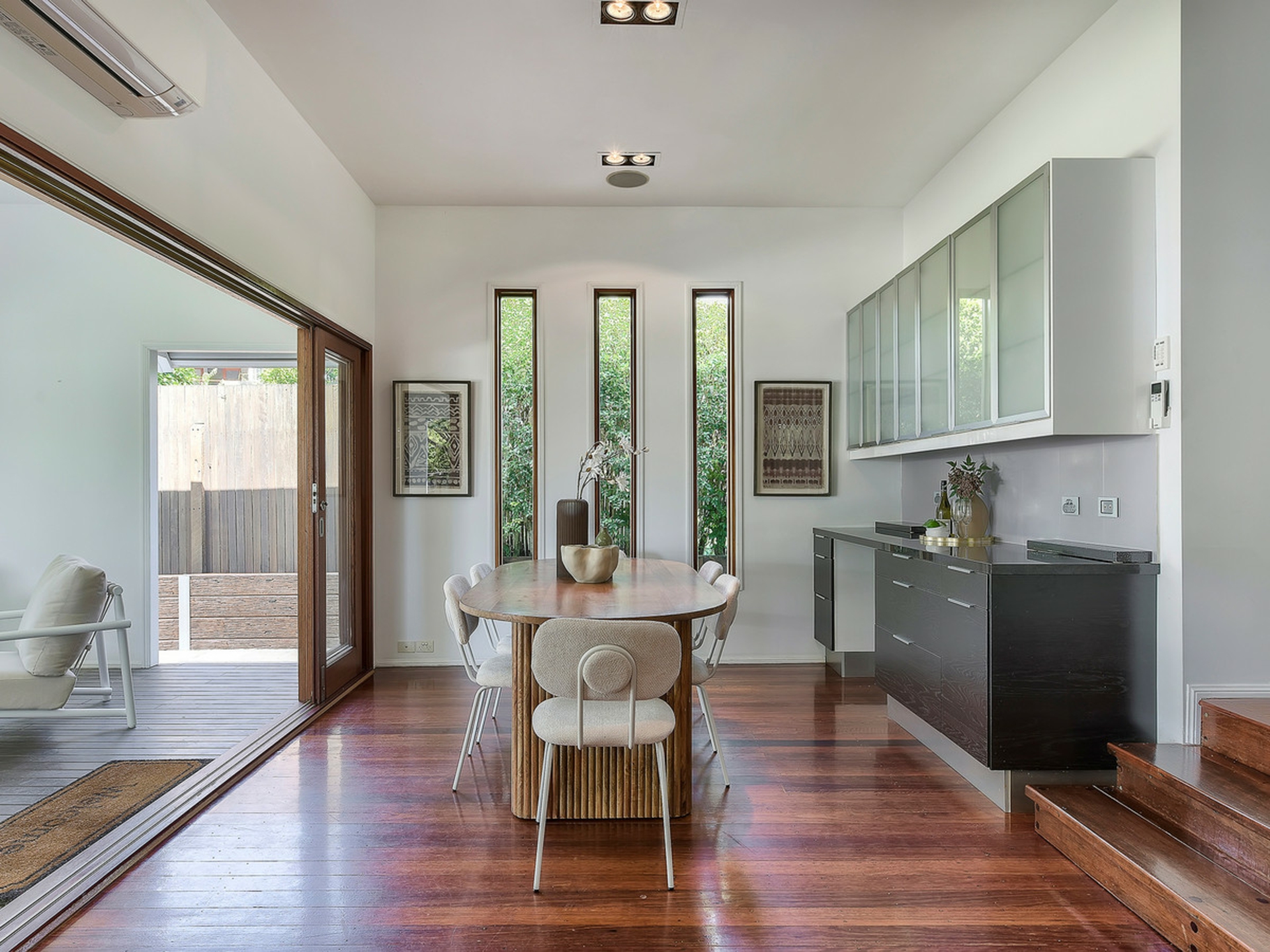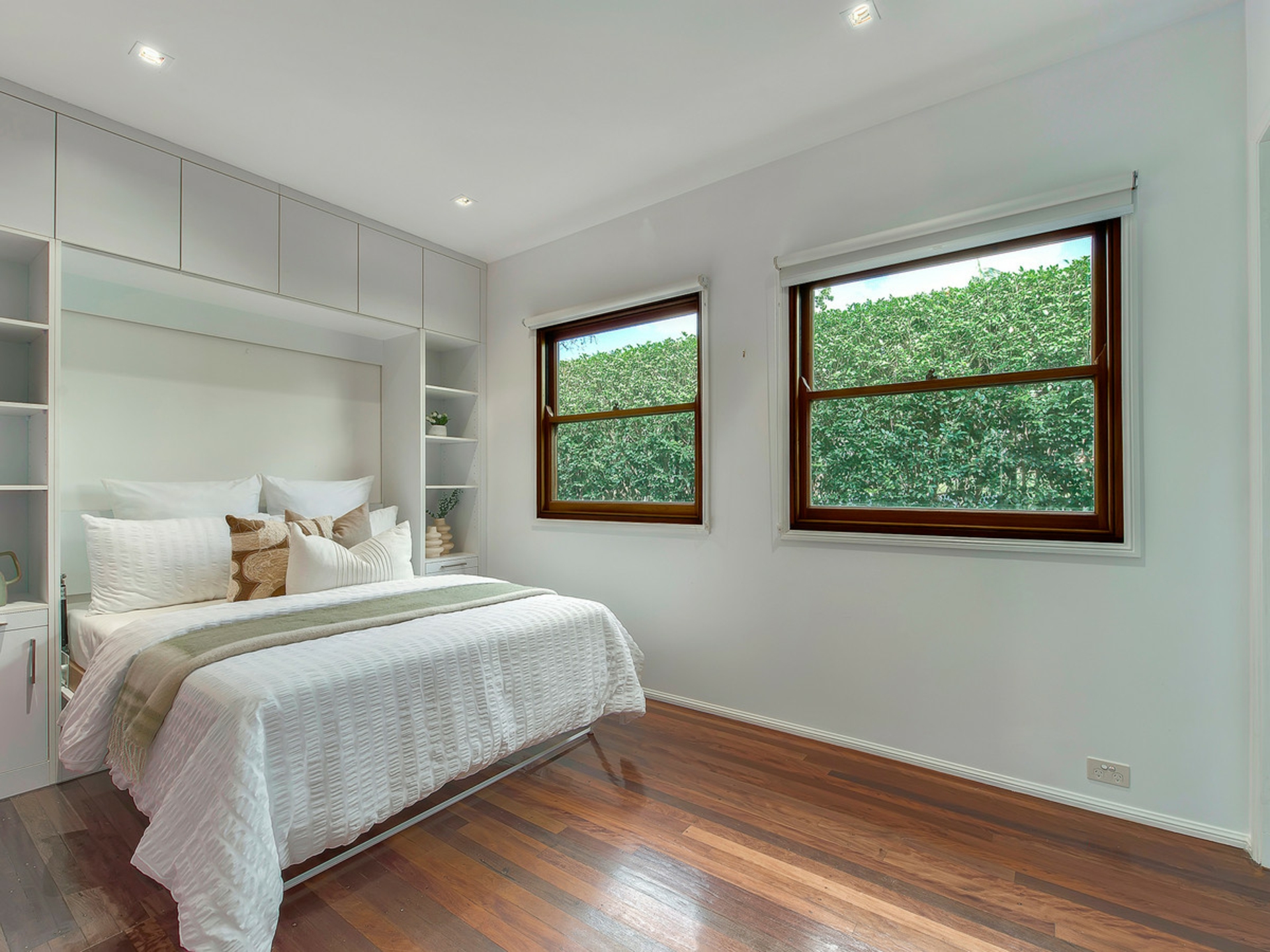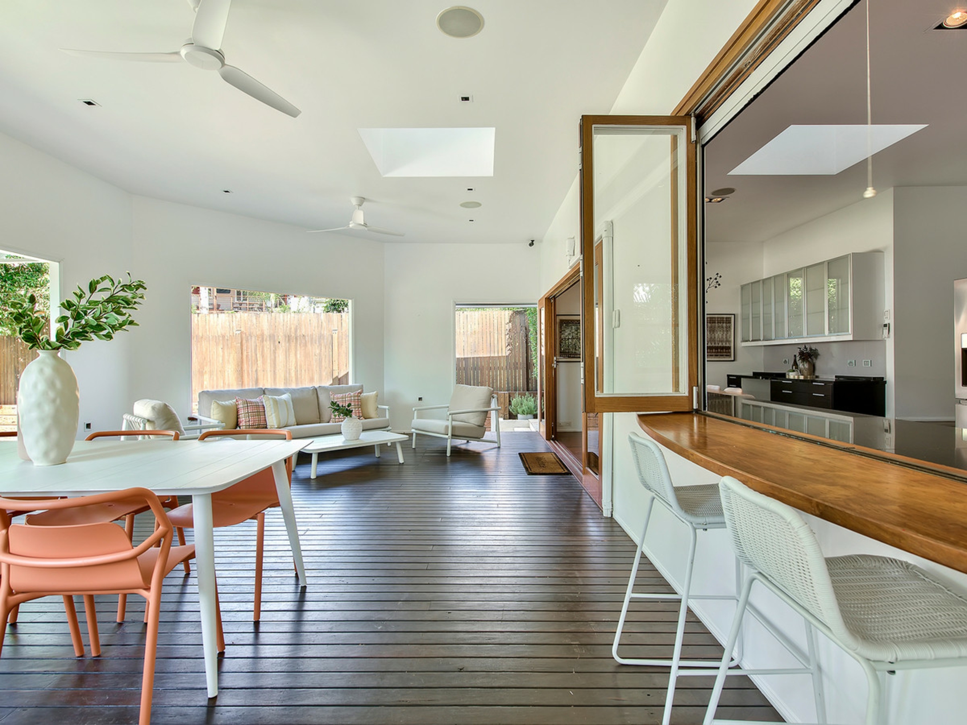 The home's architectural renovation continues its mid-century spirit. Polished hardwood floors connect the internal floorplan, and are mirrored in the al fresco's timber accents and sliding timber doors. Square-set cornicing is a fantastic modern touch. Stained glass doors to bedroom four are a tasteful addition. Feature walls represent a lovely contemporary palette. The kitchen has fantastic connection to the outdoor space, with a servery the perfect breakfast spot. Built-in cabinetry, a smartly concealable wall-bed, renovated bathrooms, and air-conditioning all make this a perfect family home.