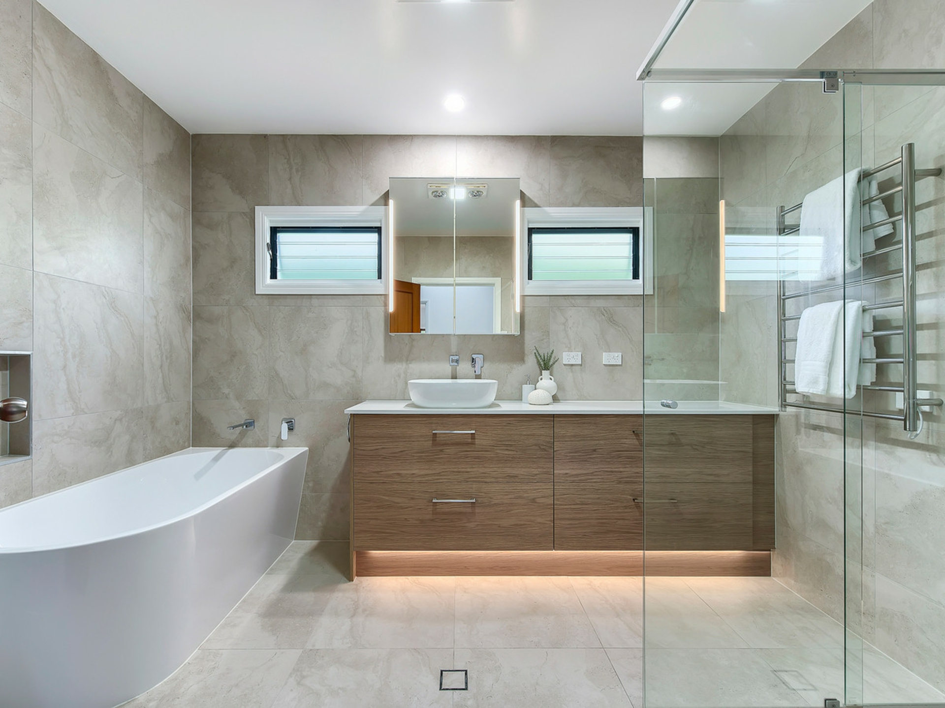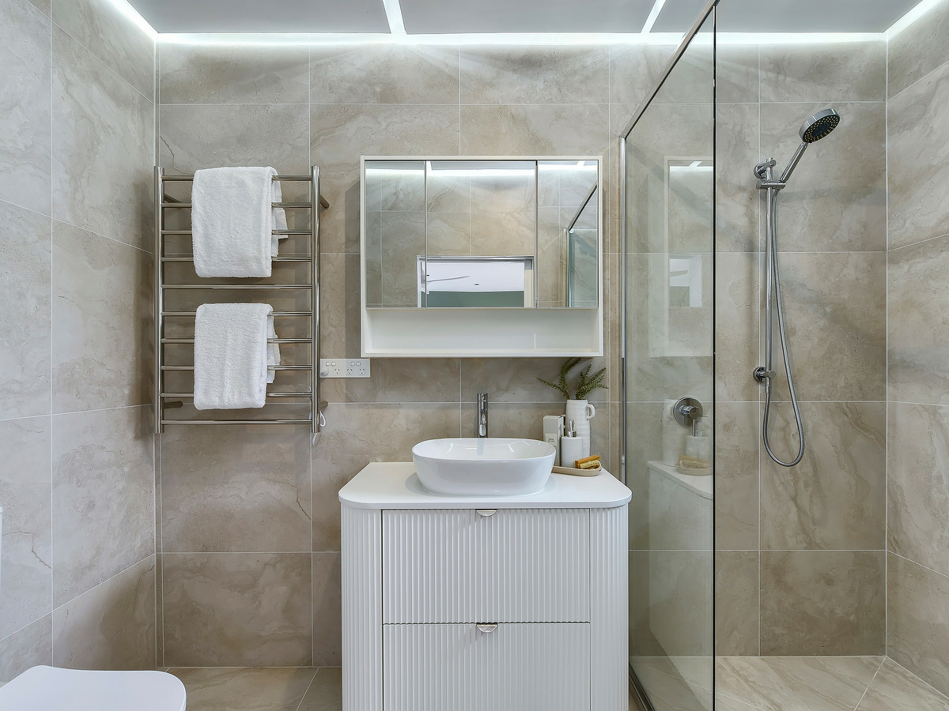• Renovated main bathroom with backlit cabinetry, heated towel rail, and bespoke tiling.