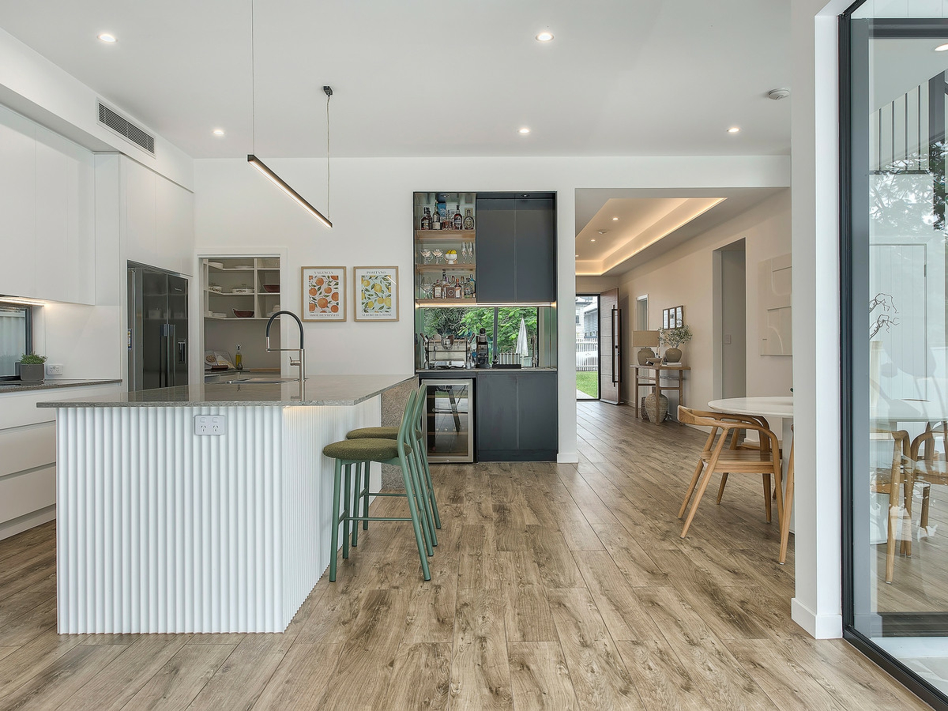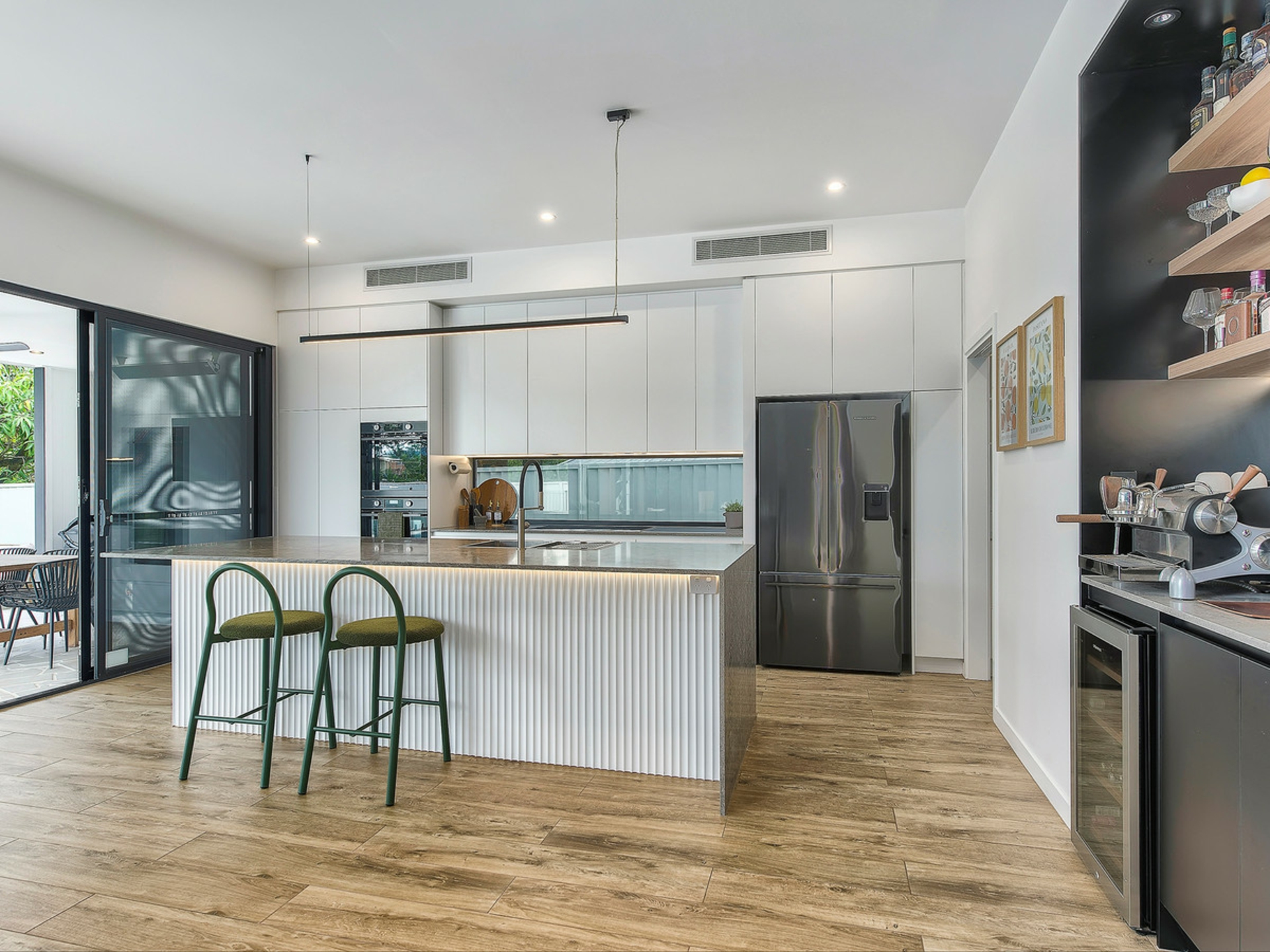 The heart of the home is the expansive open-plan living, dining, and kitchen zone, where a dramatic double-height void creates an immediate sense of space and light. This architectural centerpiece gives the living area a wonderful sense of scale and openness, making it a space that feels both impressive and welcoming. A striking designer kitchen anchors the room, featuring an oversized stone island, extensive custom cabinetry, premium appliances, and elegant pendant lighting. Polished timber flooring and refined finishes flow throughout, giving the home a warm, contemporary feel while maintaining a timeless quality.