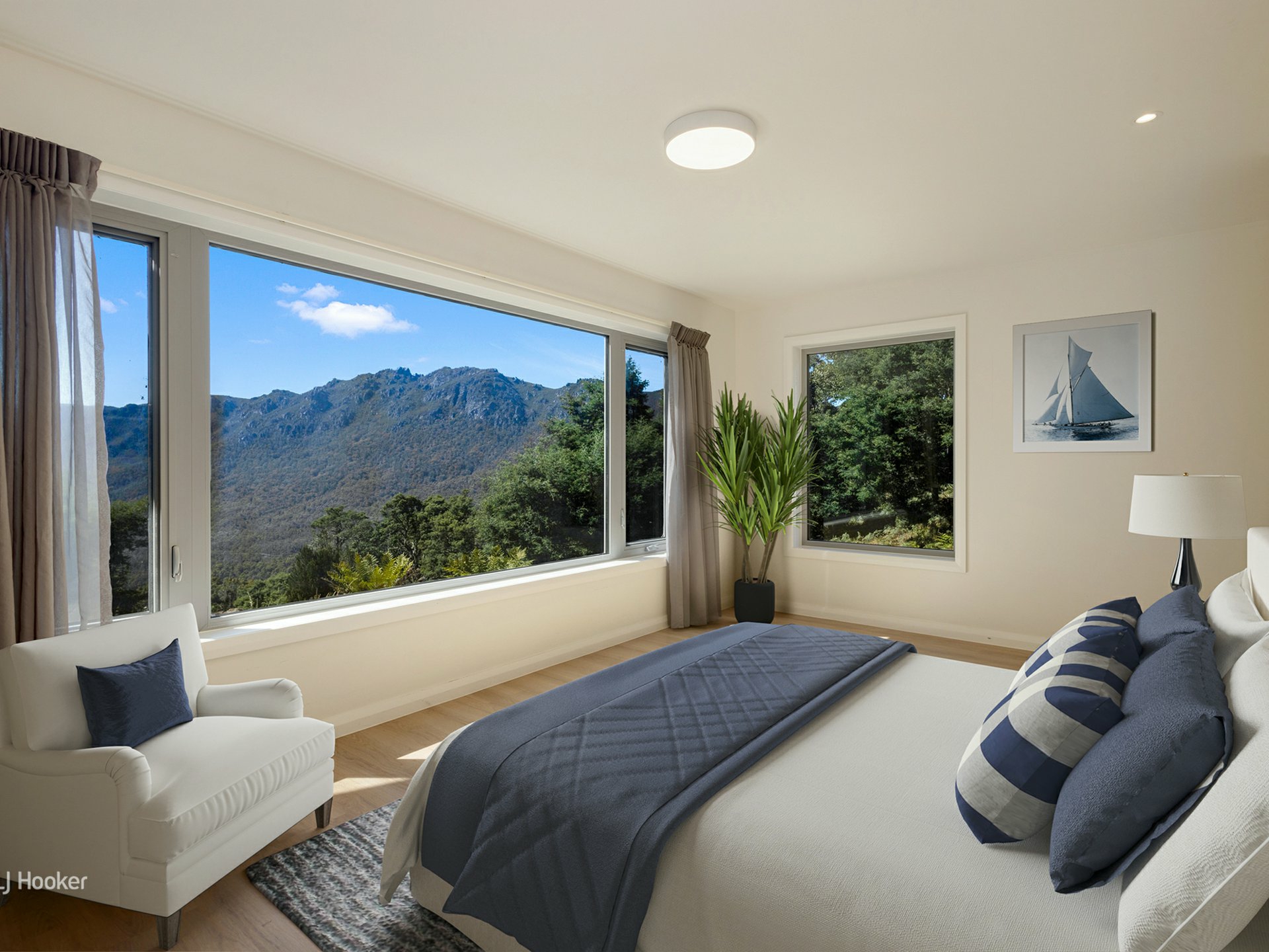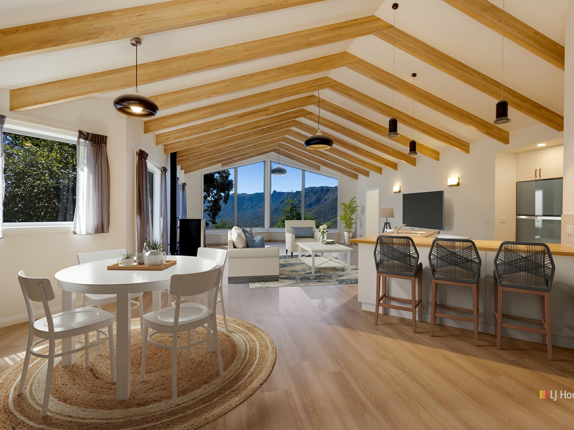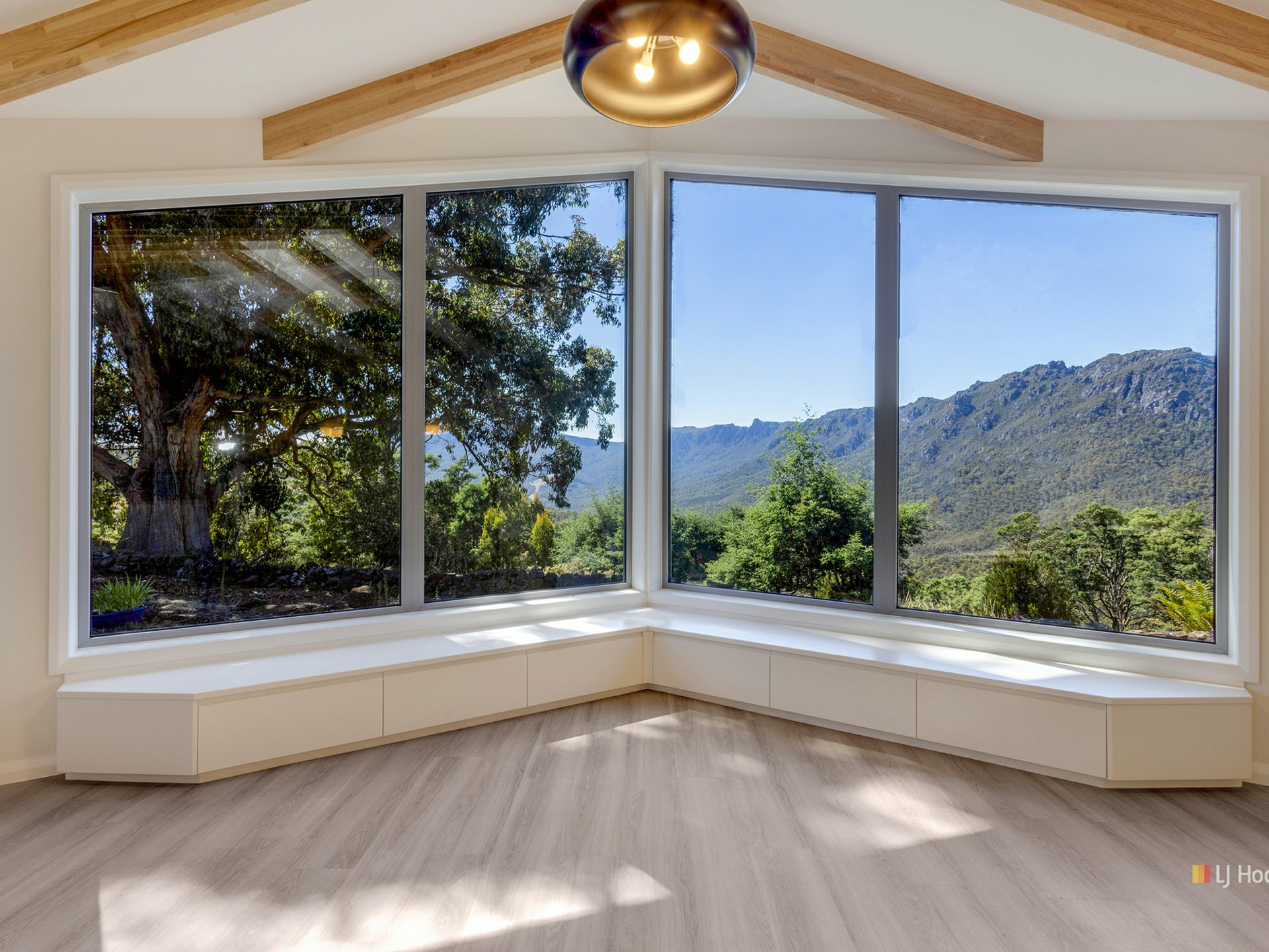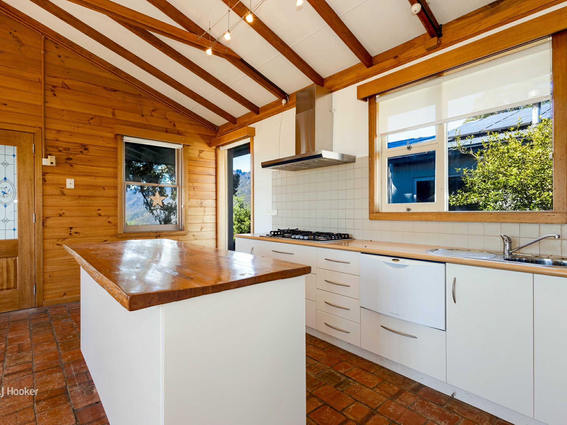 Other features that enhance this property are the exposed wooden beams overhead, a pellet fireplace, underfloor heating, European made triple glazed windows, a solar power system with battery back-up, natural light and a magnificently framed panoramic view of the surrounding Mt Roland, Mt Van Dyke & Mt Claude landscape.