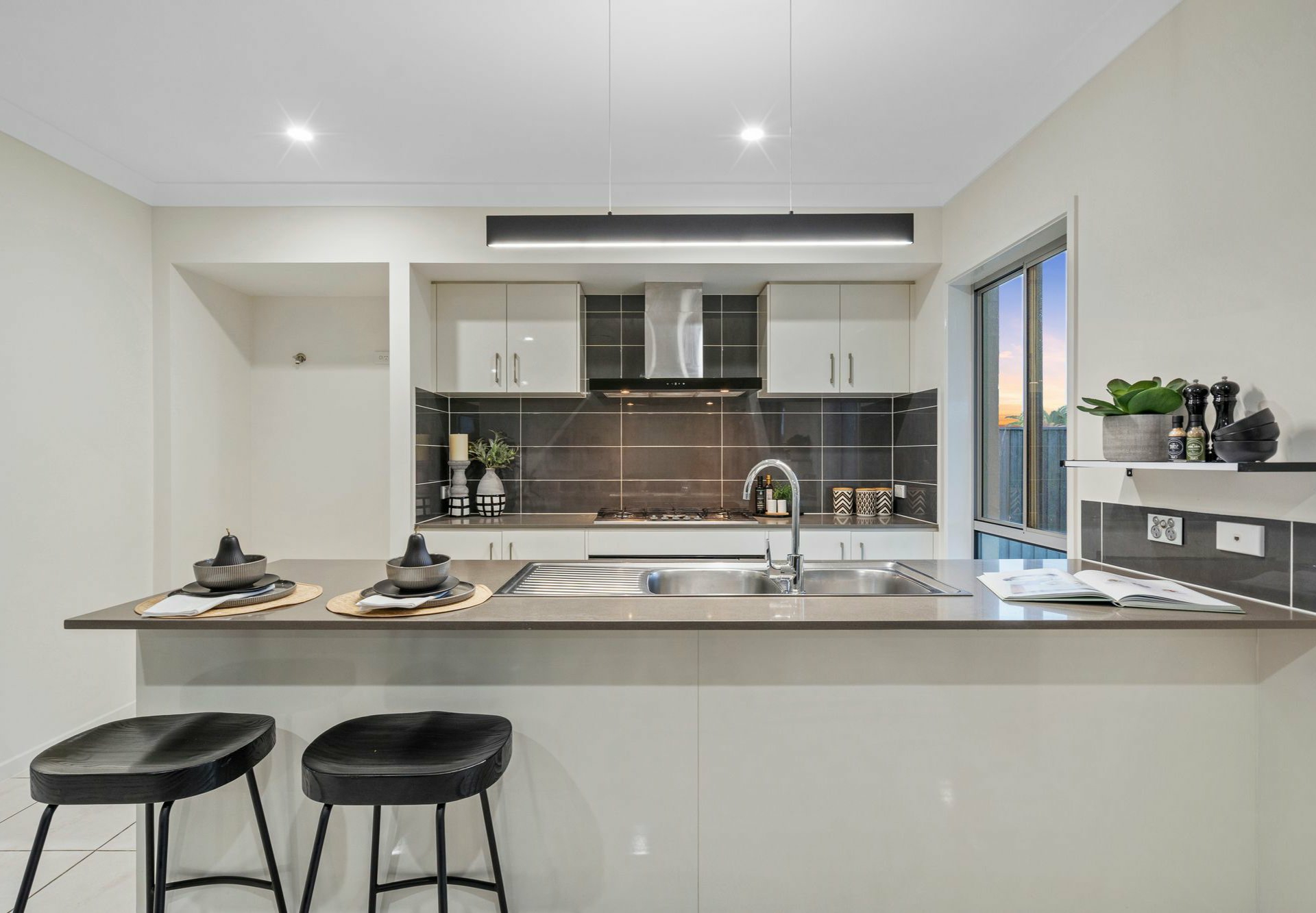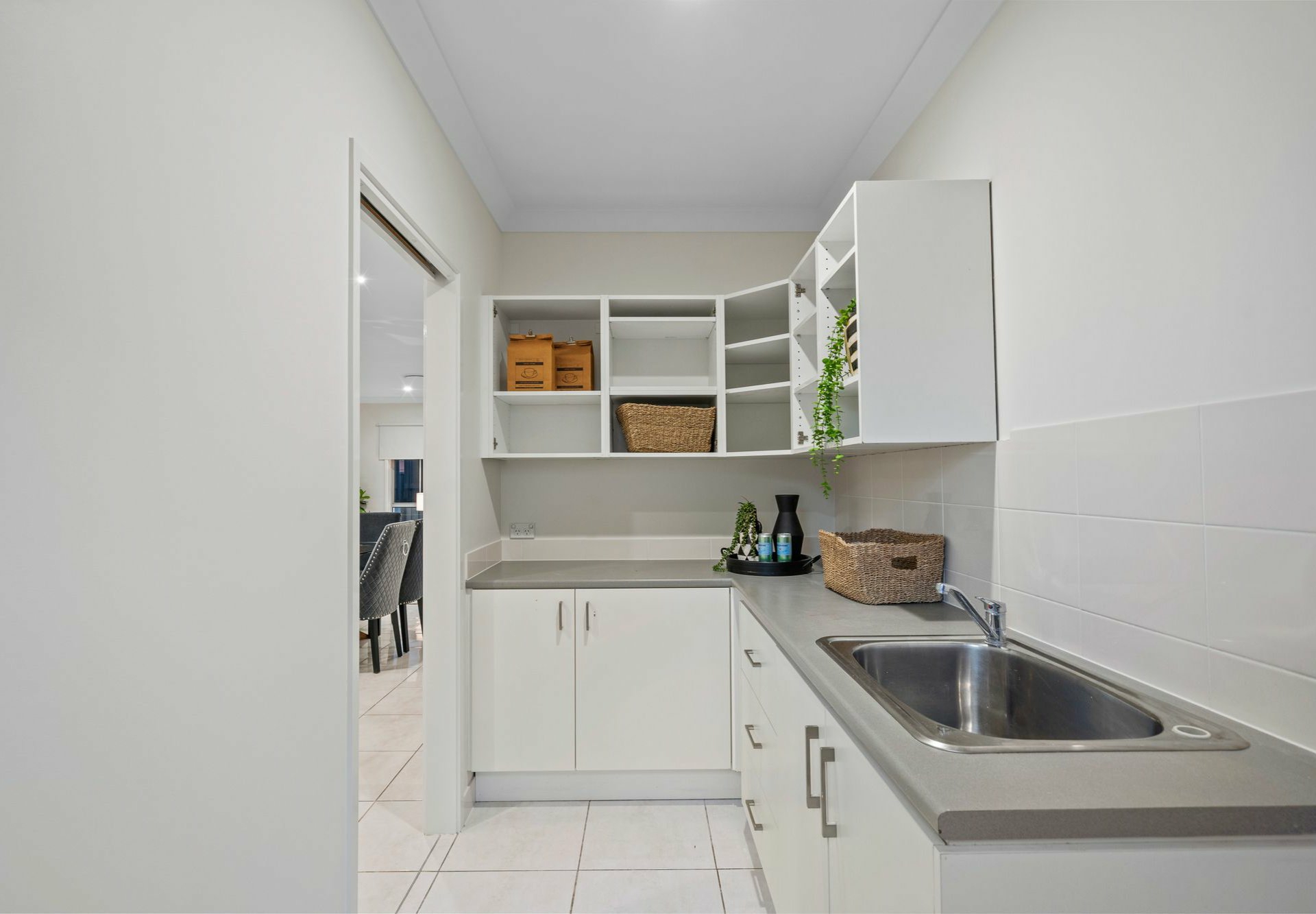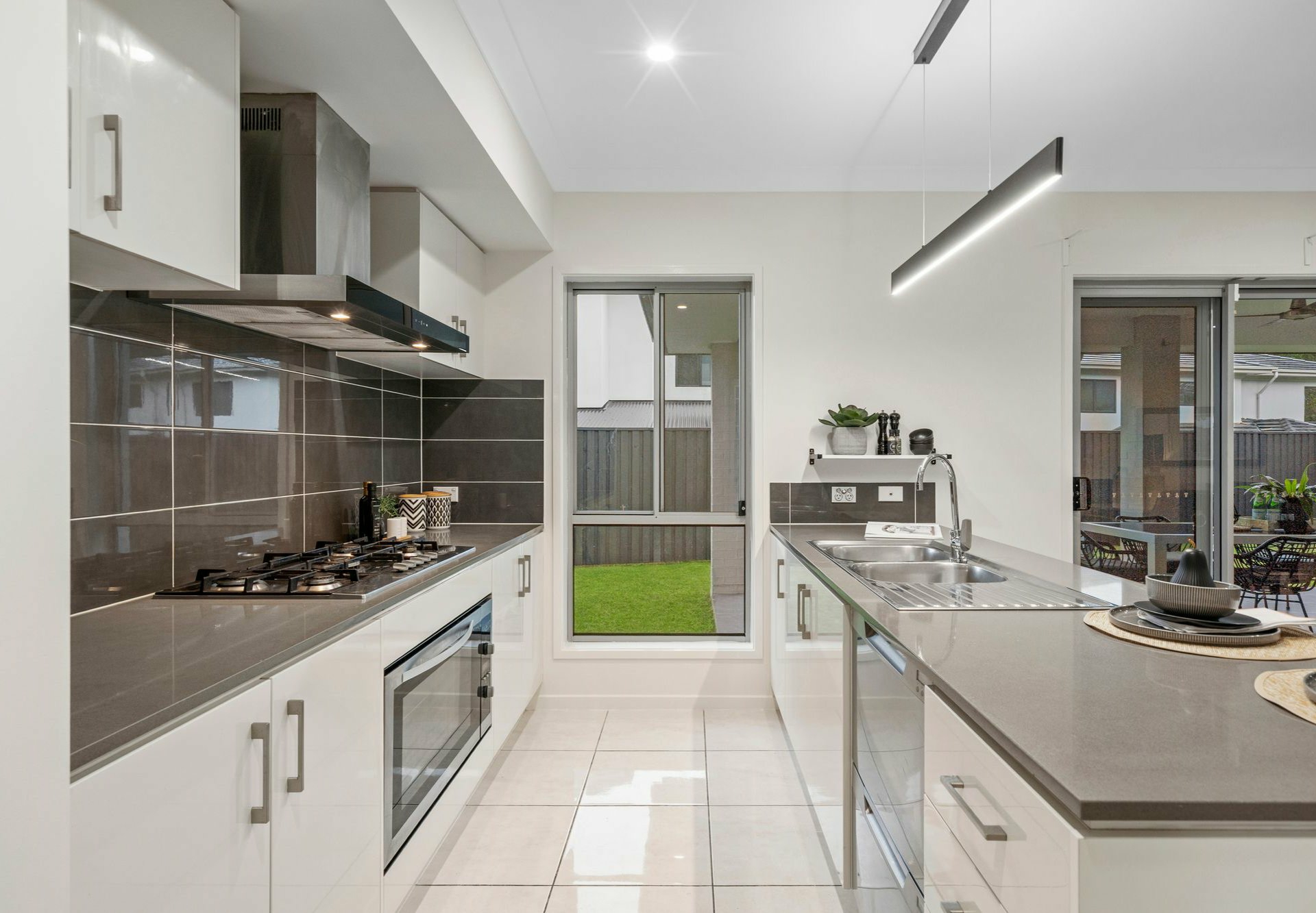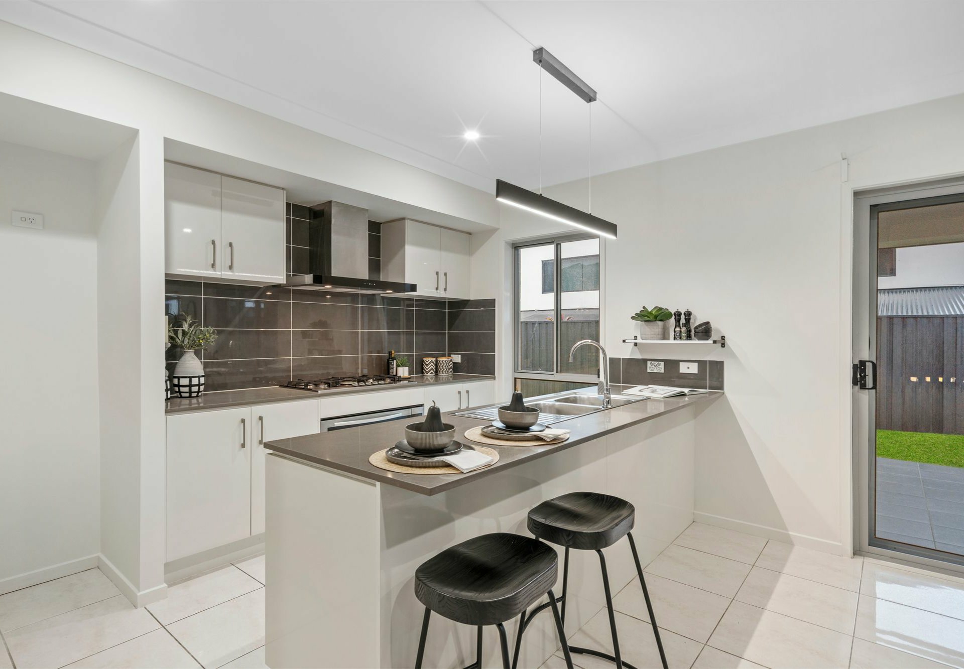 The gourmet kitchen is a chef's delight, boasting sleek stone benchtops, a dishwasher, and an adjoining functional butler's style laundry setup. With large sliding glass doors, this area flows seamlessly into the outdoor covered entertaining area, overlooking a low-maintenance, fully fenced yard.