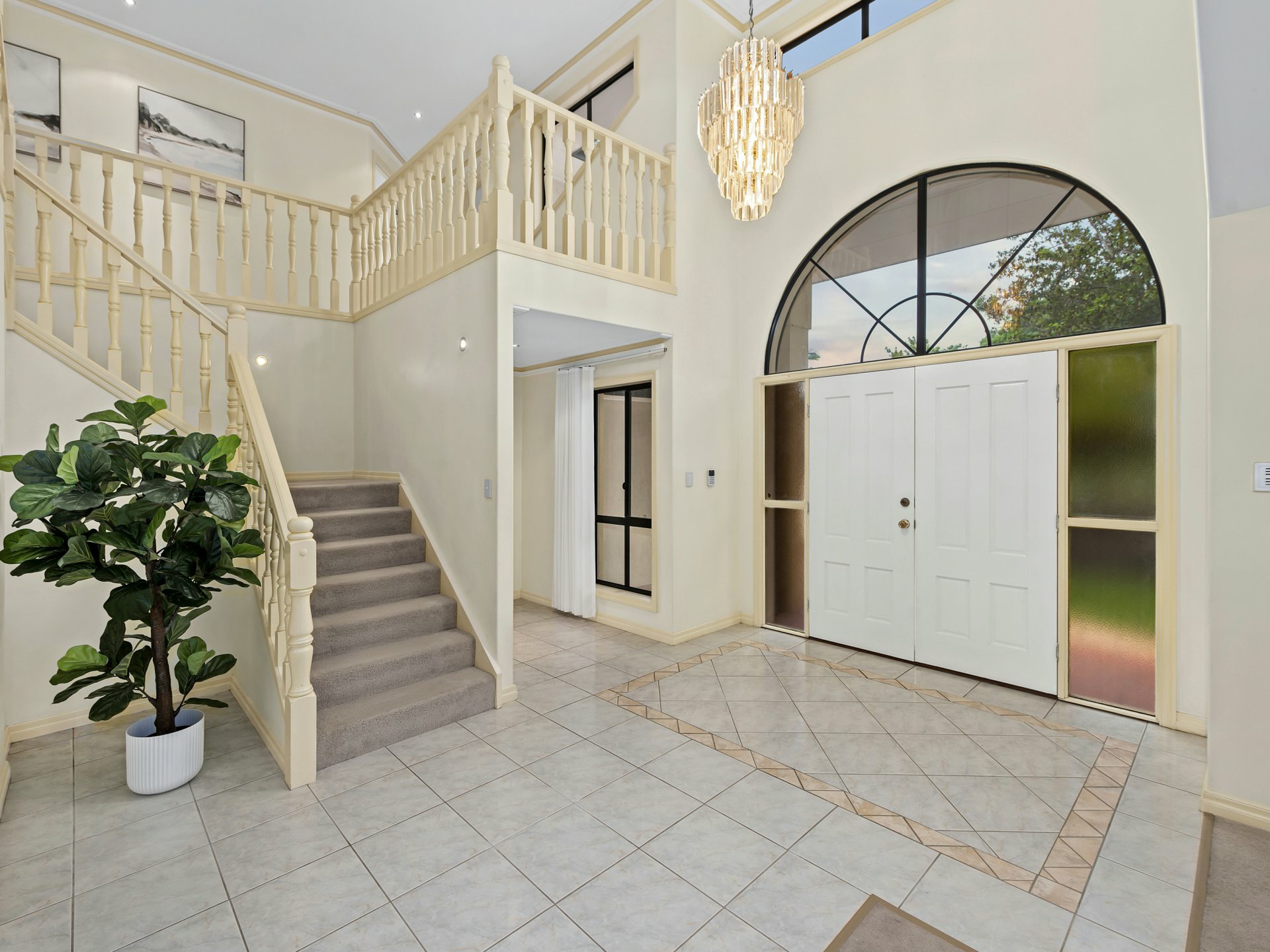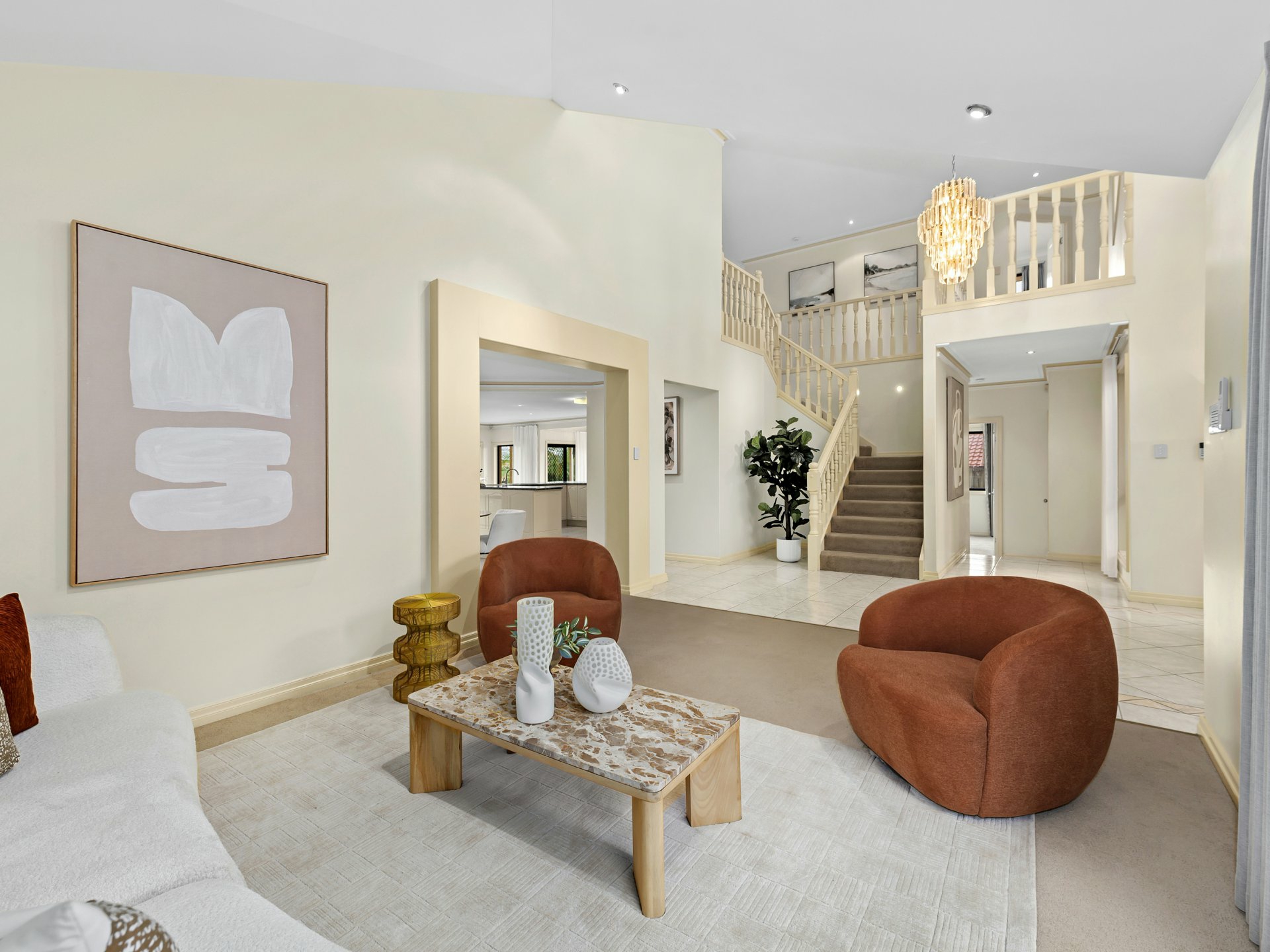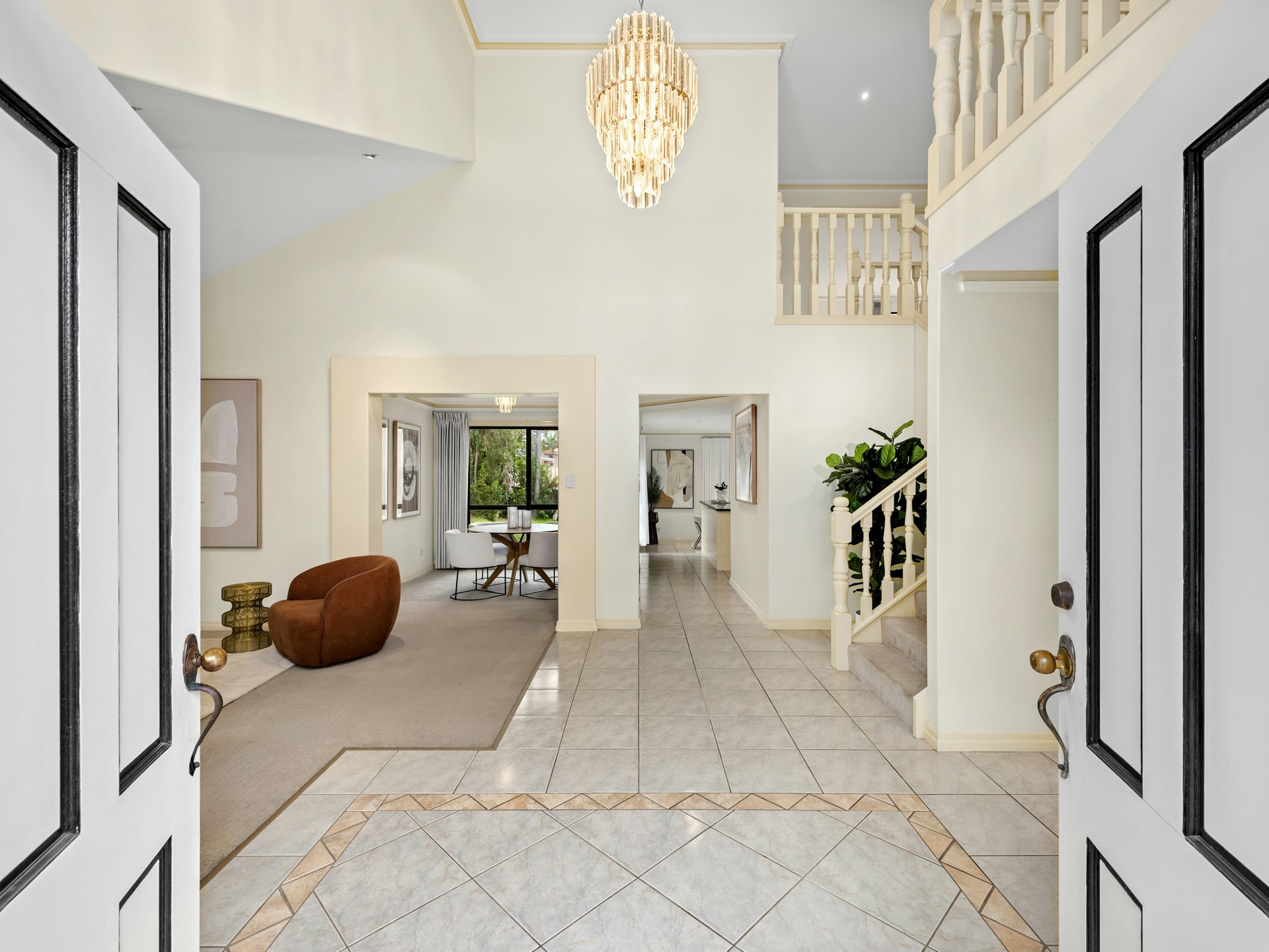 Upon entry, a striking double-height foyer rises beneath an elegant chandelier, while a sweeping staircase and upper gallery create a dramatic architectural centrepiece. Bathed in natural light from oversized windows, the entry flows effortlessly into the home's refined formal lounge - an inviting space for quiet conversation or elegant entertaining.
