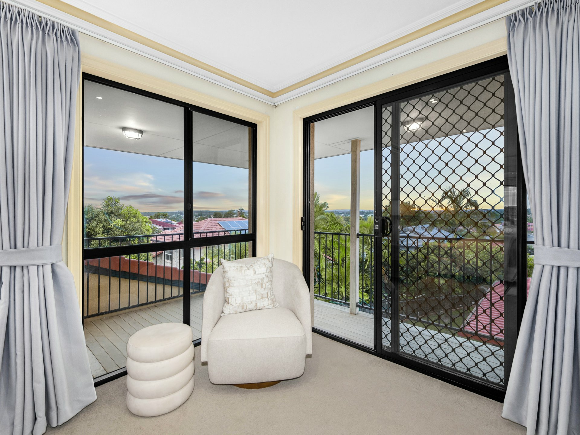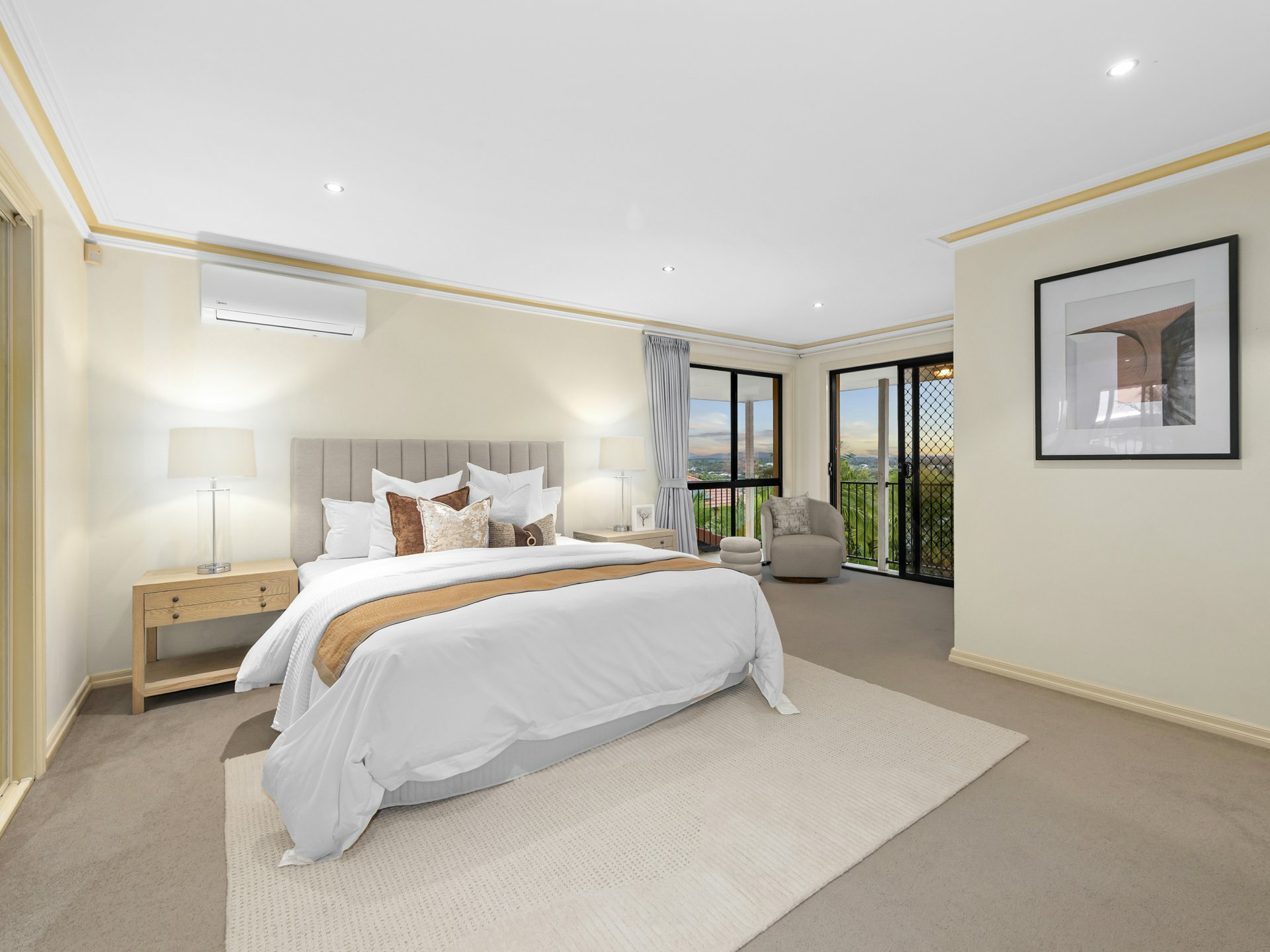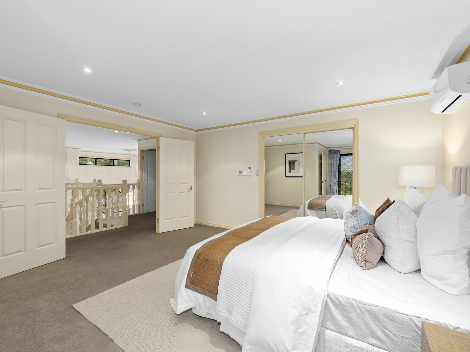 Upstairs, the accommodation wing offers exceptional comfort and space. The master suite opens to a private balcony where elevated district views stretch across the treetops and rooftops beyond. Complete with a walk-in robe and spa ensuite, it offers a peaceful sanctuary at the end of the day.