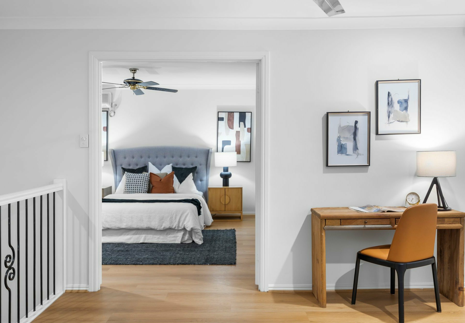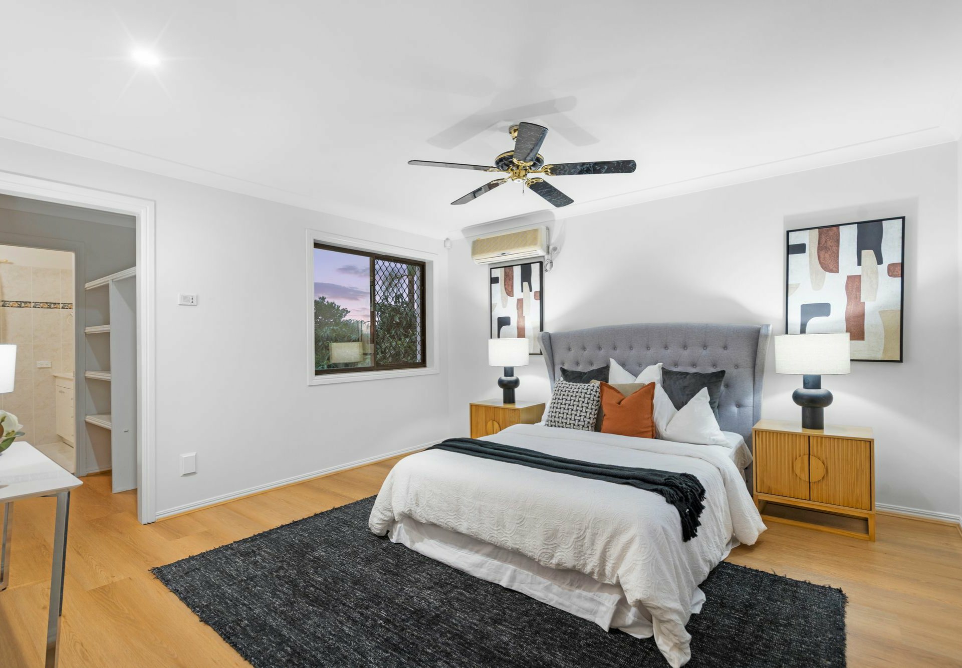 - The master bedroom upstairs is a true retreat with a walk-in robe, private ensuite, air conditioning and ceiling fan.