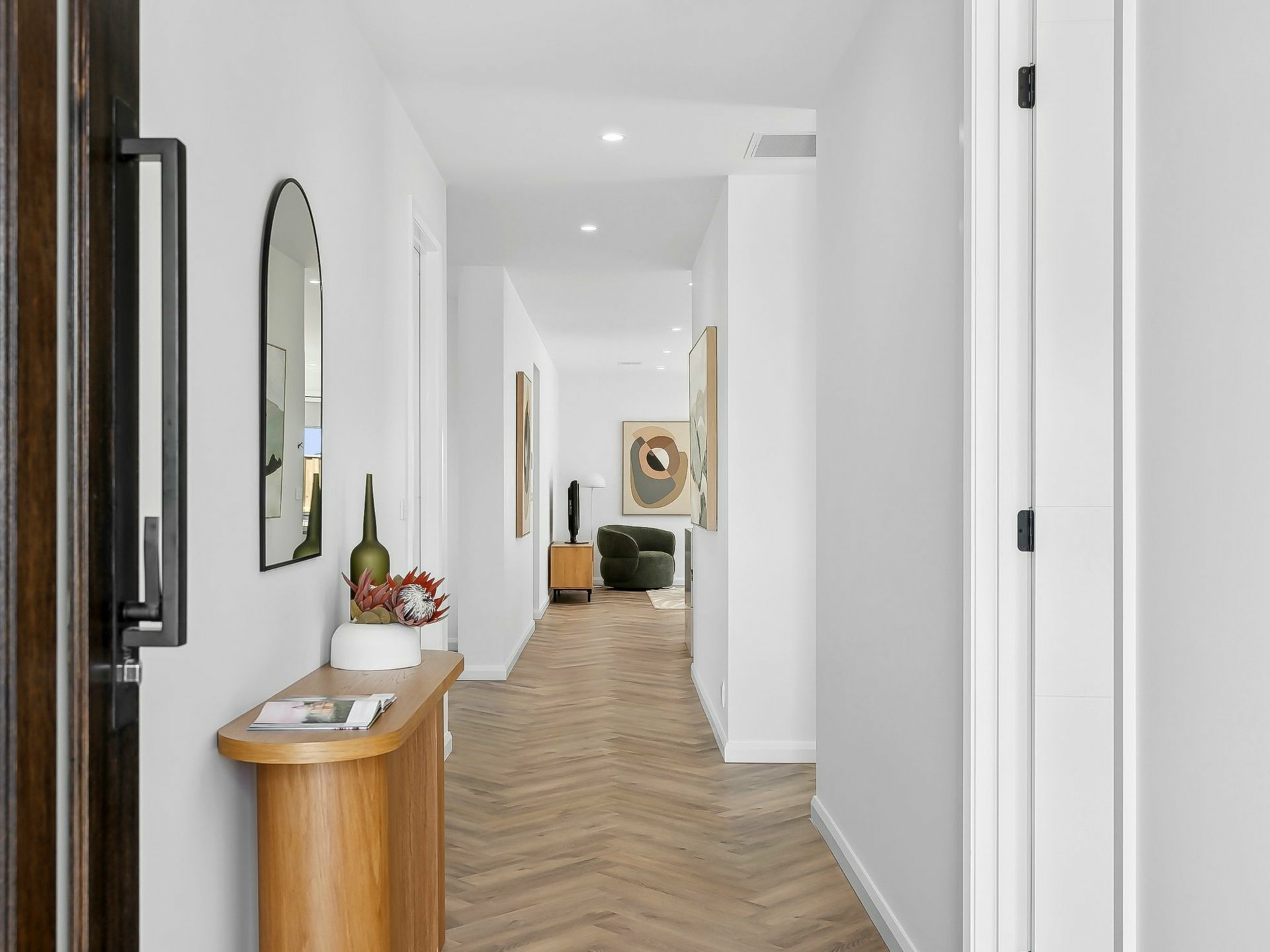 From the moment you arrive, the home impresses with its modern facade and wide entry door, leading into a beautifully styled interior featuring herringbone flooring throughout. Designed for year-round comfort, the home includes refrigerated heating and cooling with multiple zones, ensuring a perfectly tempered environment no matter the season.