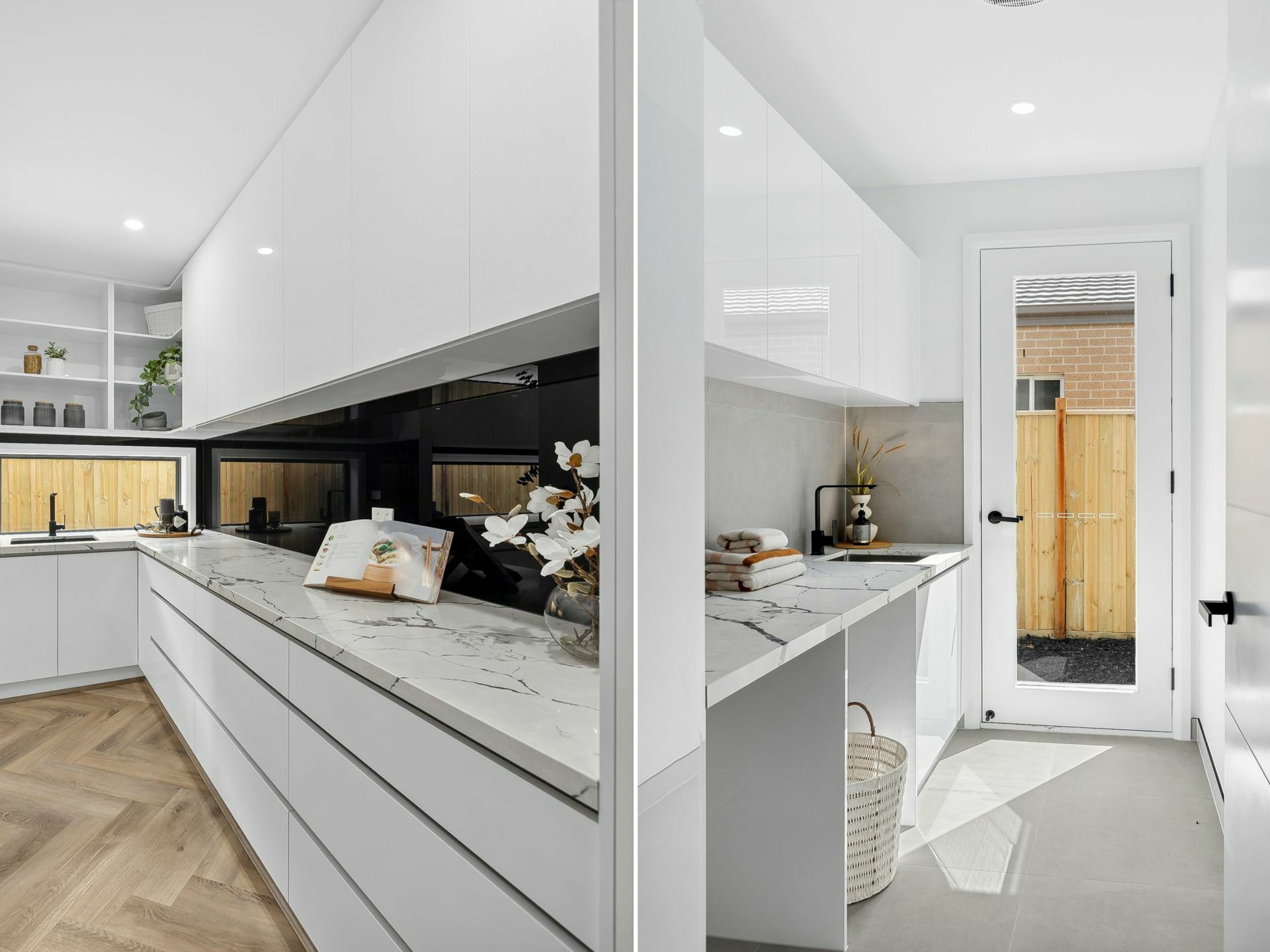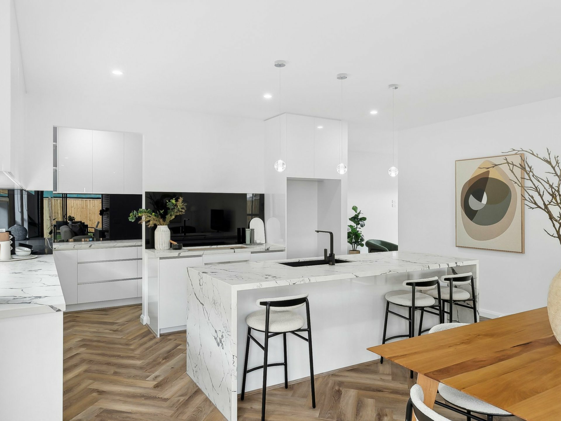 The chef’s kitchen is a dream come true, showcasing stone benchtops with waterfall edges, gas cooktop, plentiful storage, and a walk-in pantry. A large glass splashback window floods the space with natural light, adding a touch of luxury and sophistication.