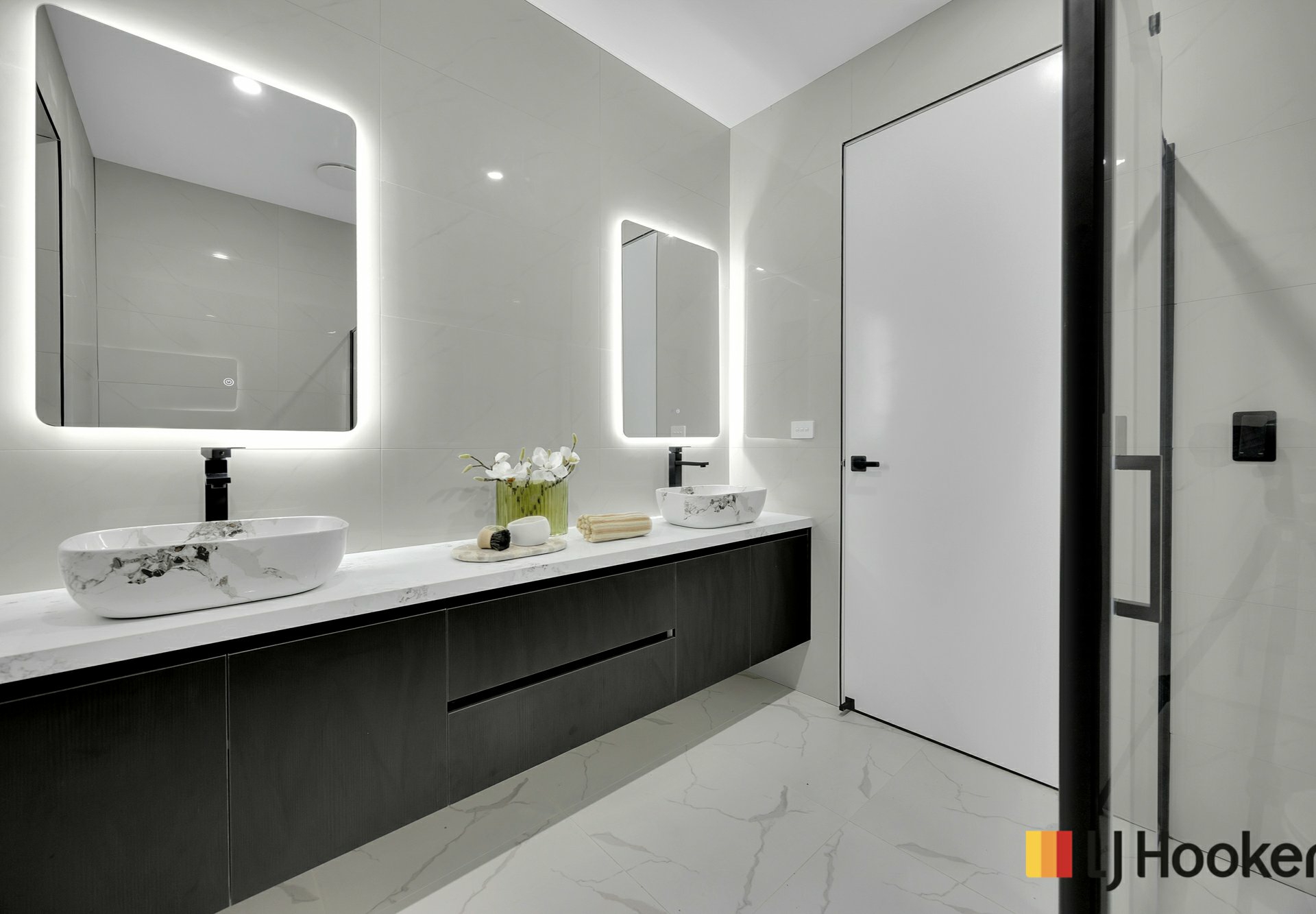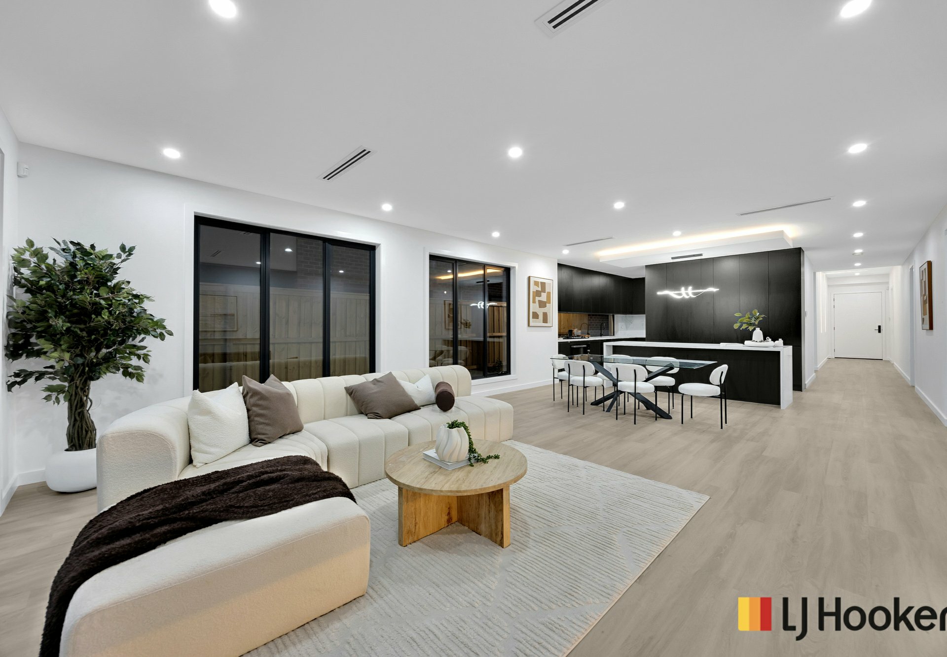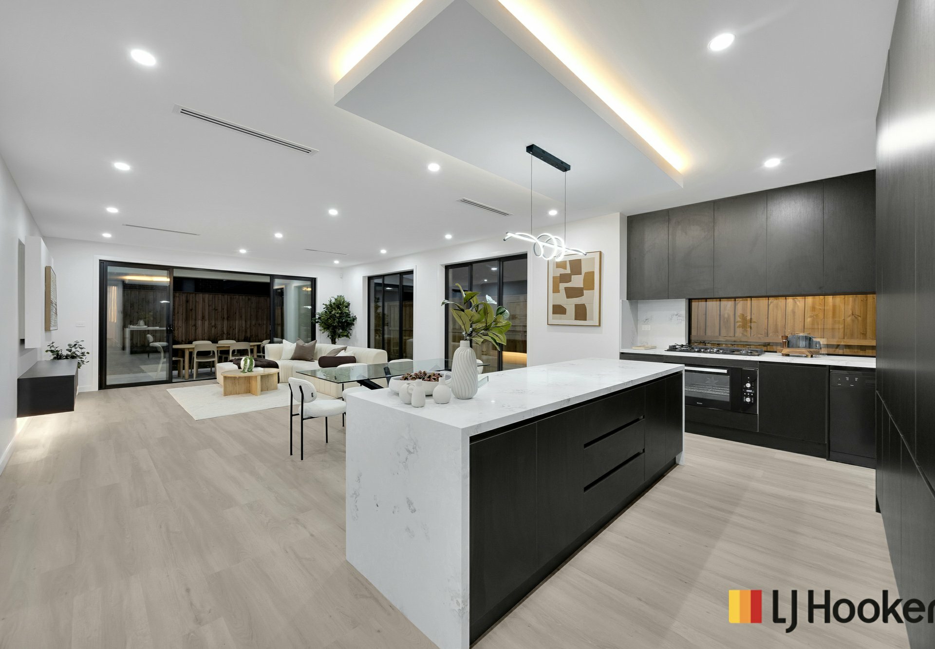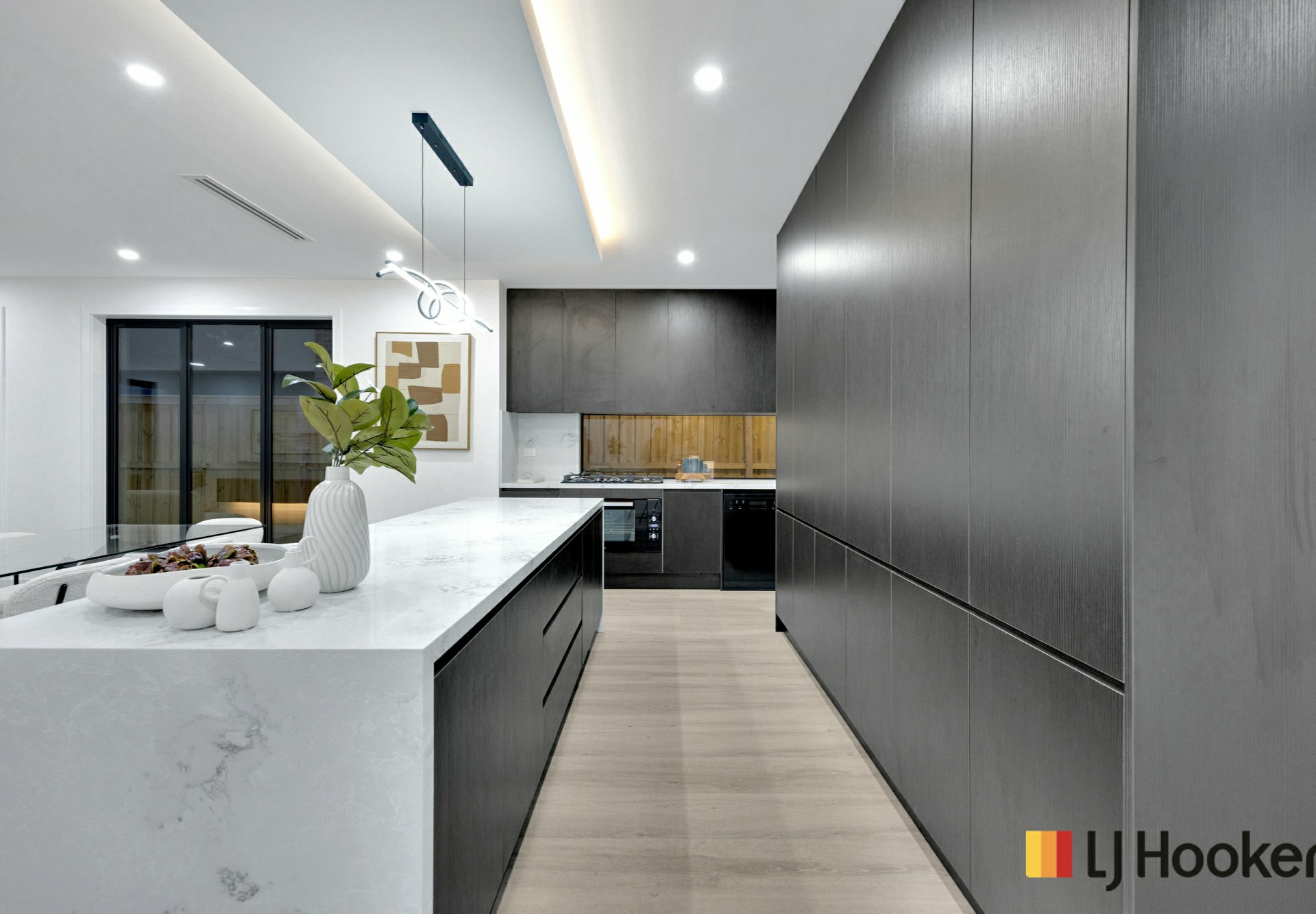 The home comprises four generously sized bedrooms, including two master suites, each with its own en-suite and walk-in robe. The remaining two bedrooms feature built-in robes and are serviced by a luxurious central bathroom, complemented by a separate guest powder room. The open-plan layout seamlessly connects the kitchen, dining, and living areas, creating a warm and inviting space designed to bring families together.