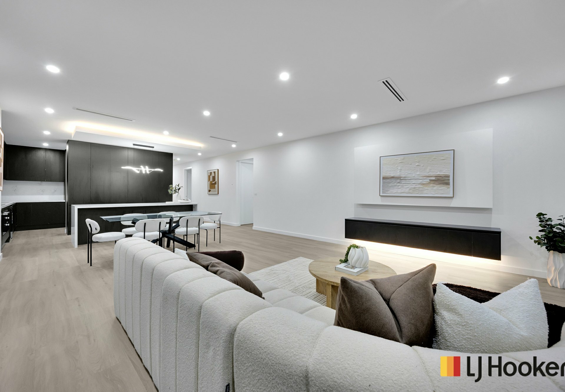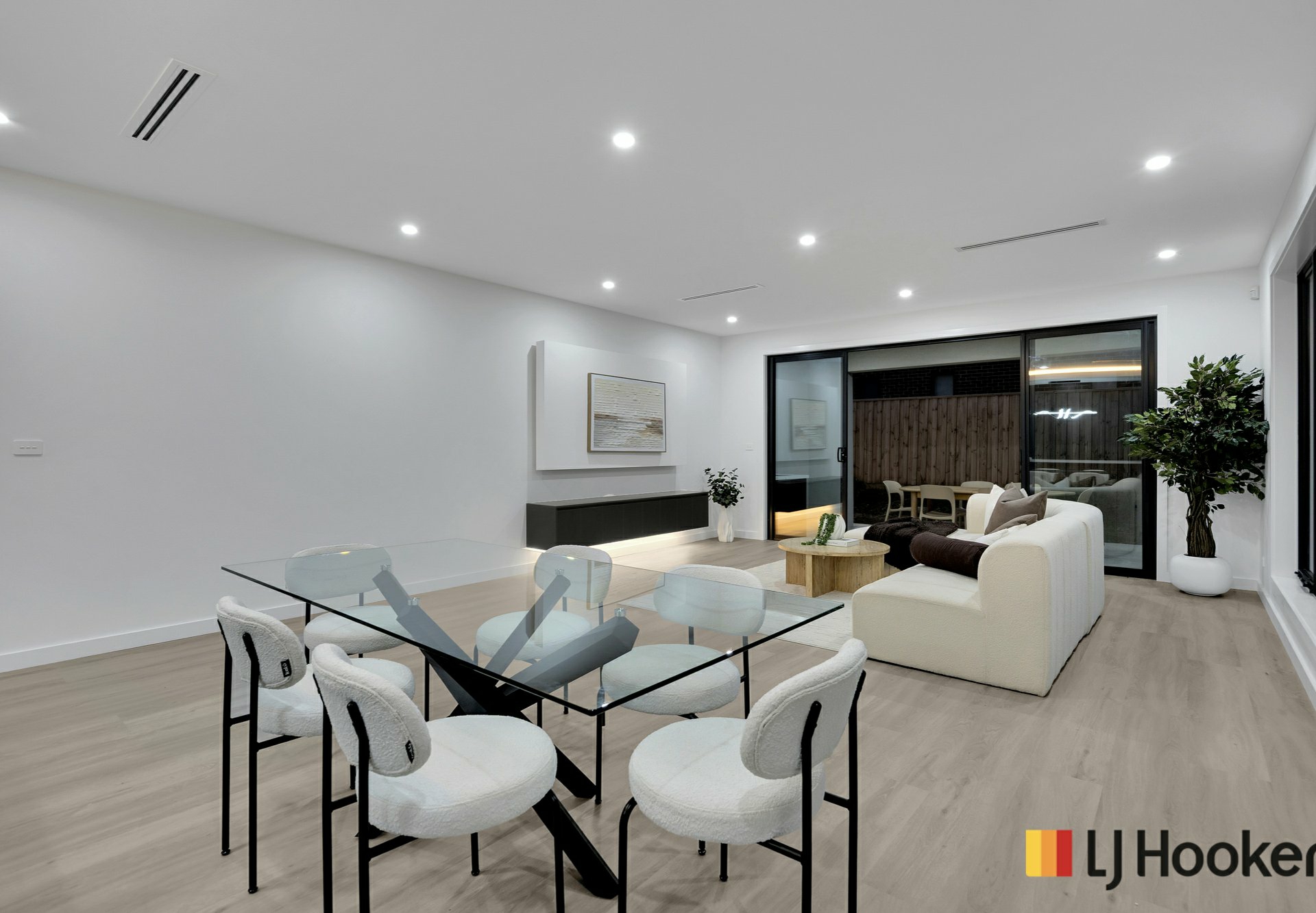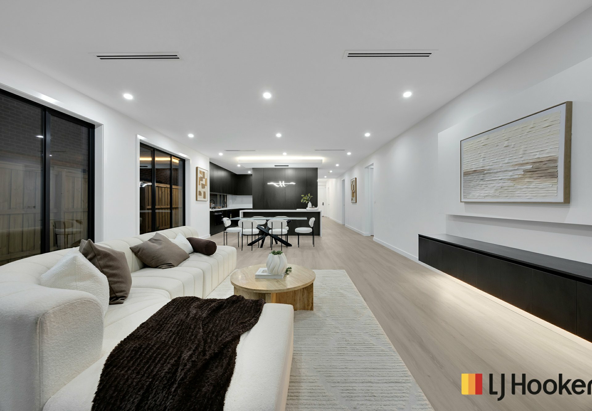 The home comprises four generously sized bedrooms, including two master suites, each with its own en-suite and walk-in robe. The remaining two bedrooms feature built-in robes and are serviced by a luxurious central bathroom, complemented by a separate guest powder room. The open-plan layout seamlessly connects the kitchen, dining, and living areas, creating a warm and inviting space designed to bring families together.