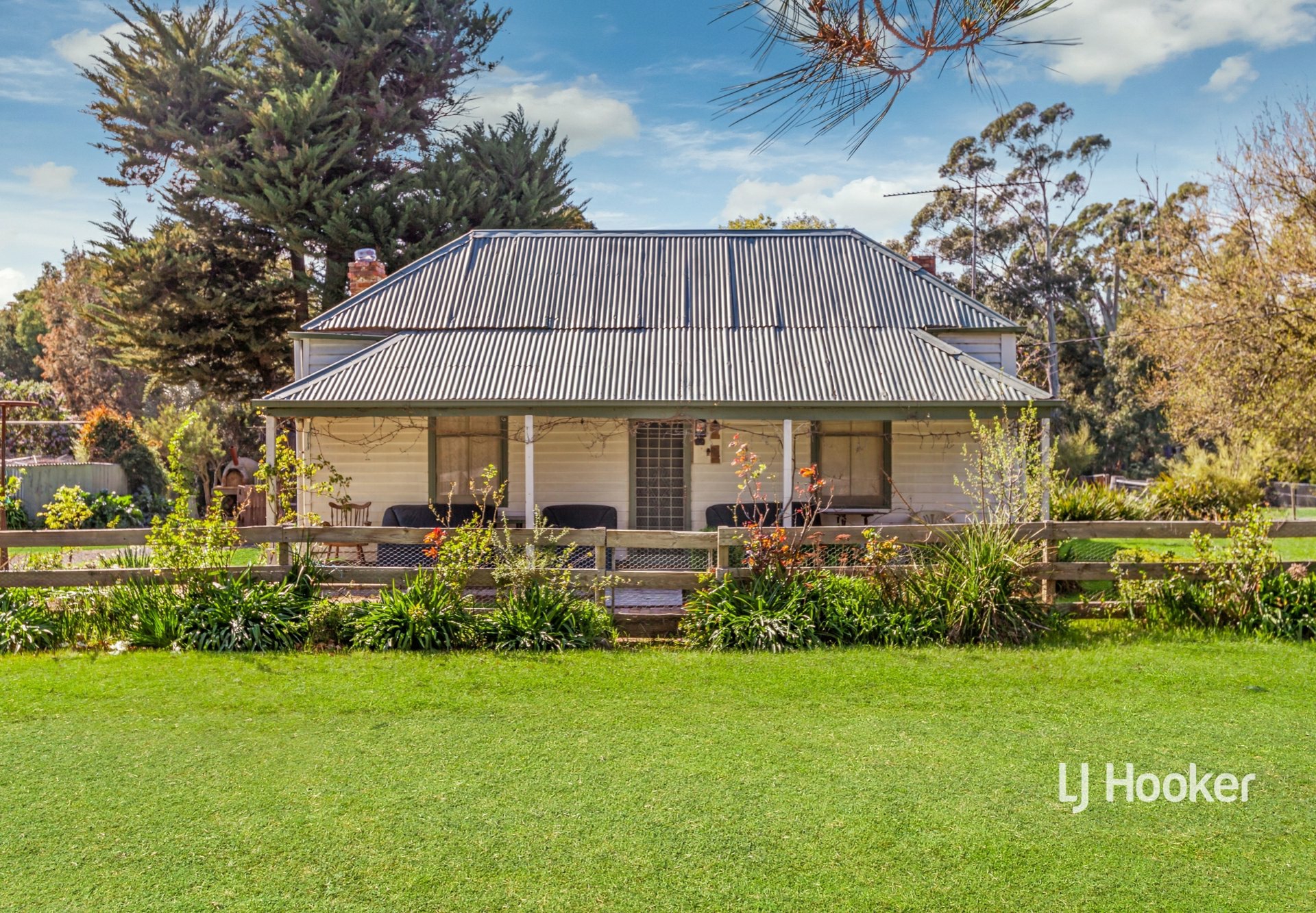 Inside, the home boasts stained floorboards and high ceilings throughout its three bedrooms, evoking a sense of history and character. Recent updates include re-stumping in 2021 and a renovated bathroom, blending comfort with timeless charm. The home also has a separate powder room. The traditional front verandah and rear porch sitting areas offer ideal spots to unwind and soak in the serene surroundings.
