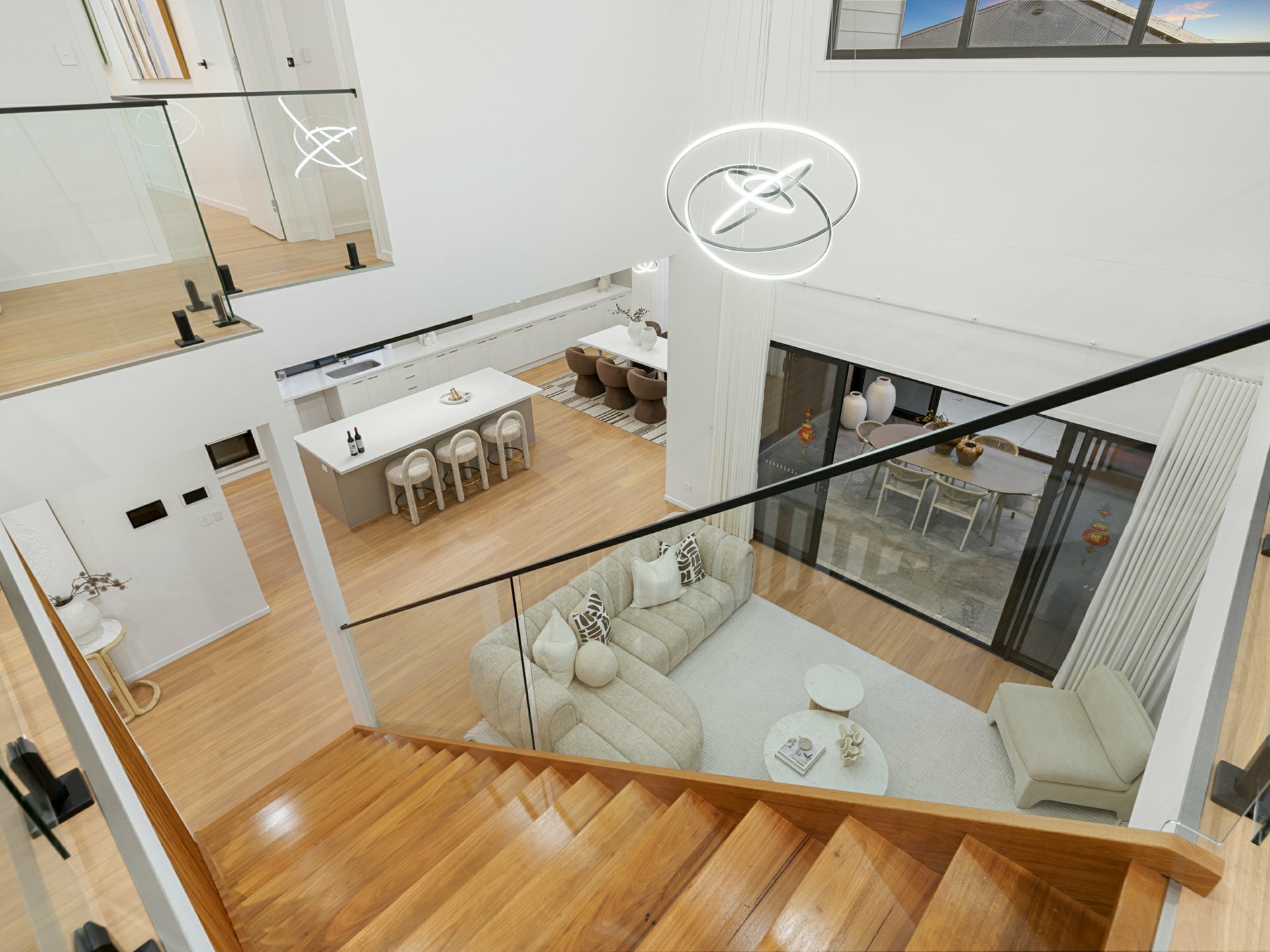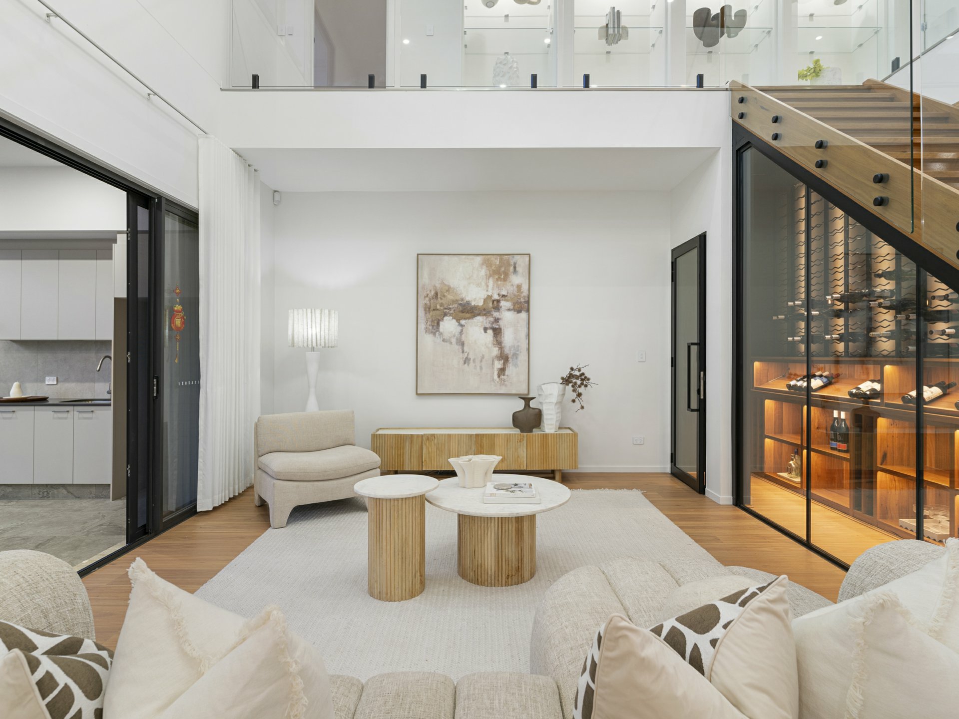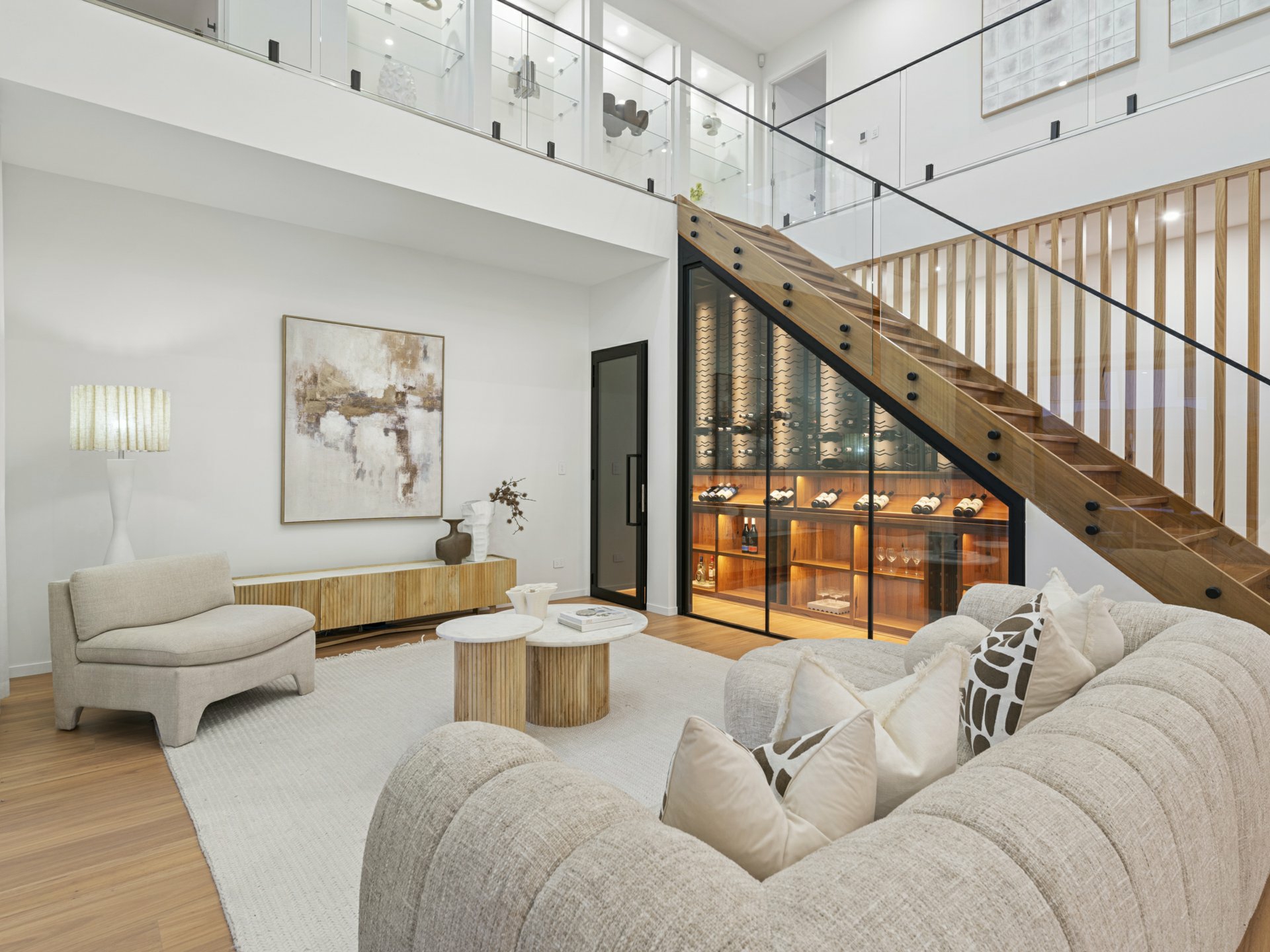 At its heart, the main living zone opens dramatically beneath a soaring double-height void. Full-height glazing draws in natural light, while sheer drapery softens the scale of the space. Sculptural pendant lighting hovers above, and beneath the striking timber staircase sits the illuminated glass wine cellar - a statement feature that anchors the room with quiet confidence.
