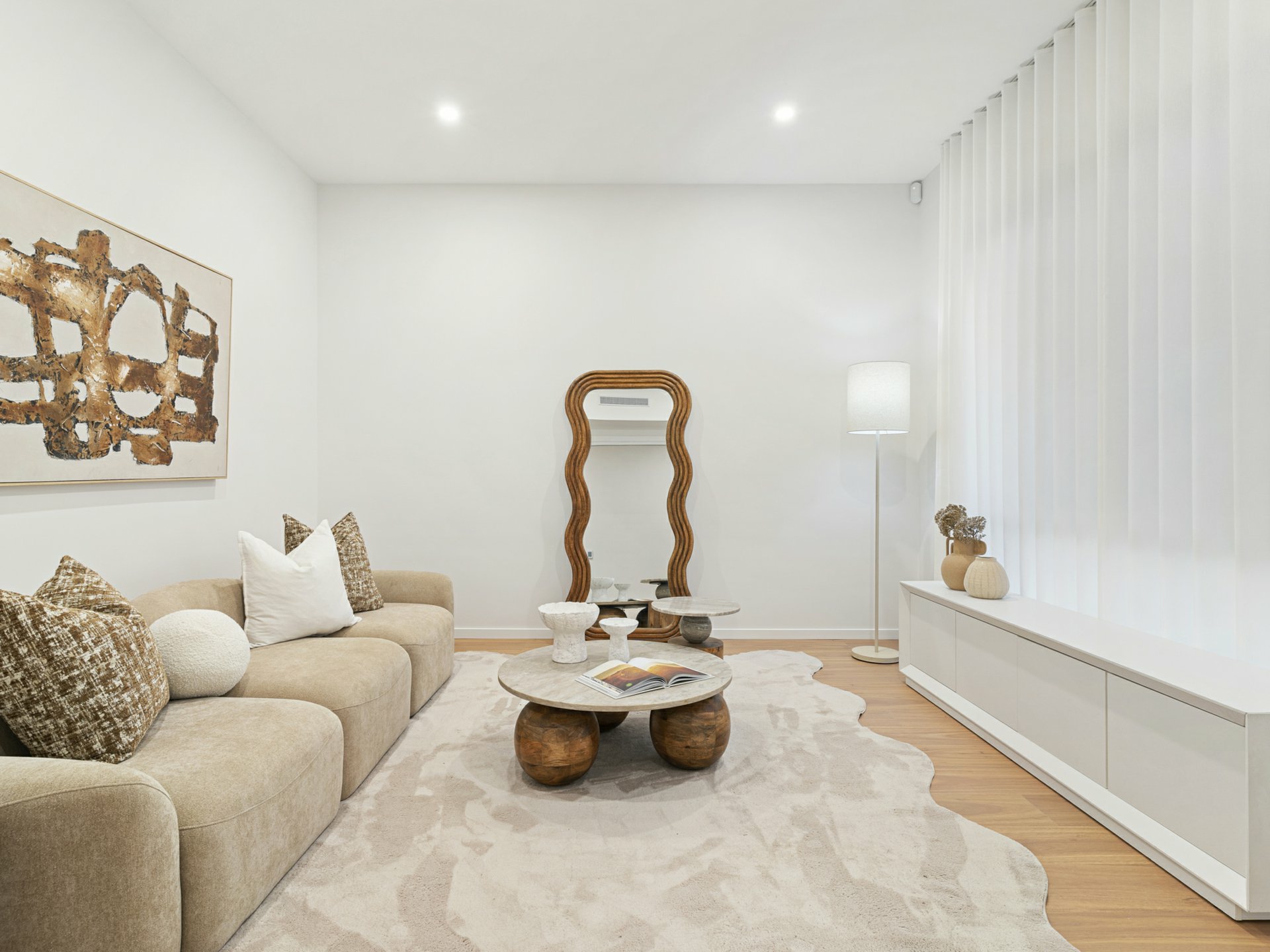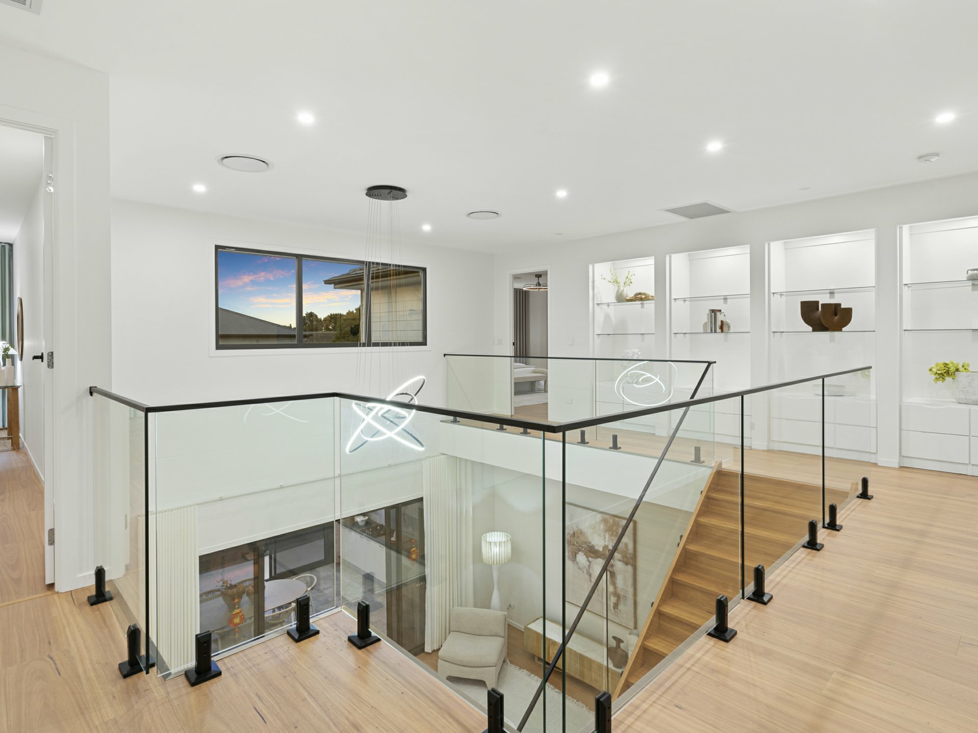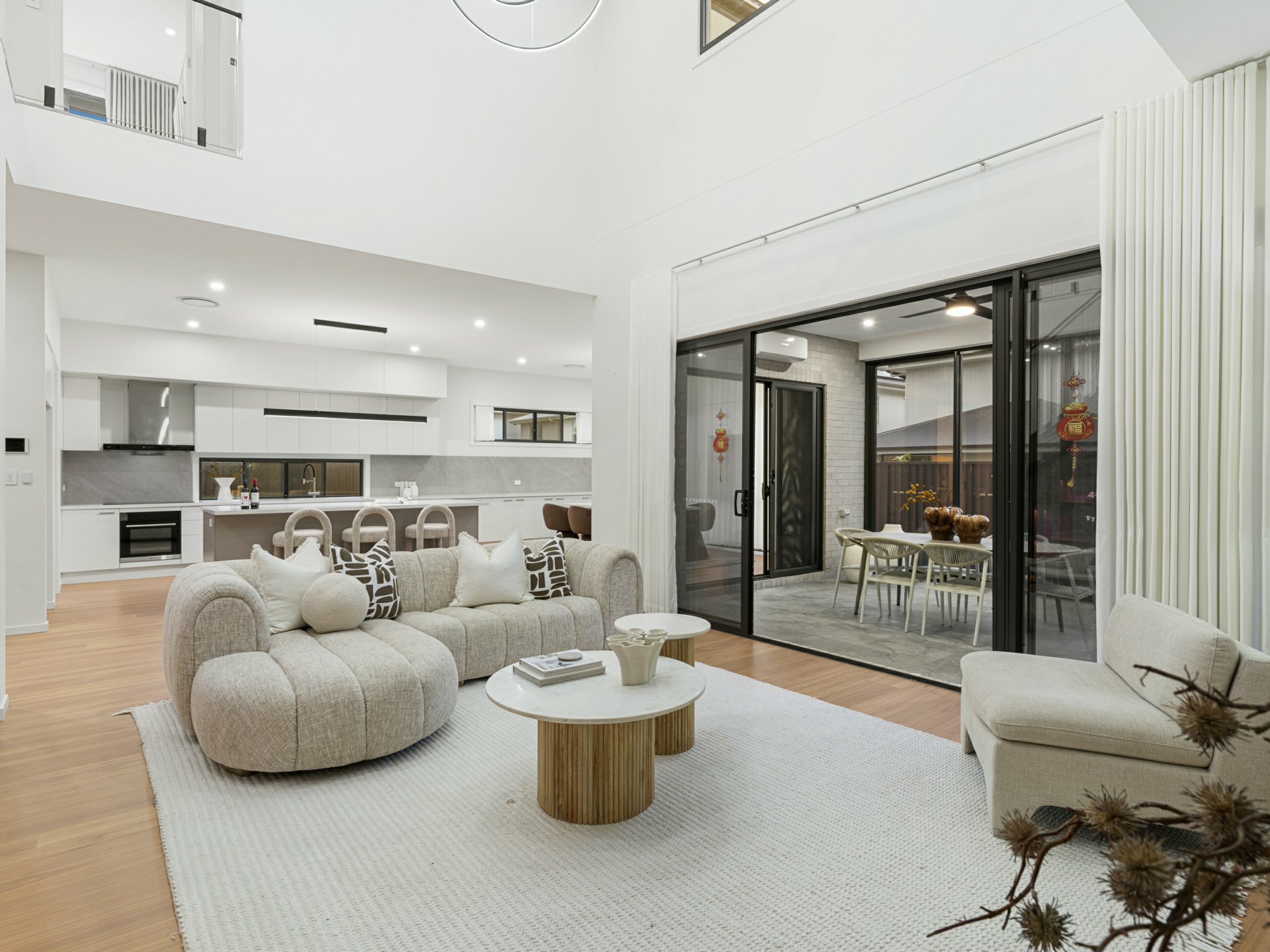 At its heart, the main living zone opens dramatically beneath a soaring double-height void. Full-height glazing draws in natural light, while sheer drapery softens the scale of the space. Sculptural pendant lighting hovers above, and beneath the striking timber staircase sits the illuminated glass wine cellar - a statement feature that anchors the room with quiet confidence.