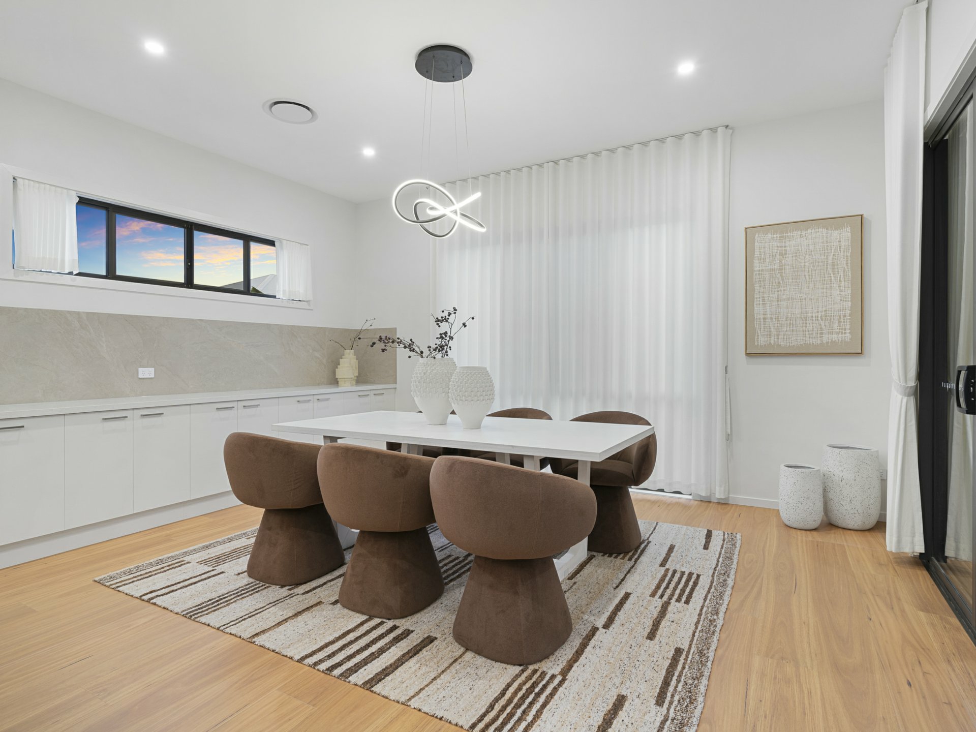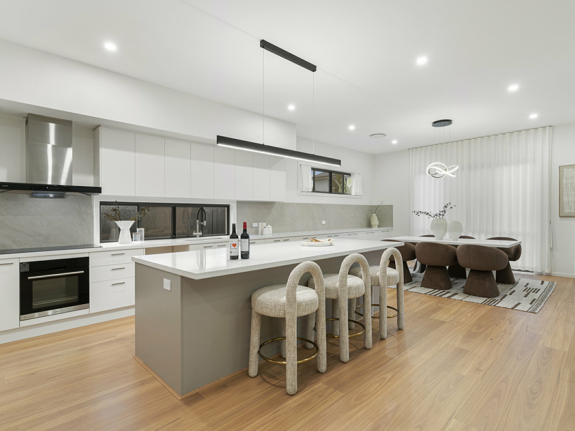 Built with a steel frame and brick exterior, Hebel flooring and an upgraded concrete tile roof, the home combines durability with acoustic comfort. 3-metre ceilings downstairs and 2.7-metre ceilings upstairs, paired with oversized doors, square-set cornices and a solid timber entrance door, create an immediate sense of openness and architectural presence from the moment you enter.