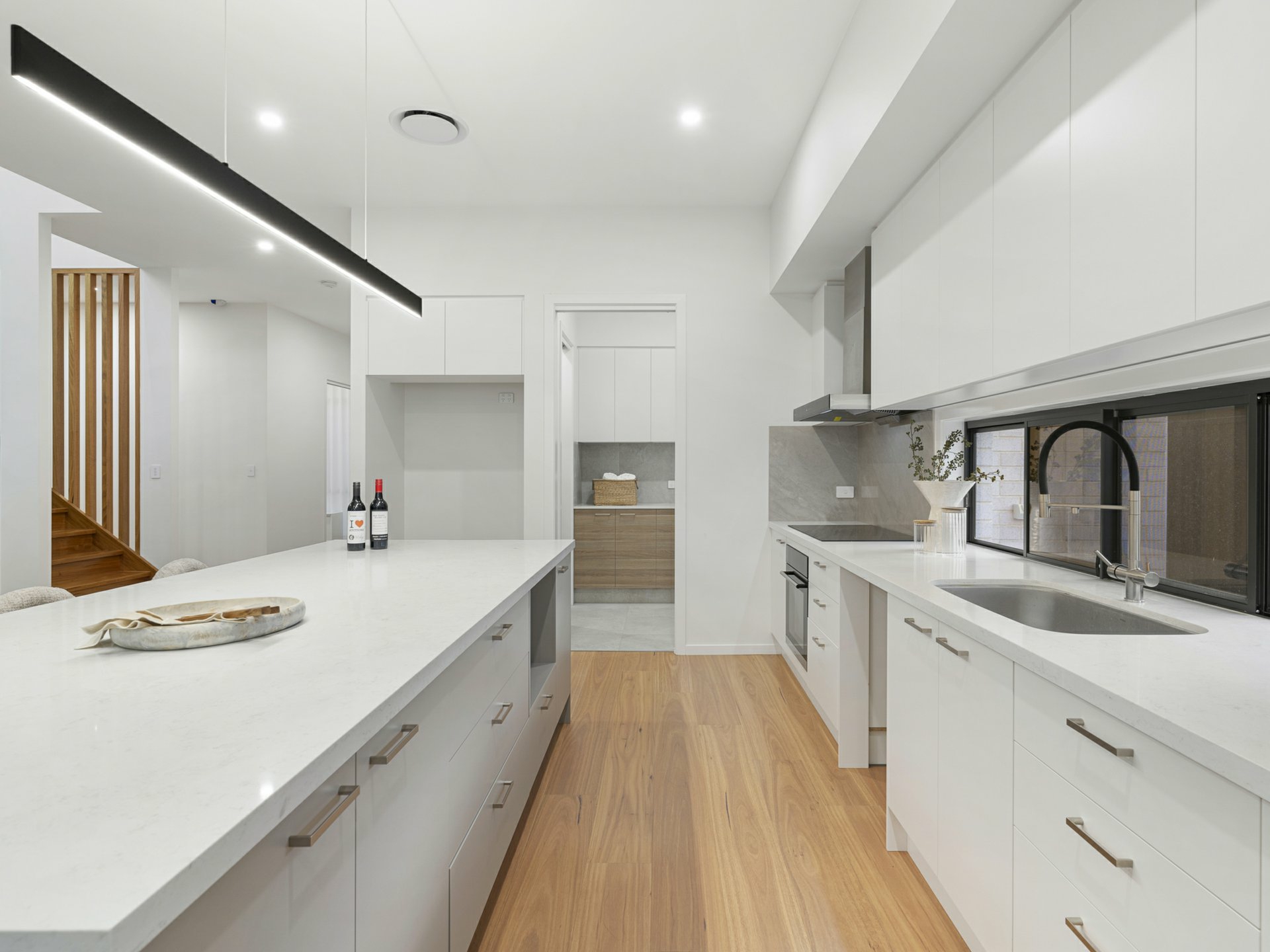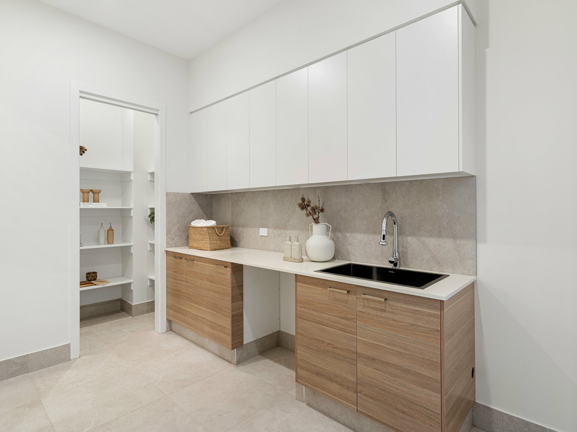 A secondary preparation zone inside the adjoining laundry adds additional storage and functionality with a walk-in linen and pantry storage for ultimate organisation.