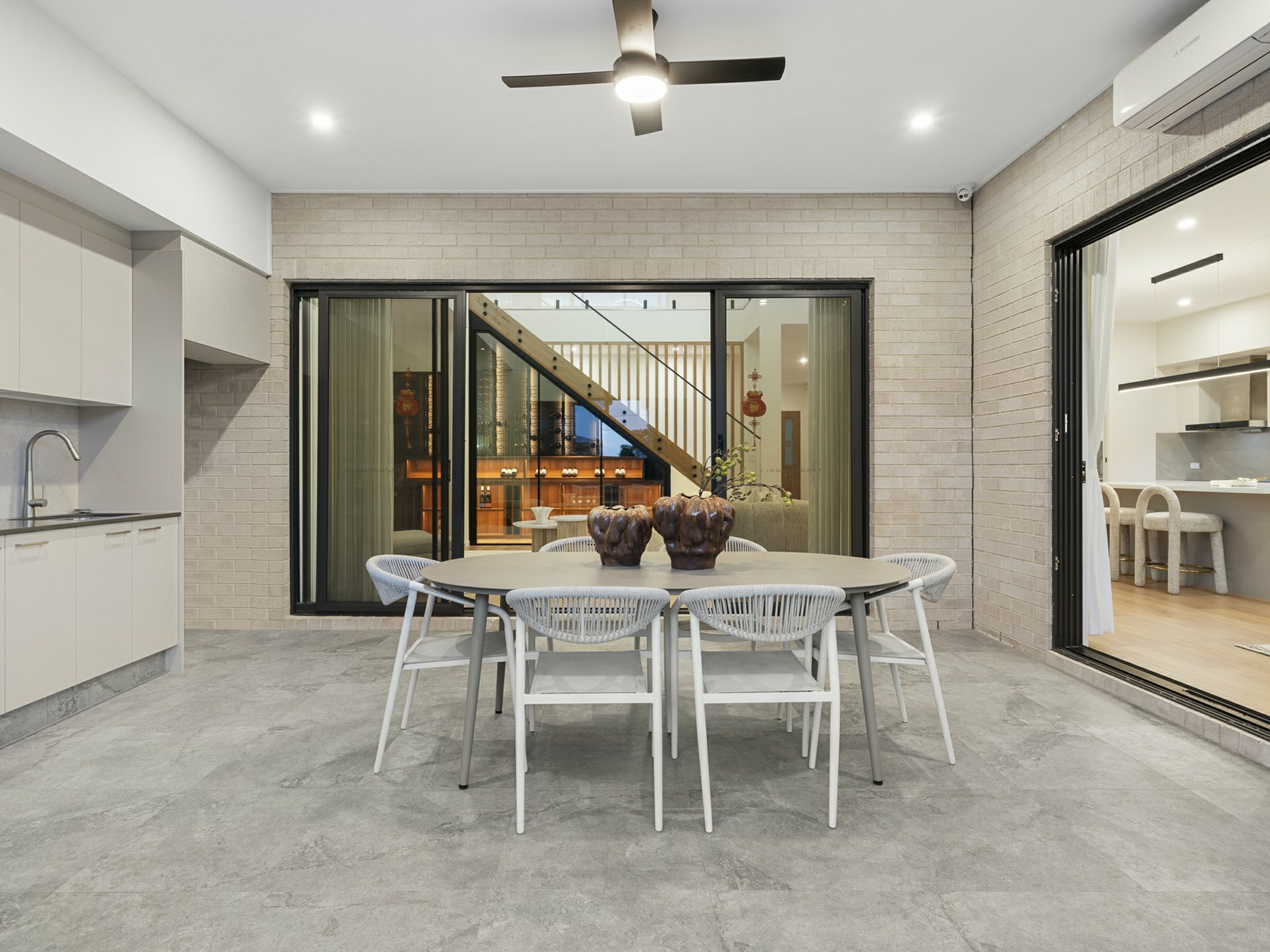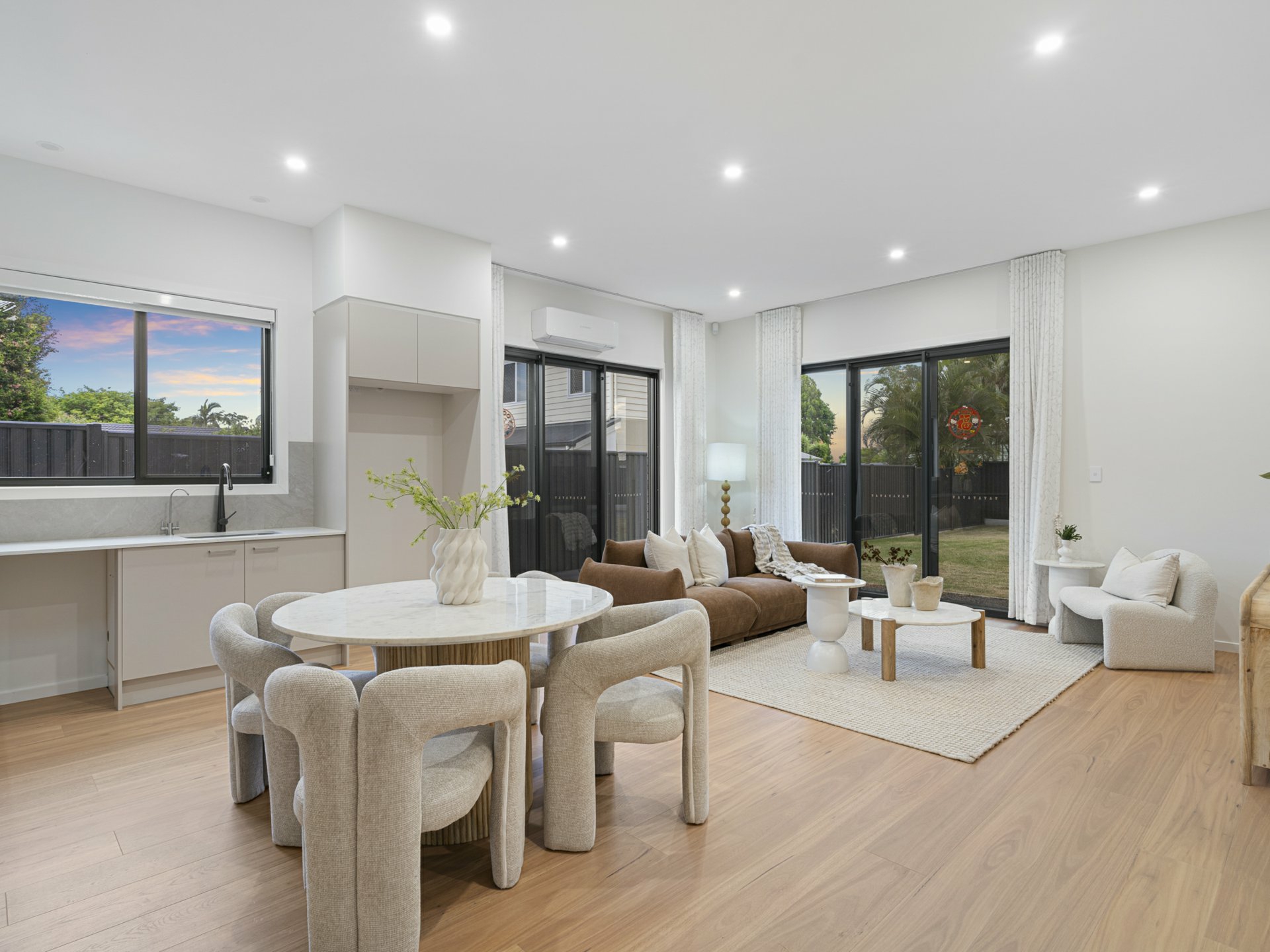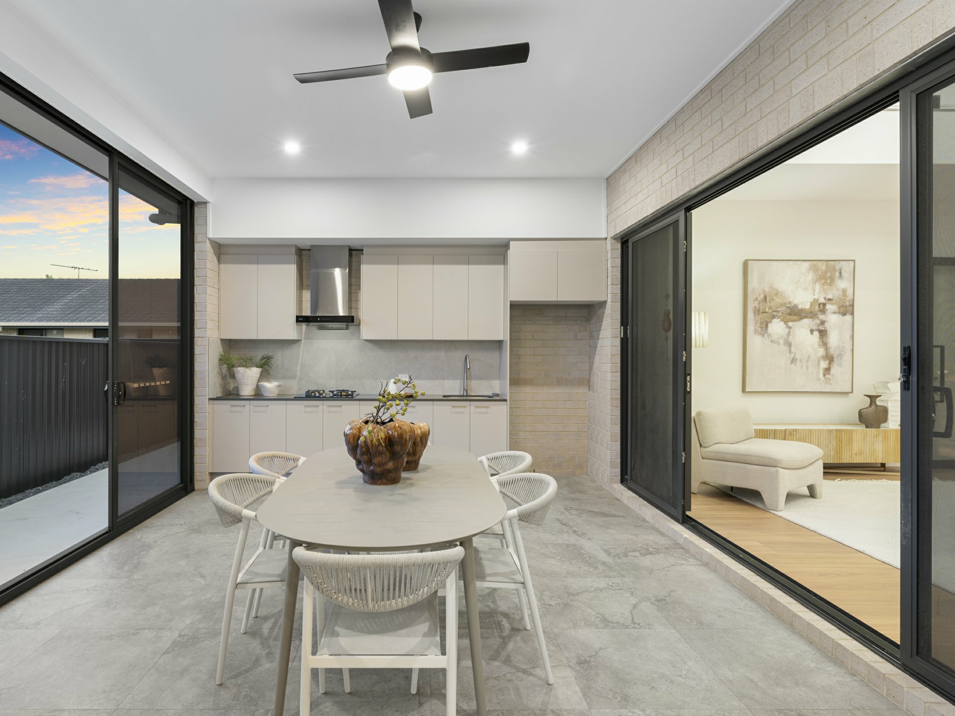 Sliding doors extend the living space into a fully enclosed alfresco, complete with gas cooktop, rangehood, air conditioning and ceiling fan. Designed for year-round entertaining, it connects seamlessly to the secure, low-maintenance concrete yard.