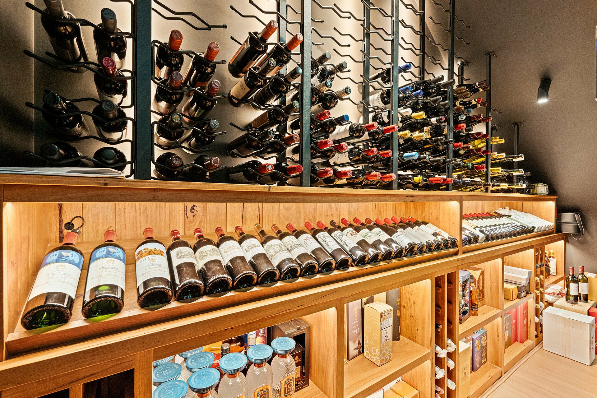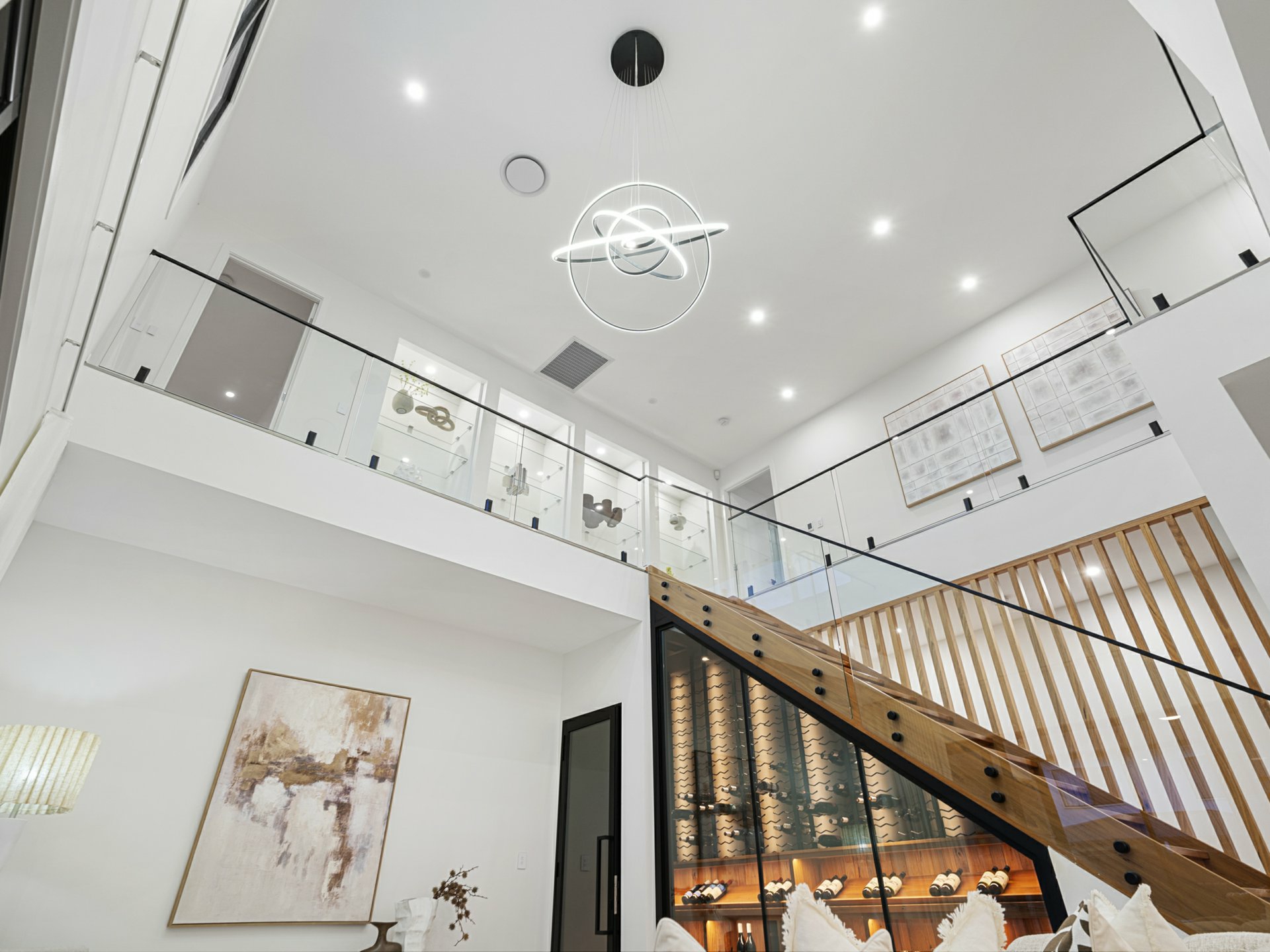 2. Soaring void above main living and custom illuminated glass wine cellar.
