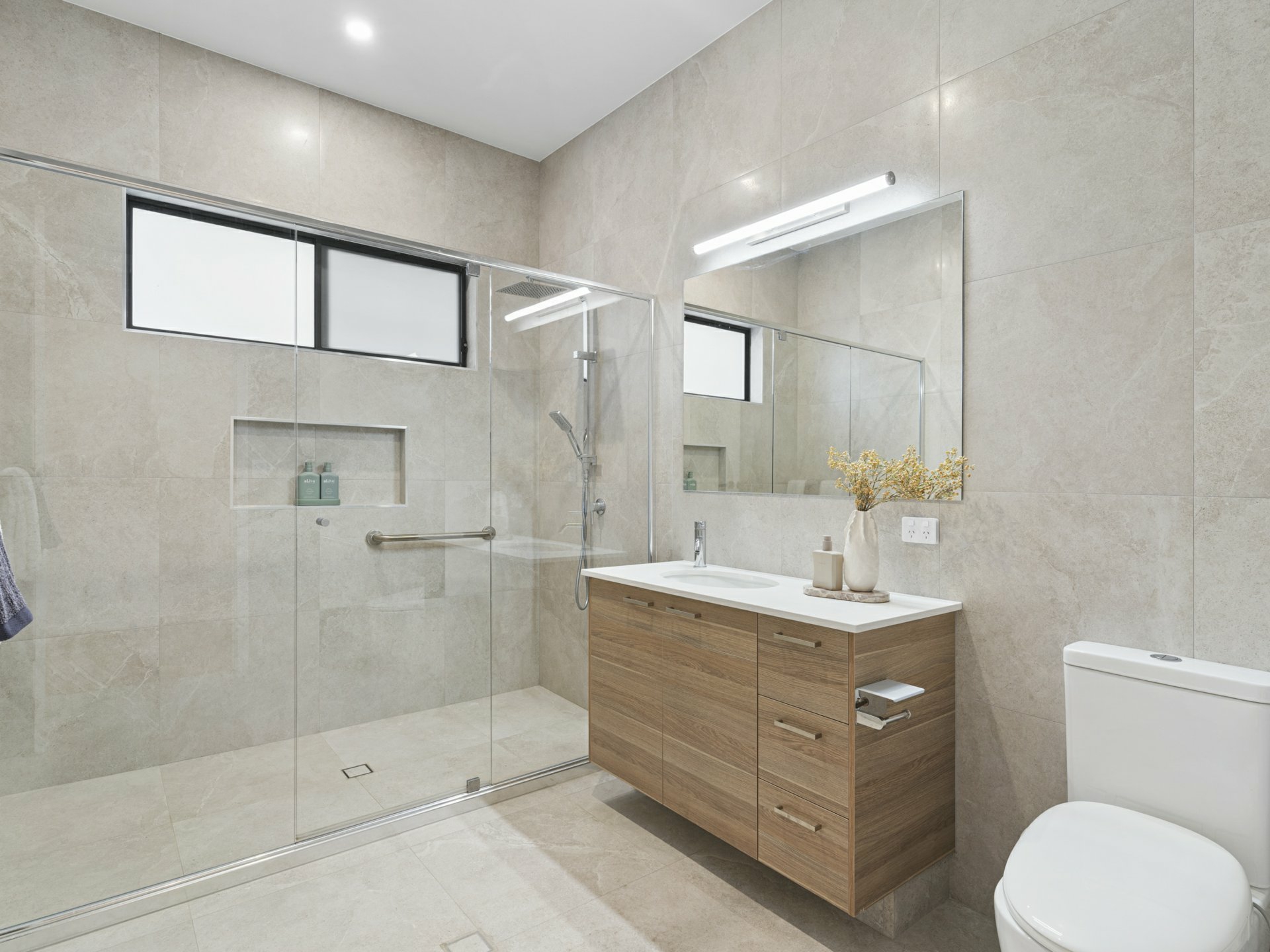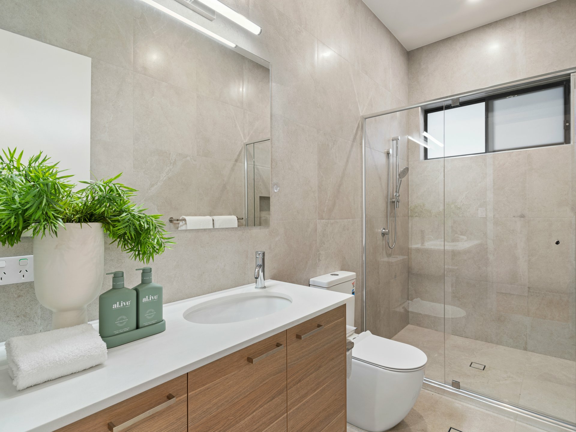 Upstairs, four generously proportioned bedrooms each enjoy private ensuites finished in large-format tiling, floating timber vanities, stone surfaces and walk-in showers.