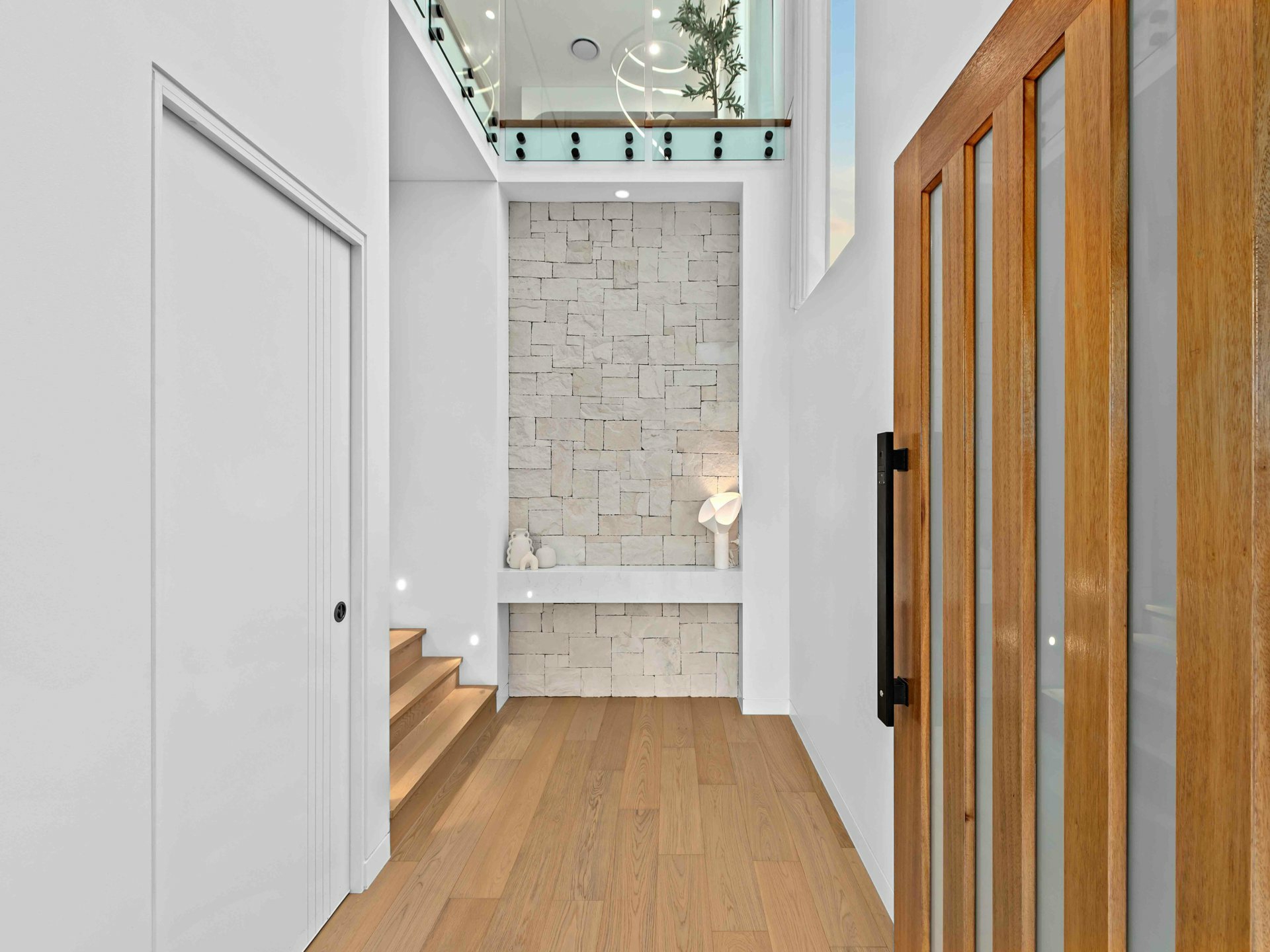 A bold street presence sets the tone for what lies beyond the secure front gate. Past the double garage and formal porch entry, the foyer rises in dramatic scale to a stunning 6.4m void with feature pendant lighting and a stacked stone wall that adds texture and warmth. The interior unfolds with seamless oak-toned timber flooring, soaring 2.72m ceilings across both levels, and a refined monochromatic palette that whispers elegance at every turn.