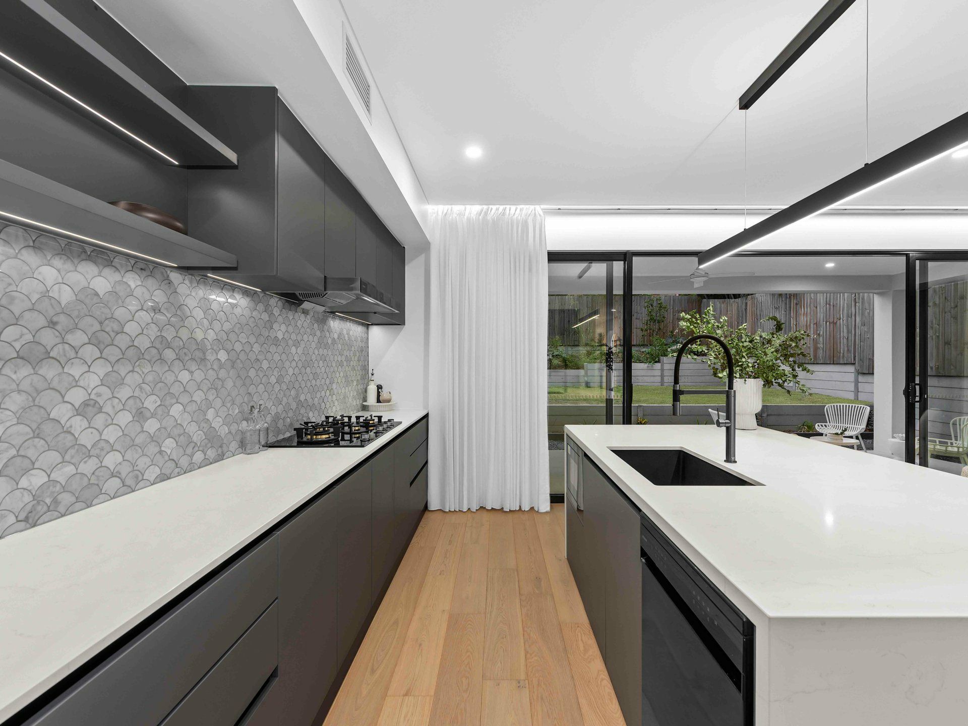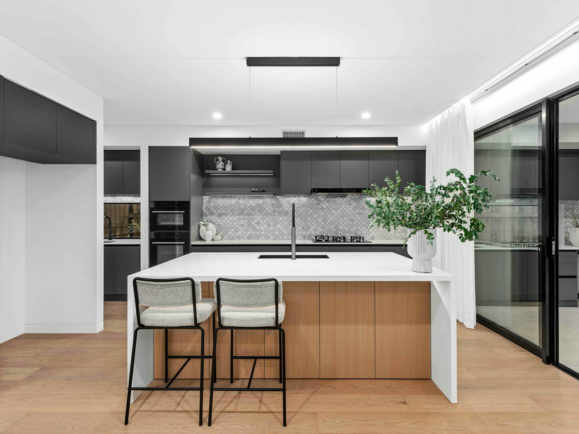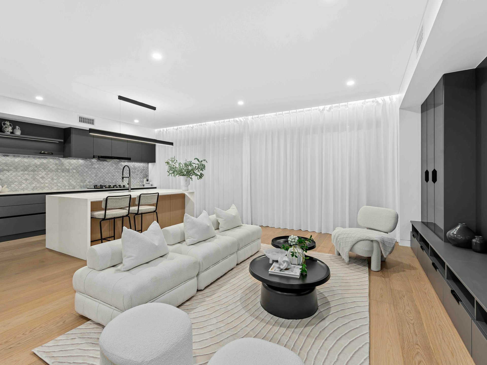 At the heart of the home, the designer kitchen is as practical as it is beautiful. Matte black cabinetry, premium stone benchtops, integrated appliances and LED strip lighting under a floating bulkhead set the scene for culinary excellence. The oversized island is crowned with a modern pendant light strip, while the generous butler pantry adds to the functional flow for everyday life and entertaining success.
