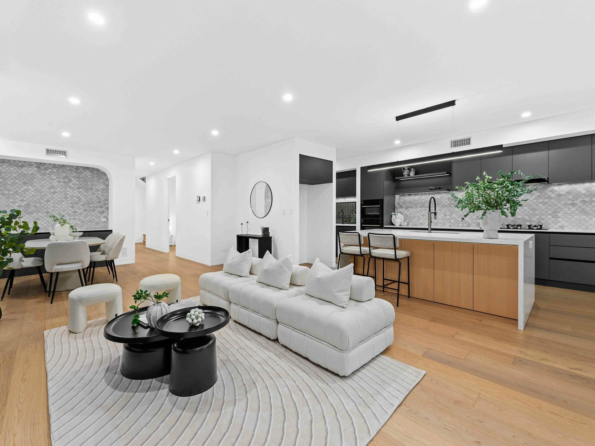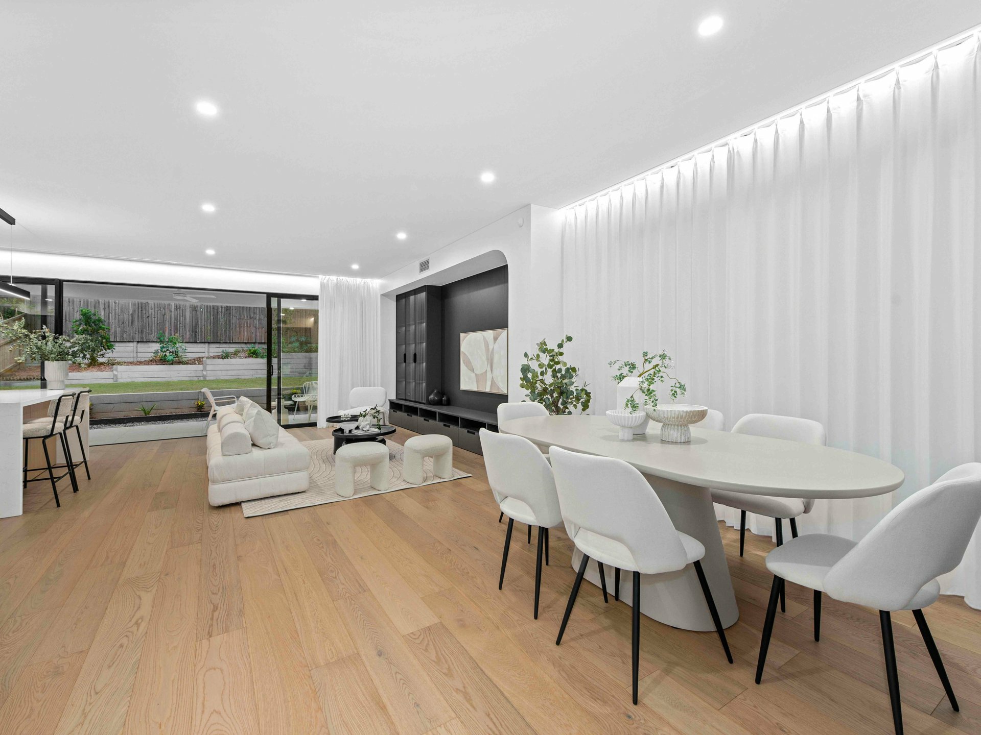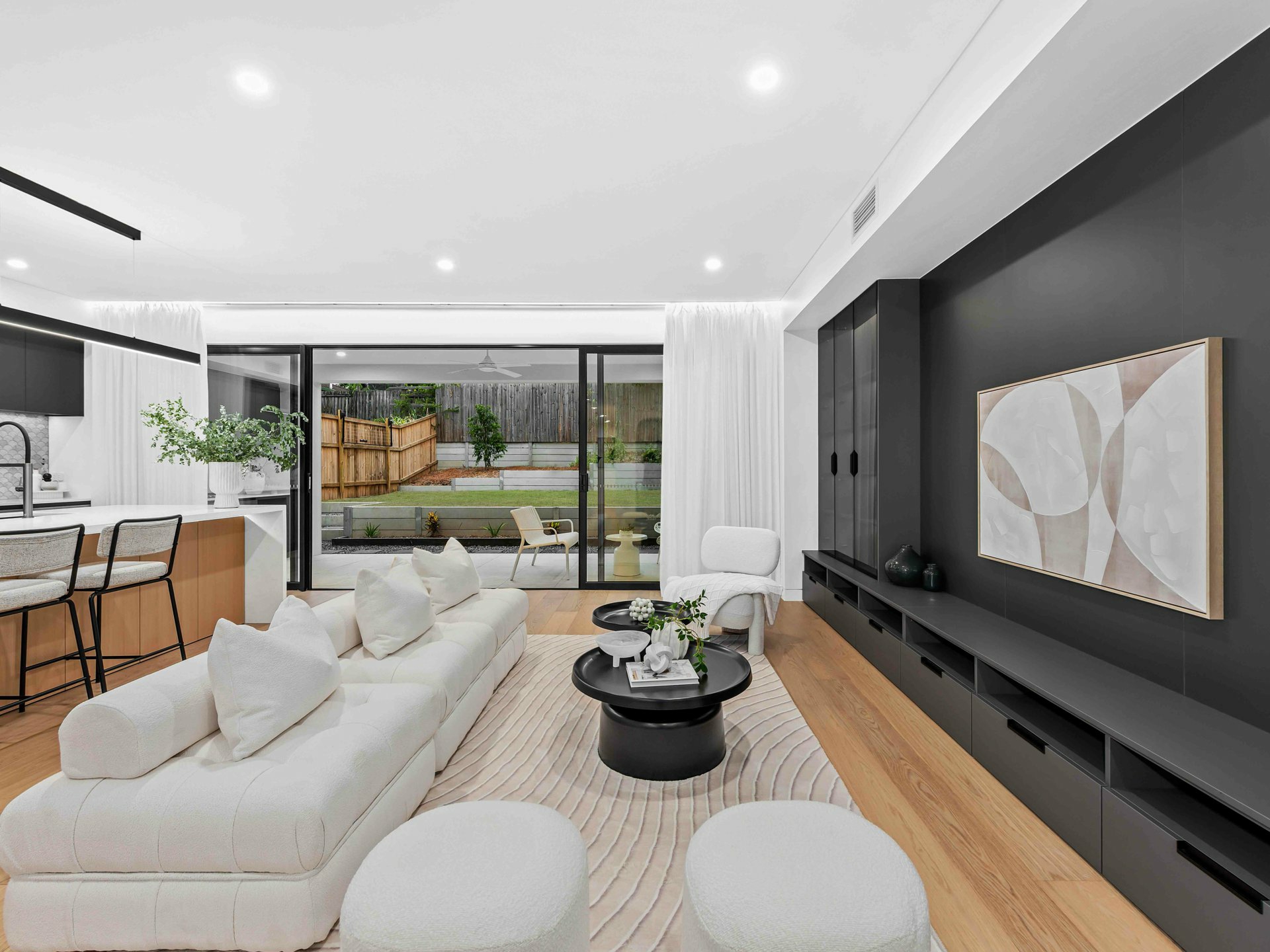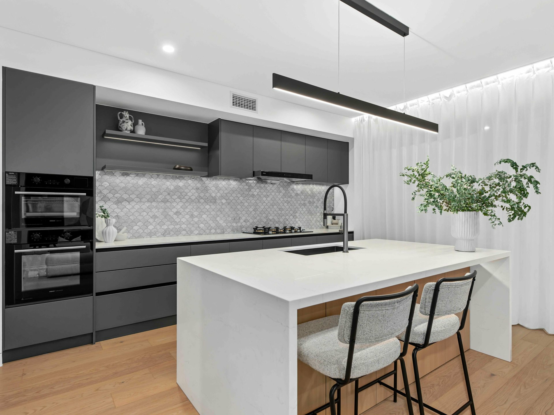 At the heart of the home, the designer kitchen is as practical as it is beautiful. Matte black cabinetry, premium stone benchtops, integrated appliances and LED strip lighting under a floating bulkhead set the scene for culinary excellence. The oversized island is crowned with a modern pendant light strip, while the generous butler pantry adds to the functional flow for everyday life and entertaining success.
