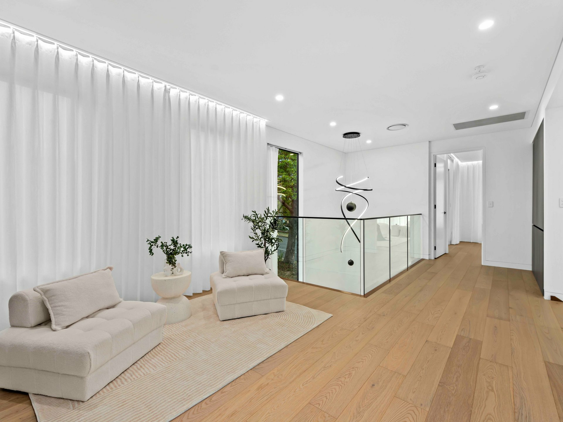 A stylish upstairs retreat provides a tranquil lounge area or study zone - bright, open, and framed by glass balustrading that overlooks the foyer void. Additional features include an upstairs kitchenette with sink and fridge provision, ideal for long-term guests or teenagers.