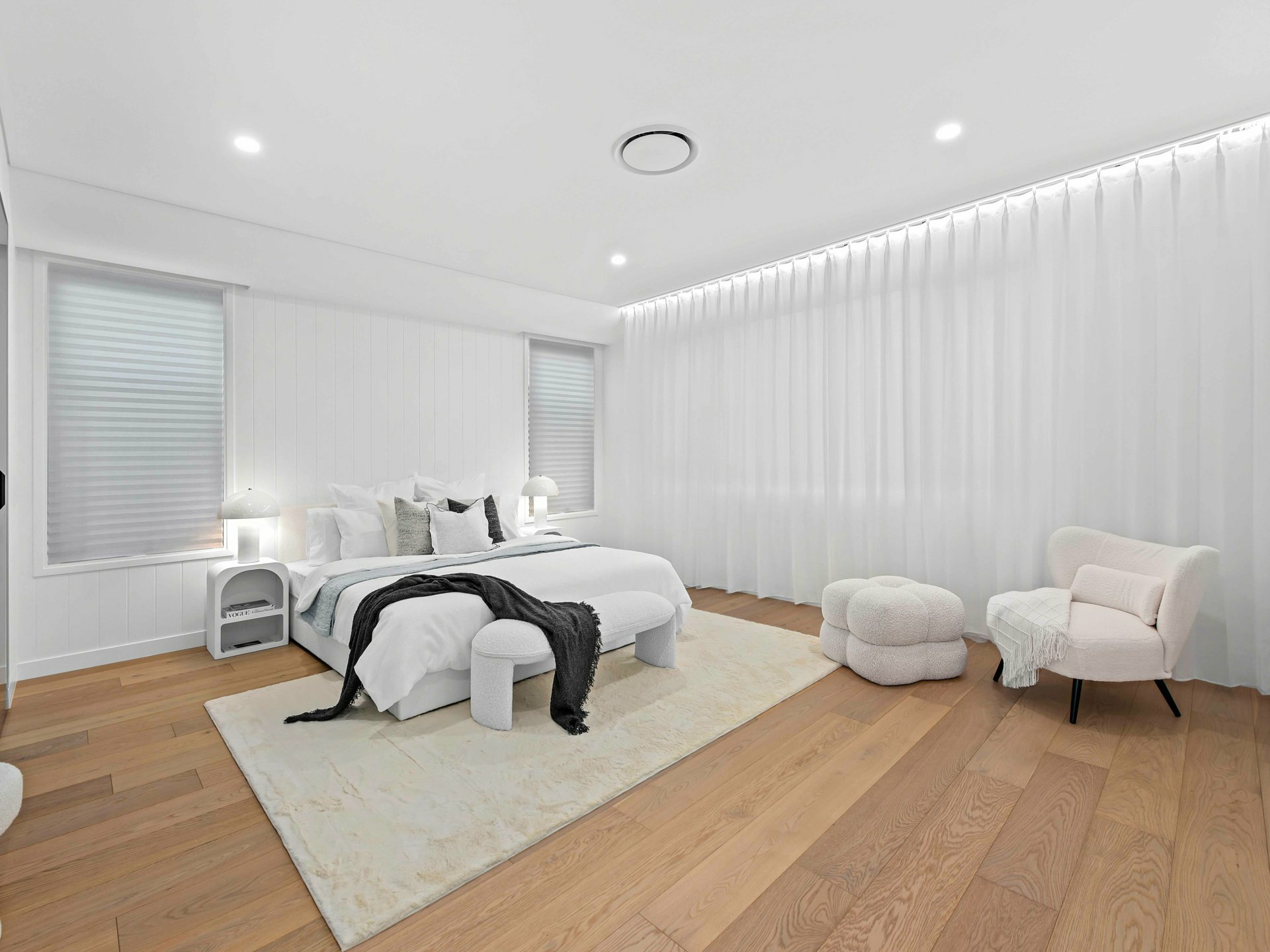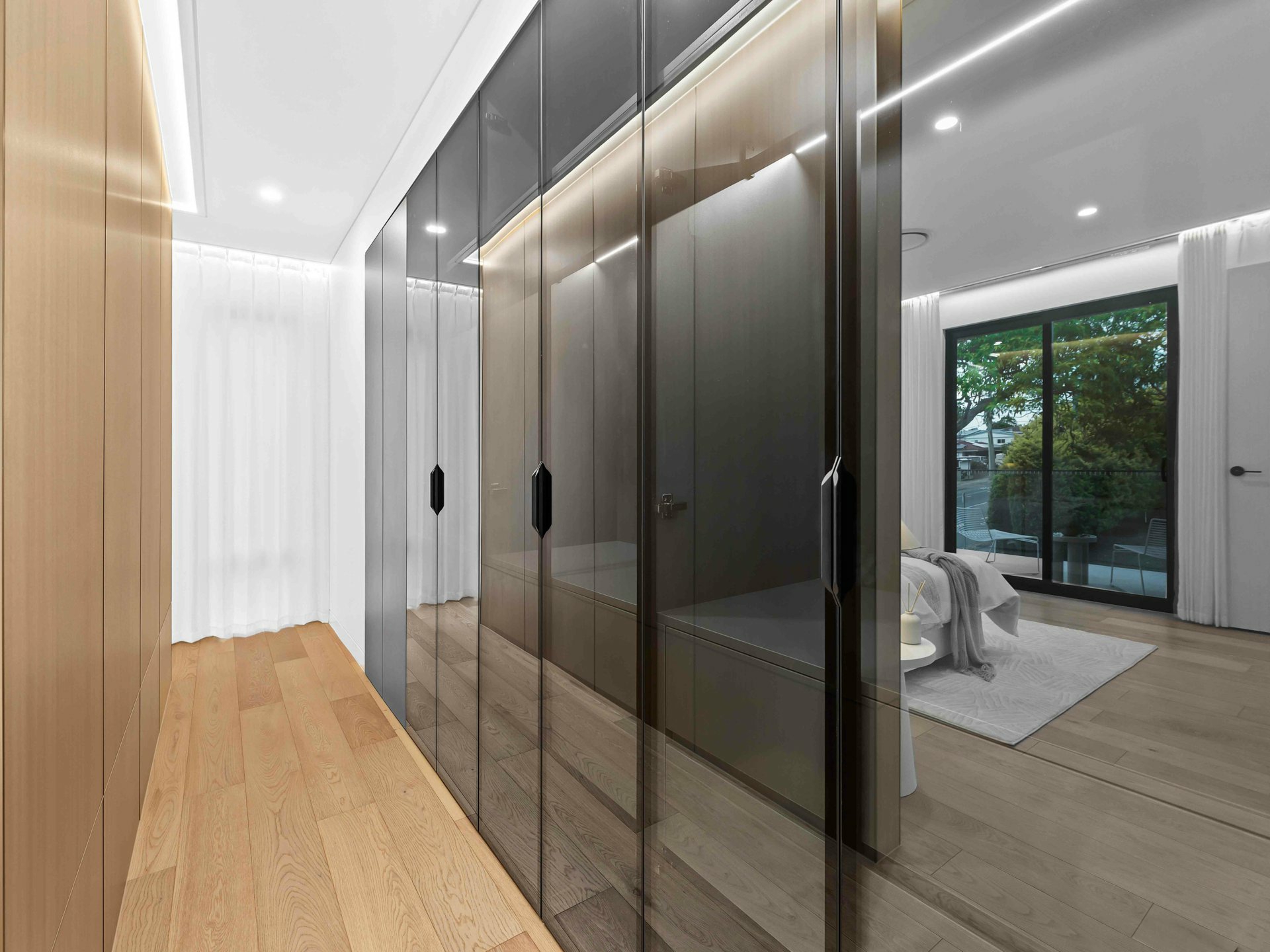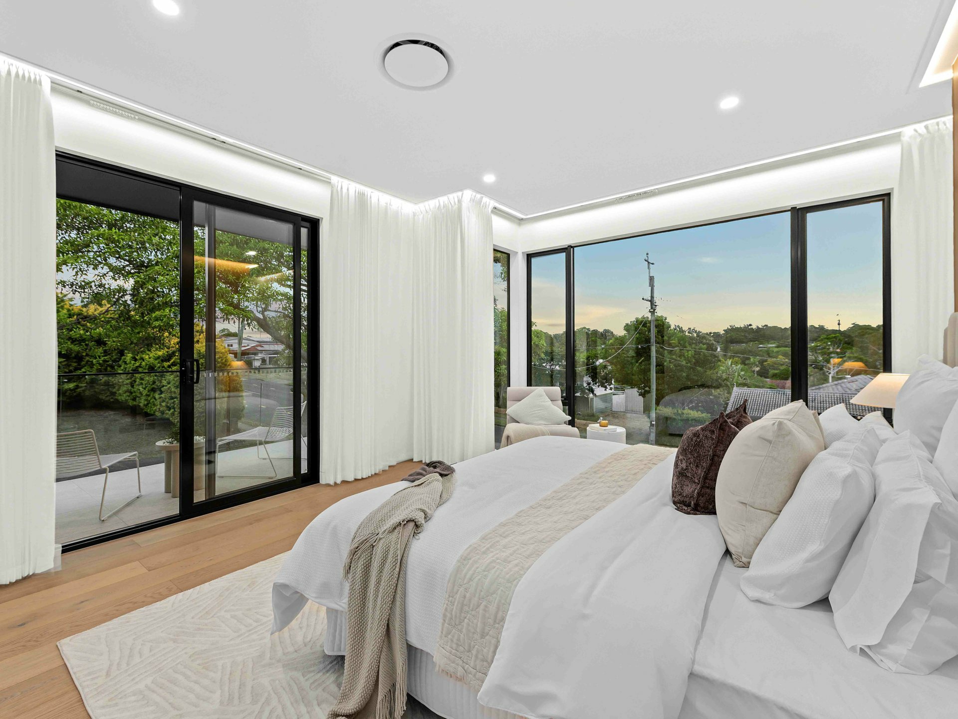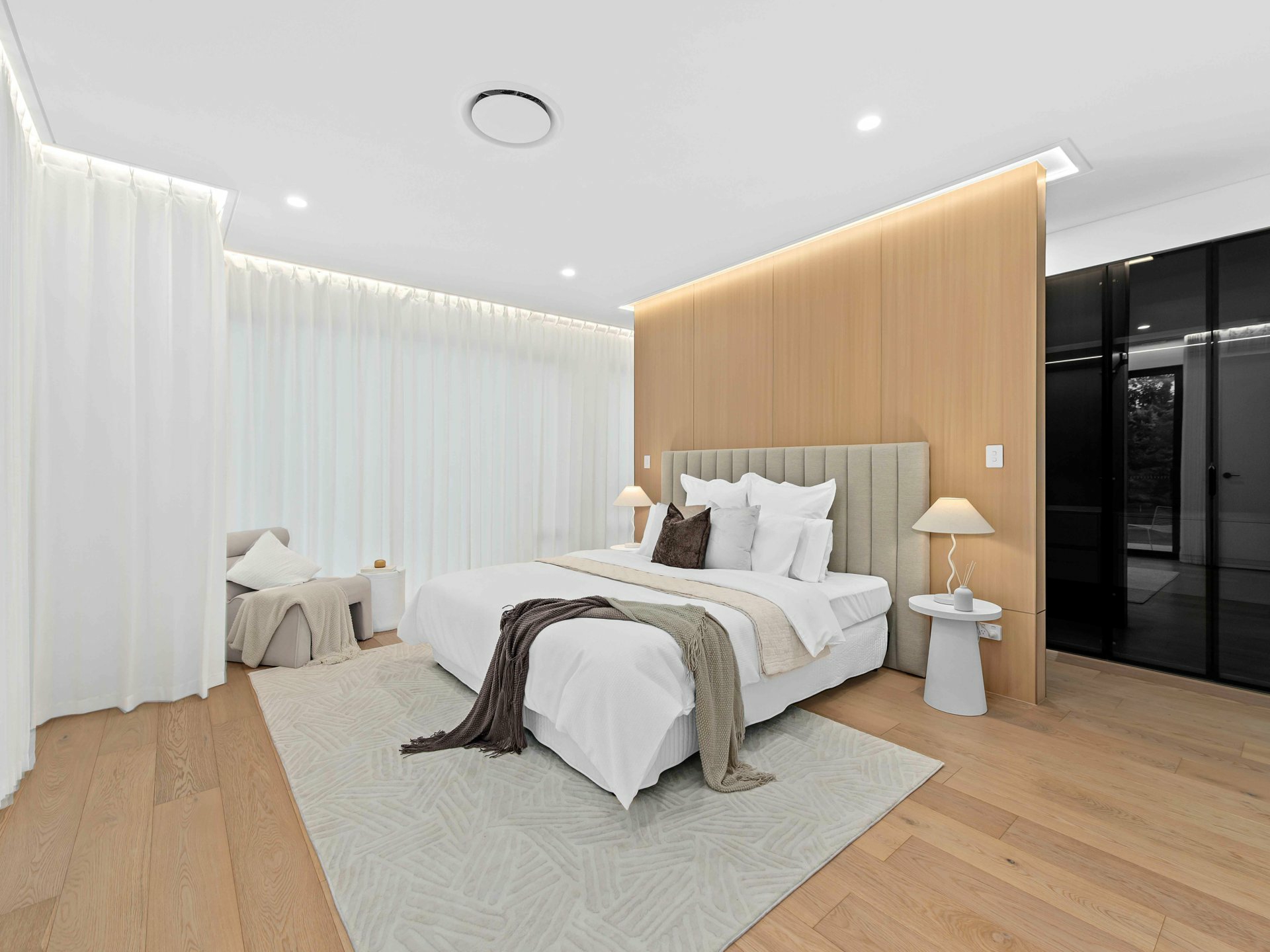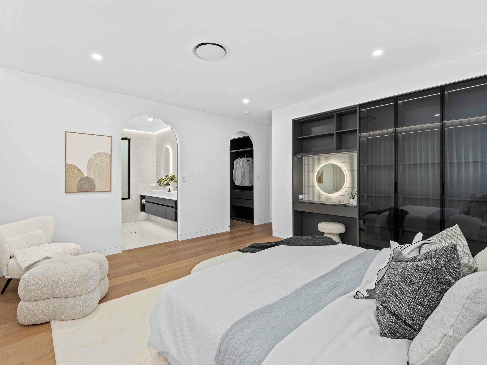 Upstairs, you're spoiled for choice with not one, but two master retreats. The first suite offers a serene private balcony with lush treetop views and a showstopping ensuite - complete with a dual-sink vanity, curved feature tiling, and an indulgent walk-in rainhead shower. Meanwhile, the second master exudes boutique hotel luxury, featuring extensive built-in cabinetry, a walk-in robe, integrated make-up station, and a designer ensuite with twin basins and a striking circular shower.