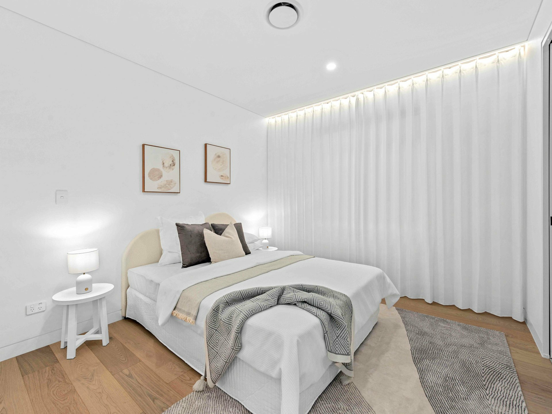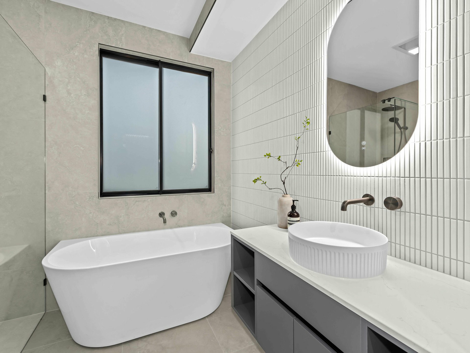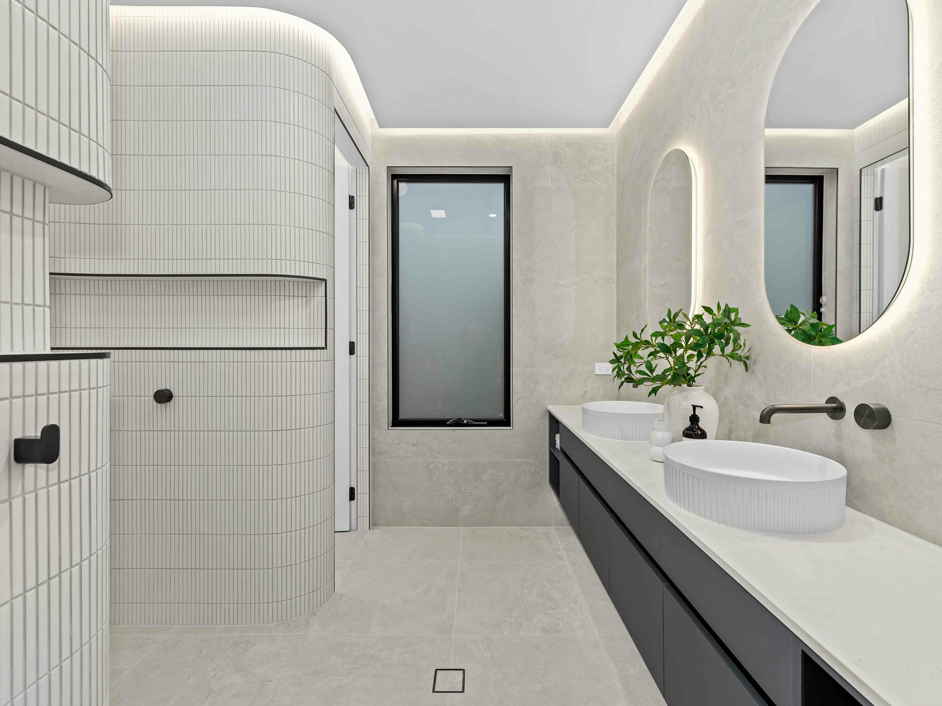 2. Luxe bathrooms with curved feature walls, freestanding bath and LED lighting.