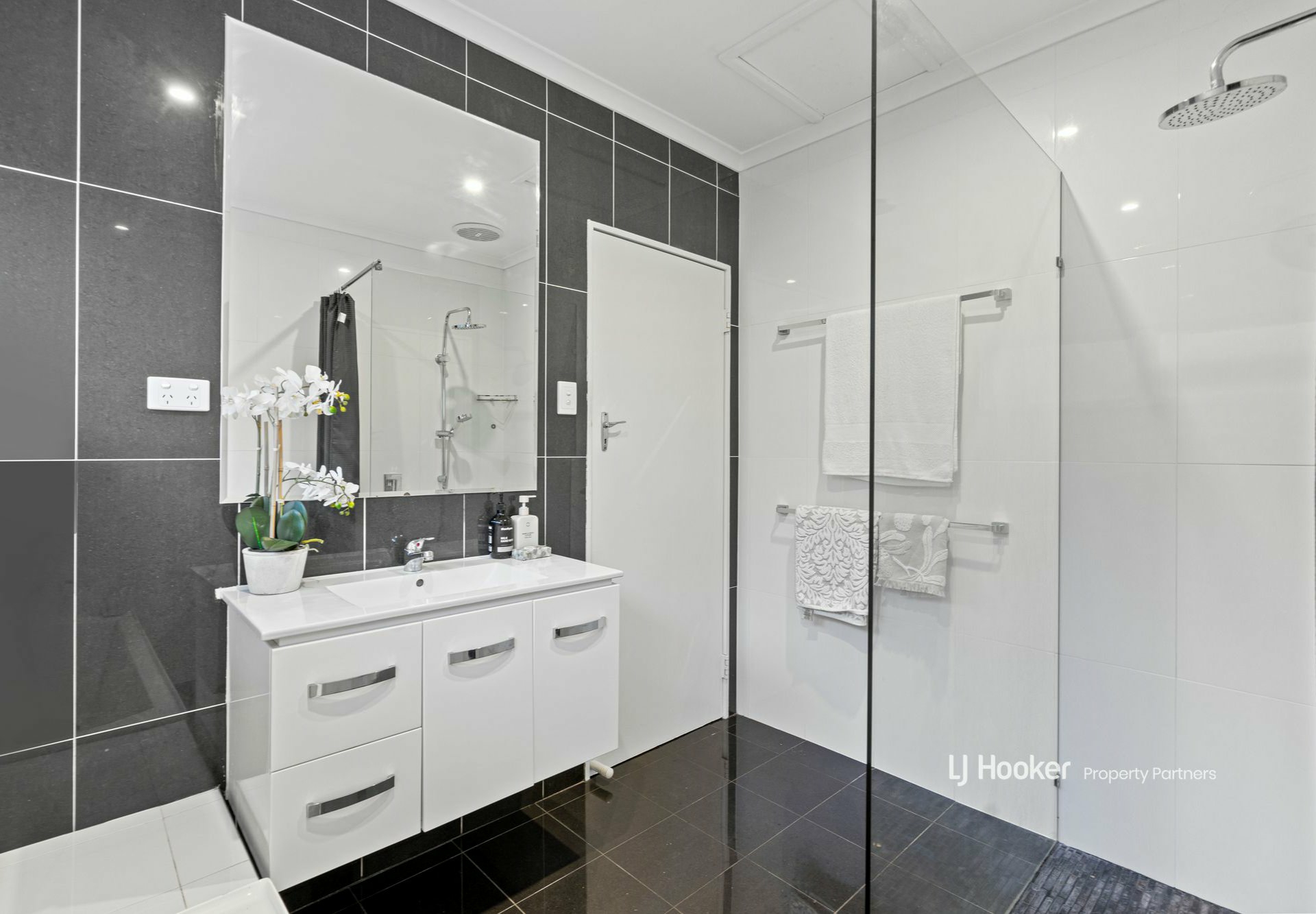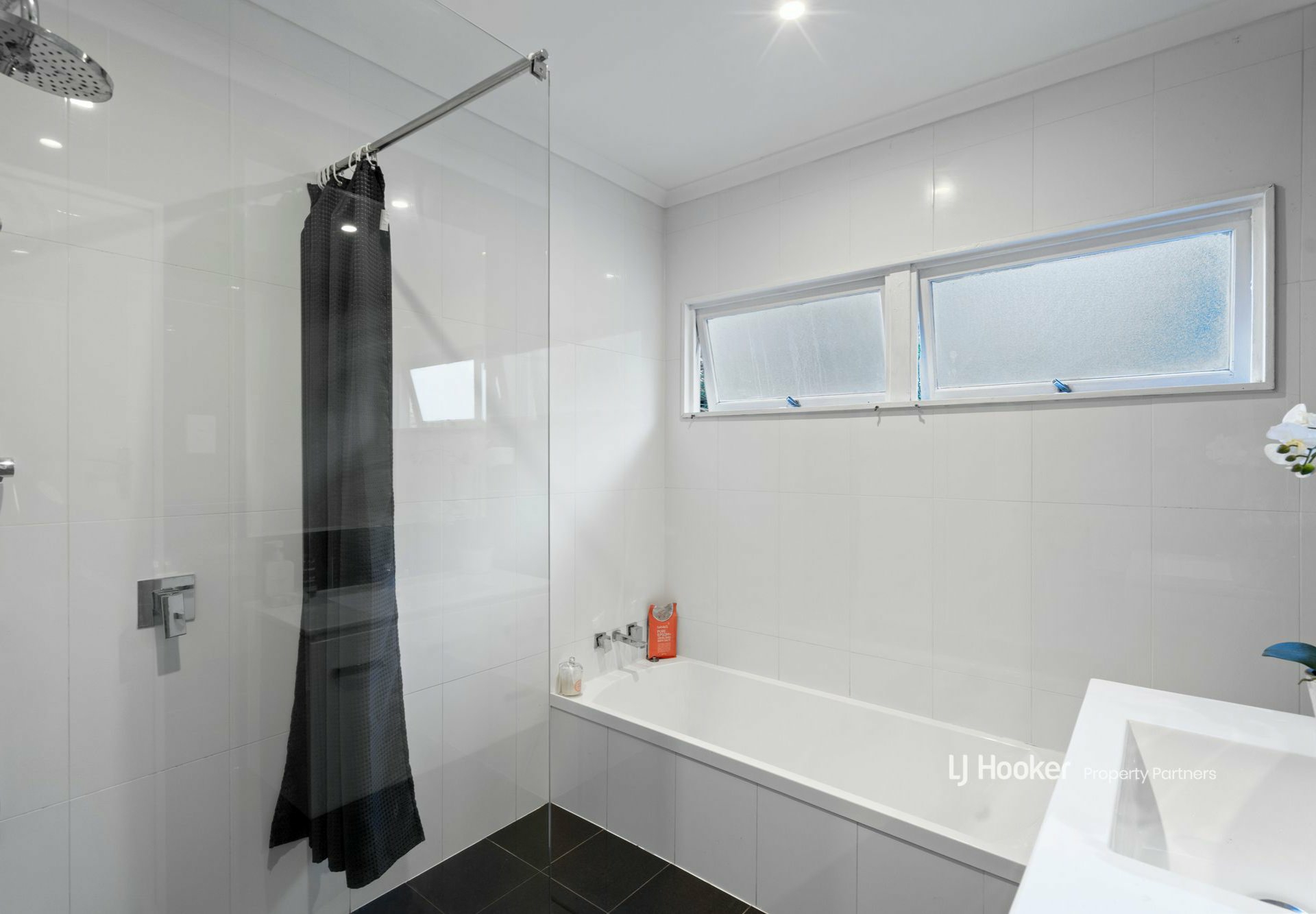 The spacious lounge is set up for all-season comfort with a split system A/C unit and ceiling fan; it also captures cooling breezes thanks to a screened slider opening onto a 12.5m long balcony overlooking the front garden. Like the one below, the bathroom up here has been updated - now sporting a chic black and white theme with floor-to-ceiling tiling, a floating vanity with a recessed basin, a frameless glass shower, and a separate bath.