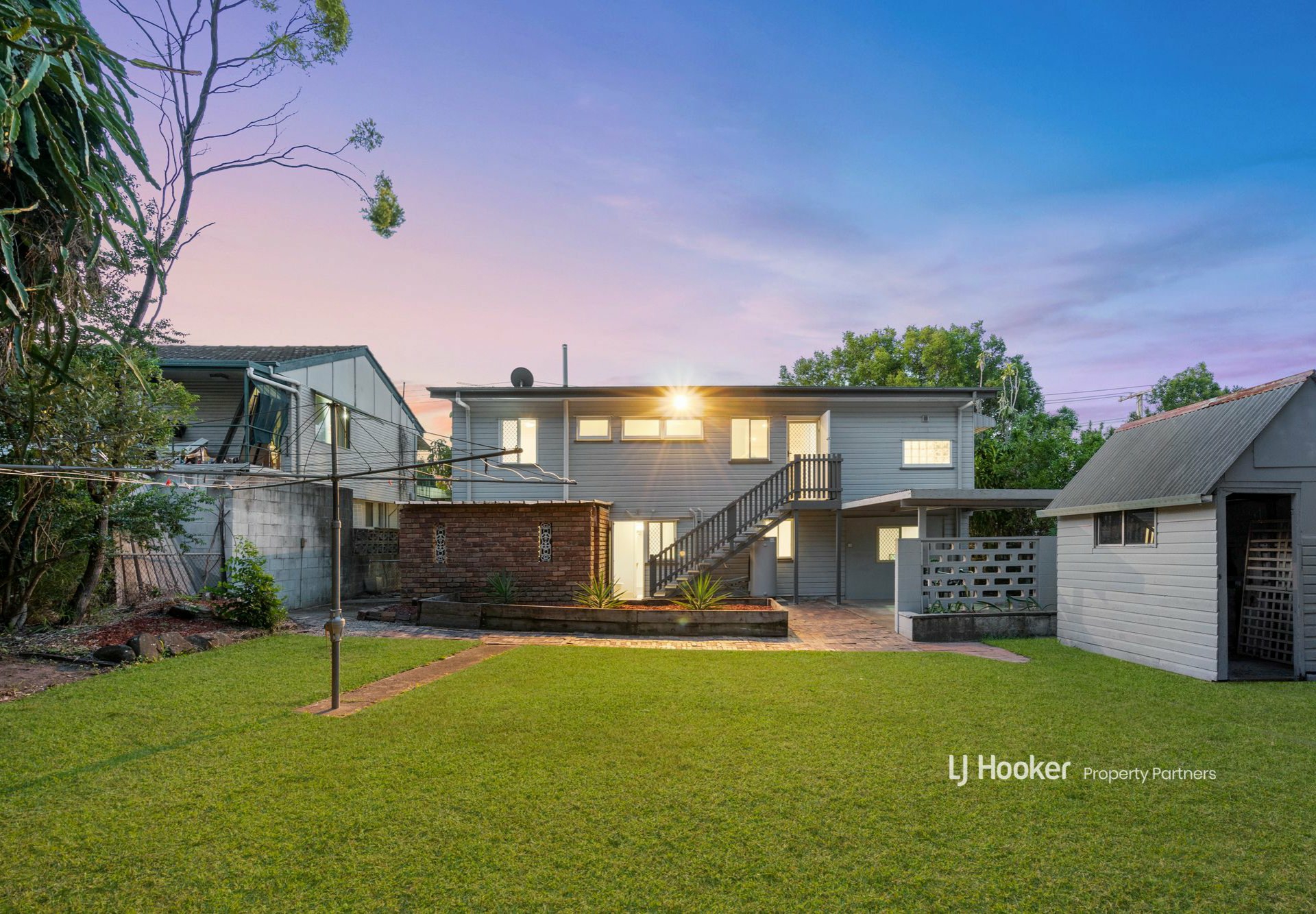 Sitting pretty behind its white picket fence in a quiet street only a short stroll to Banoon train station, this spacious highset has a flexible floorplan that lends itself to both lively entertaining and a possible dual living situation split across two light-filled levels.