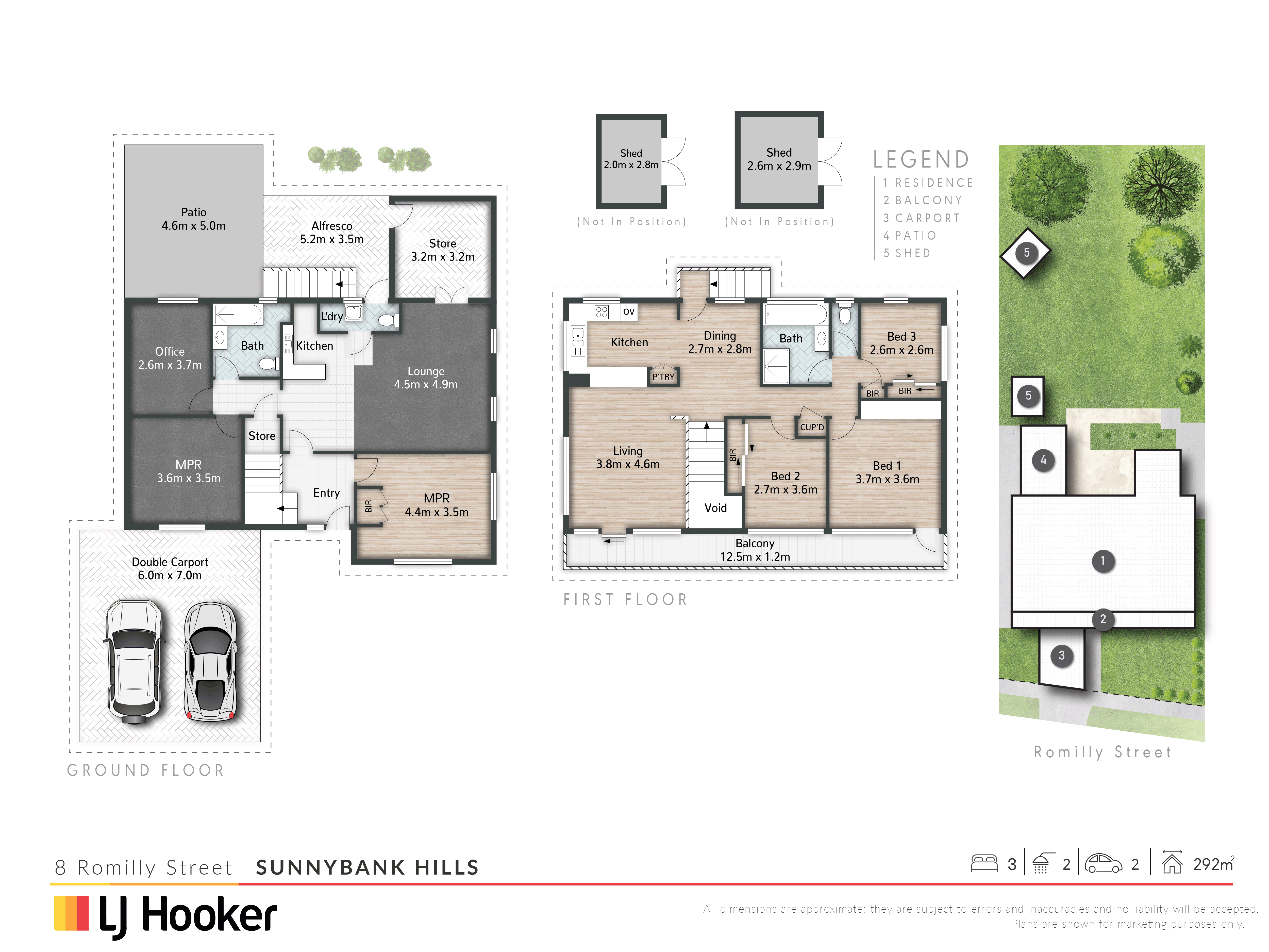 - Below: 3 multi-purpose rooms, a kitchenette, lounge/meals area, bathroom, store, patio