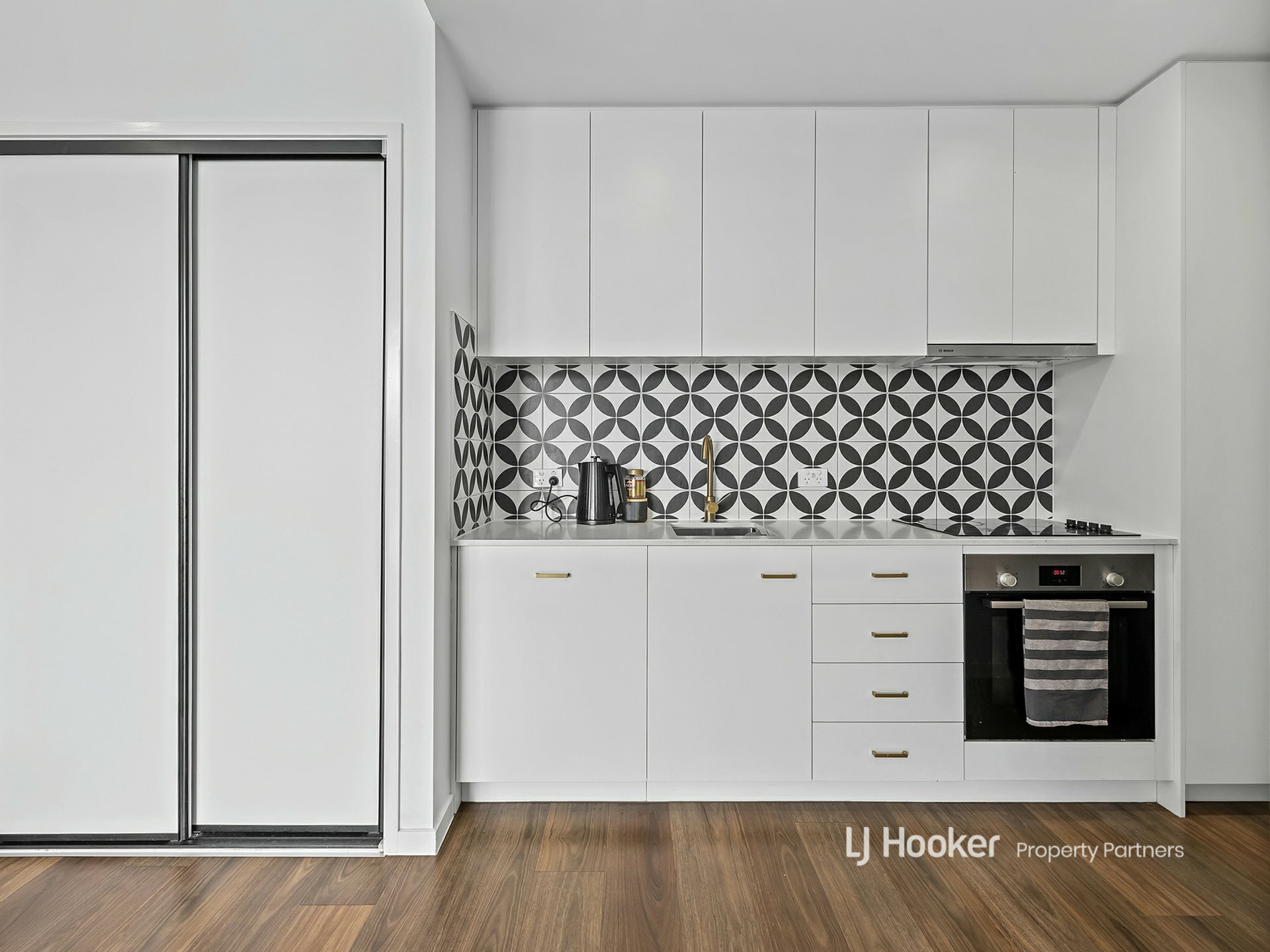 The kitchen makes excellent use of its footprint; a well-configured prep and cooking zone offers a contemporary induction cooker, rangehood, under-bench oven, corner pantry, with storage above and below a striking black and white patterned tiled splashback and elegant rose gold tapware.