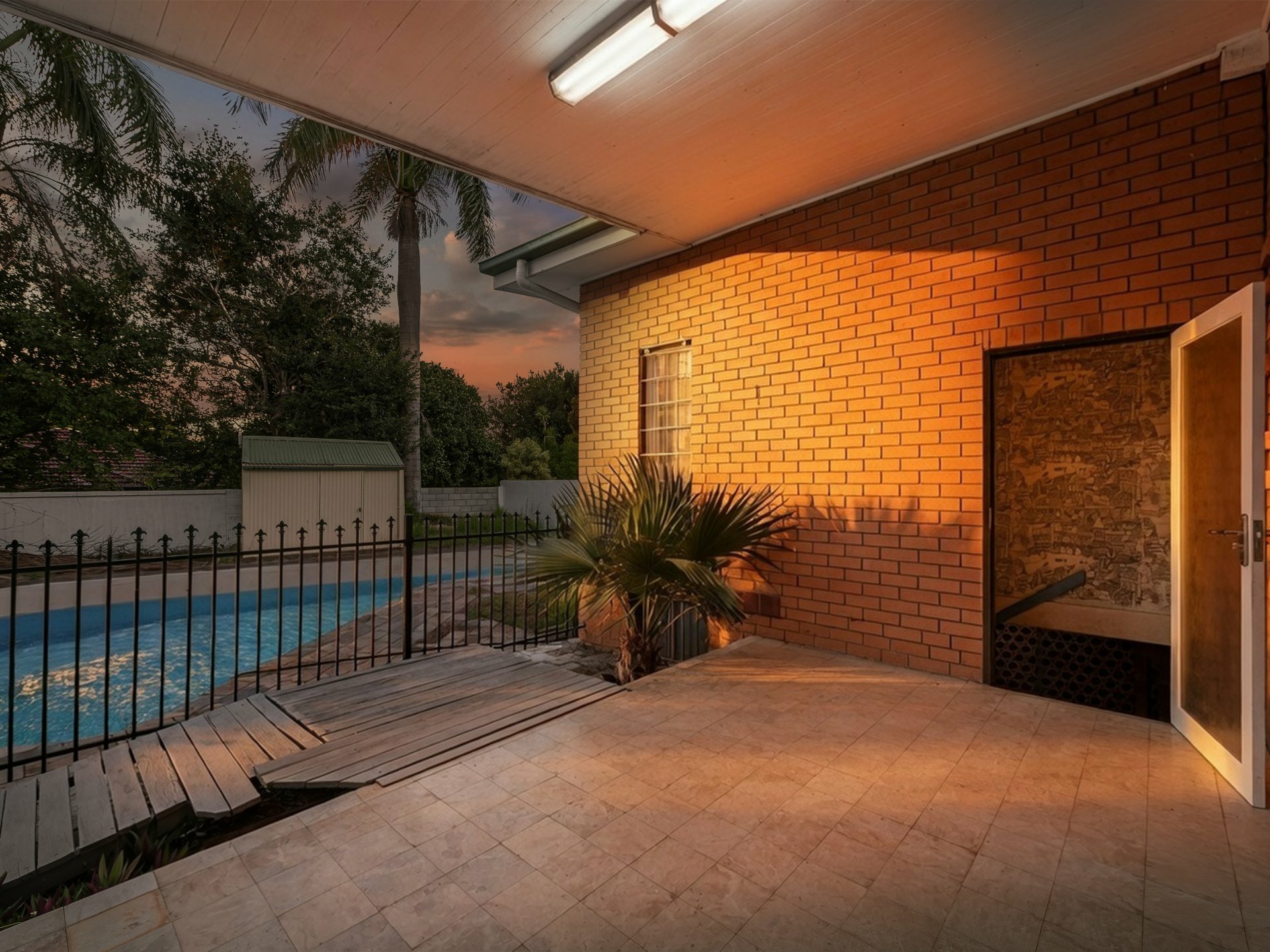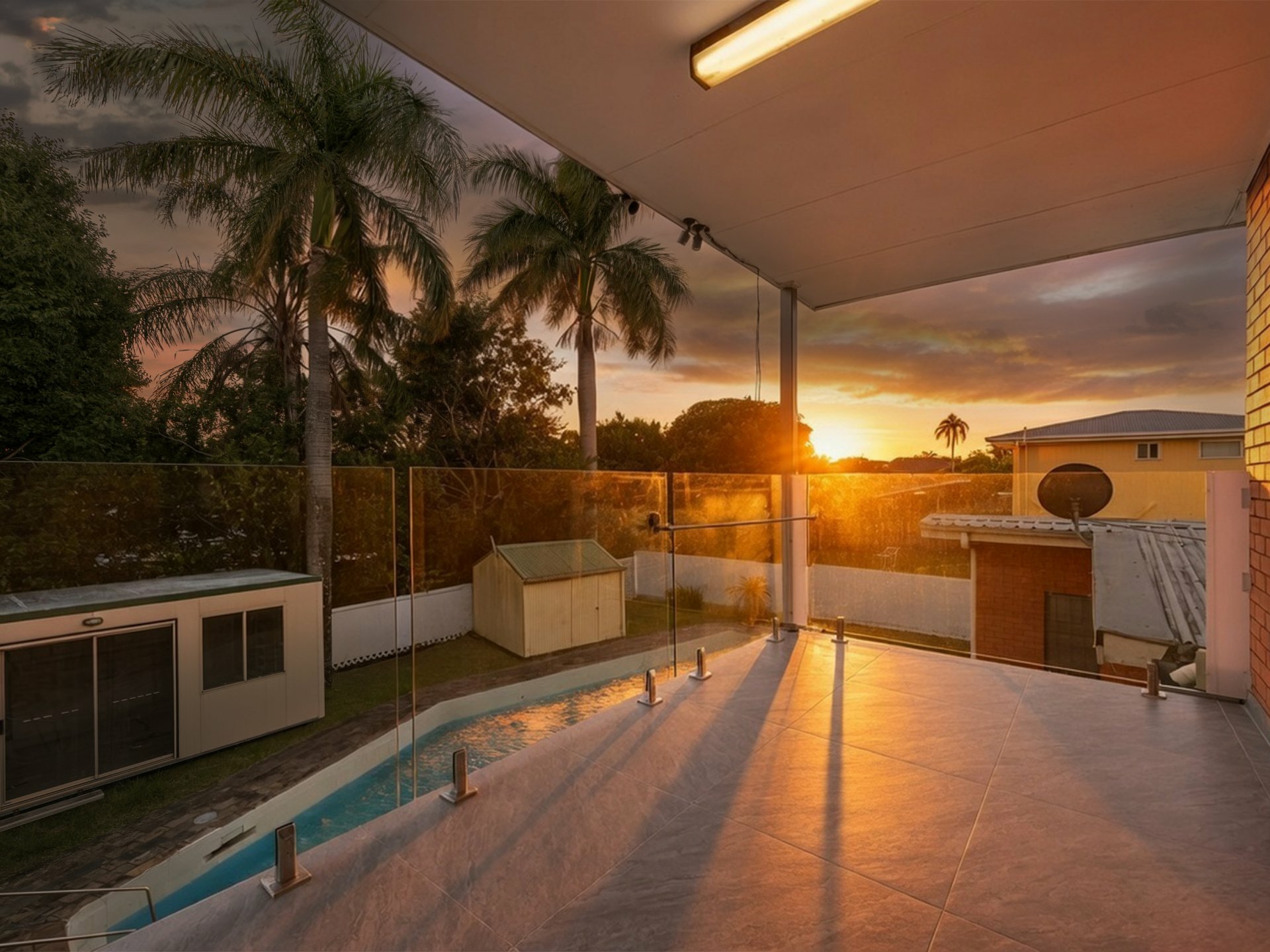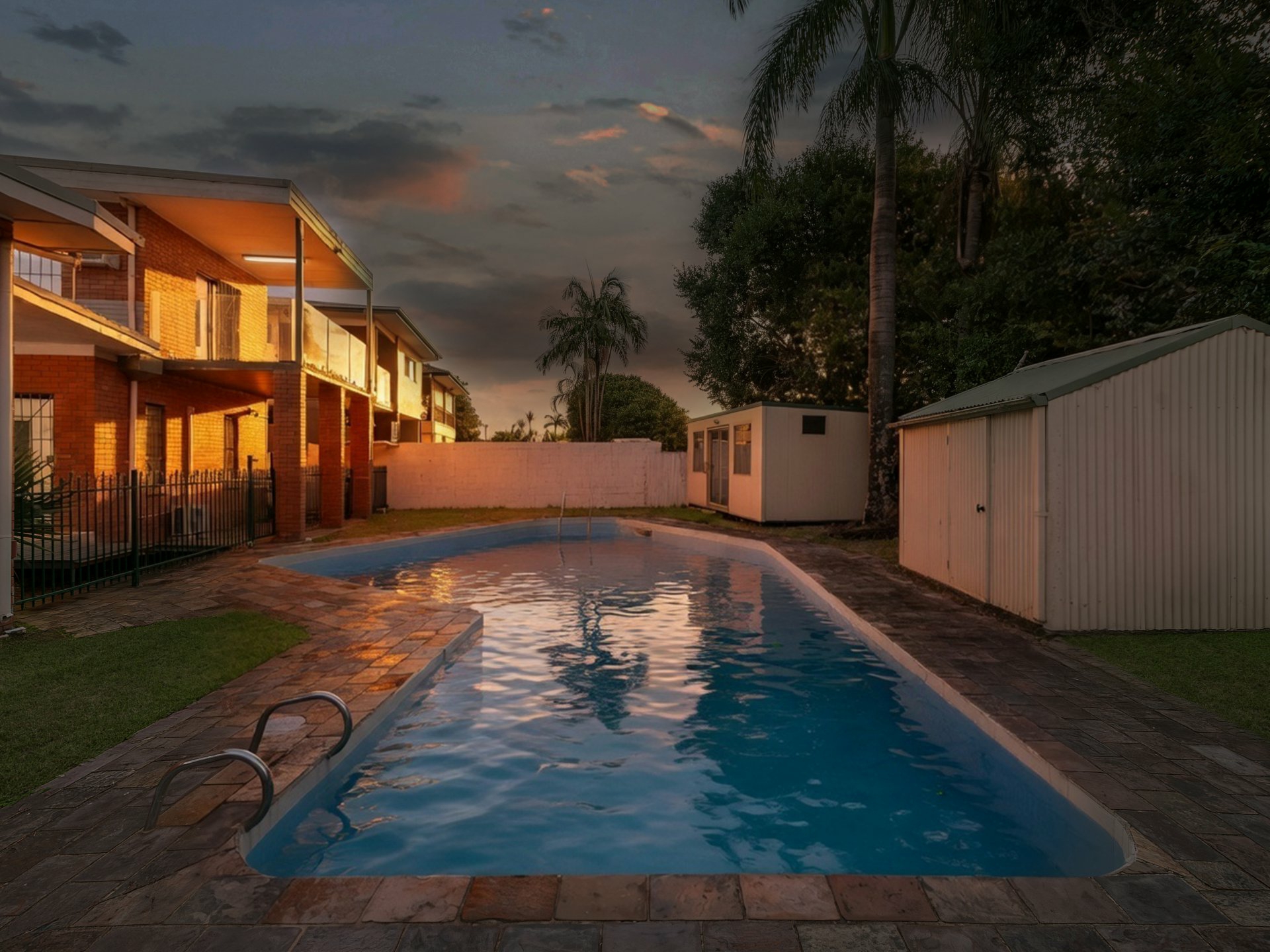 3. Large swimming pool plus two sheds, ideal for storage or workshop use.
