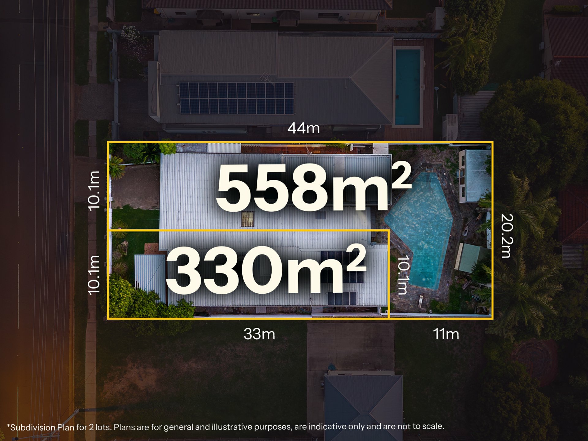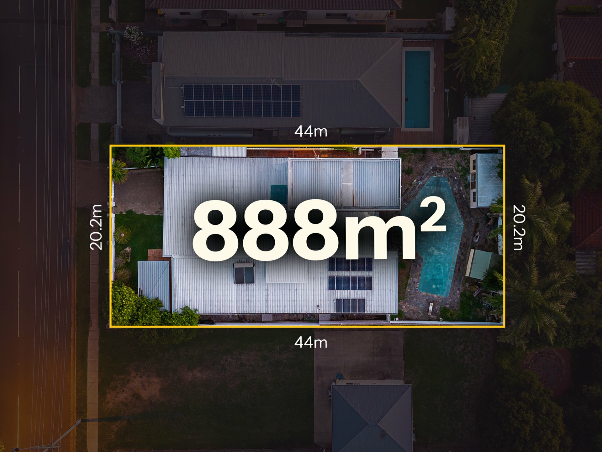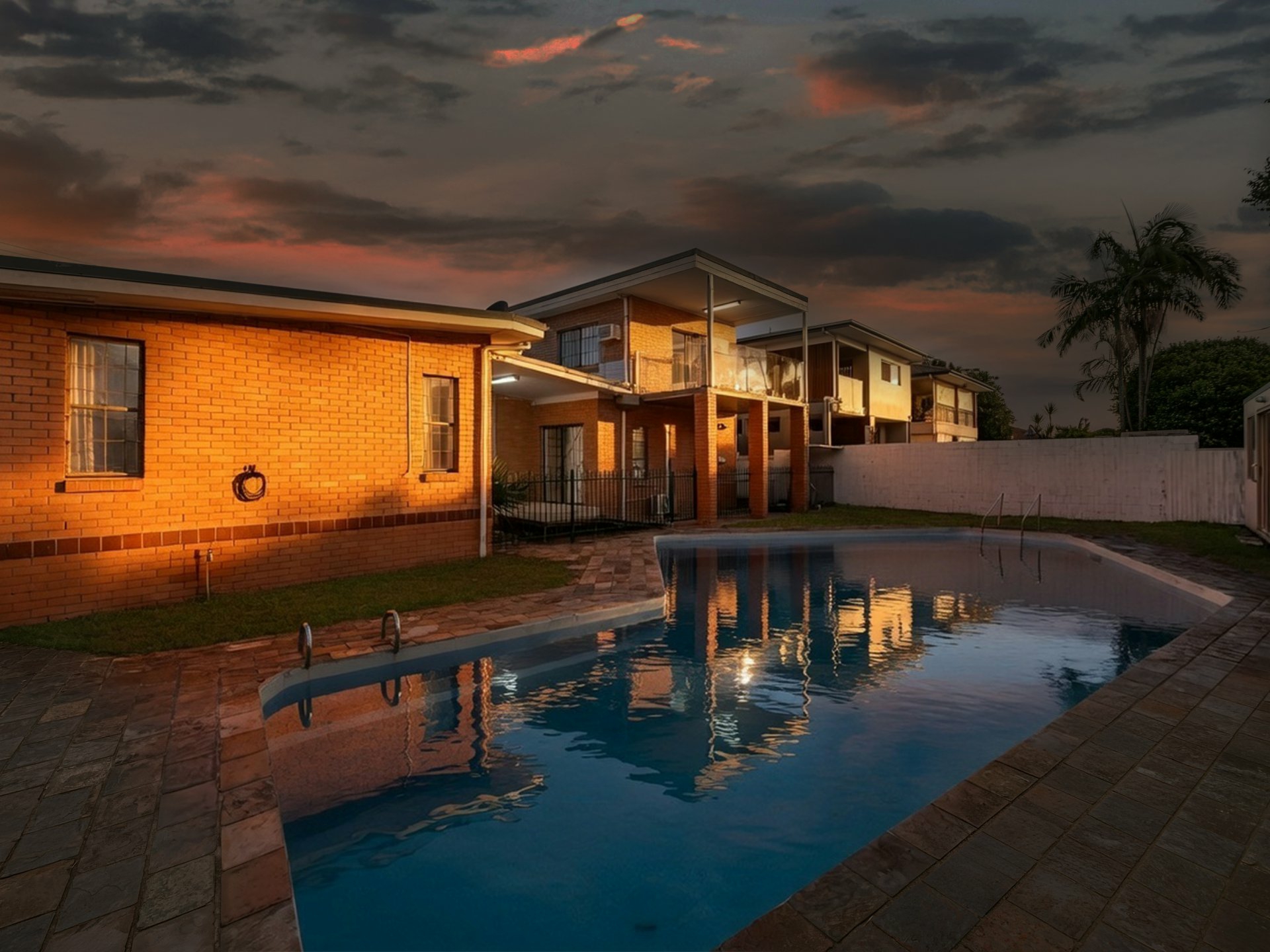 3. Large swimming pool plus two sheds, ideal for storage or workshop use.