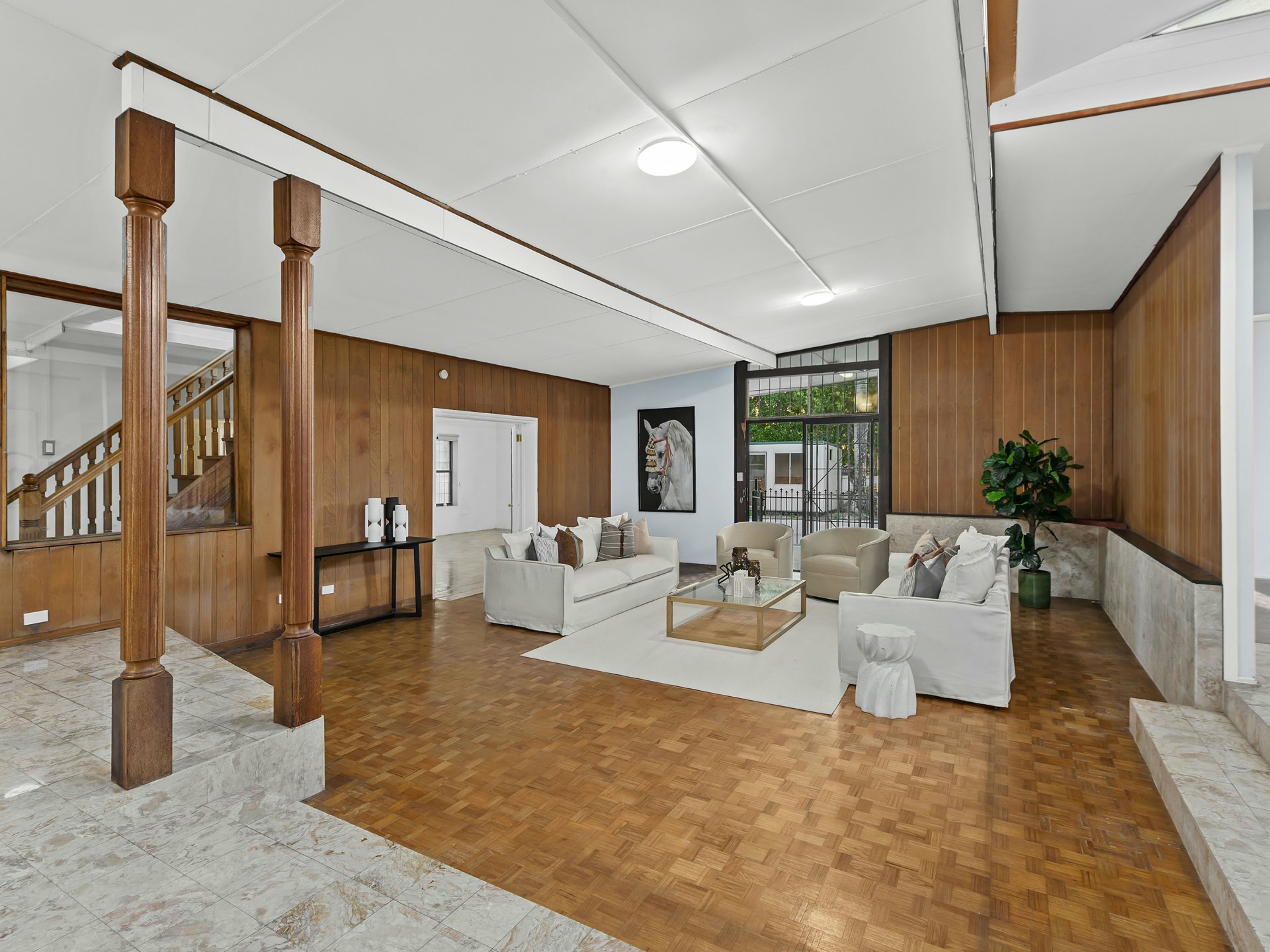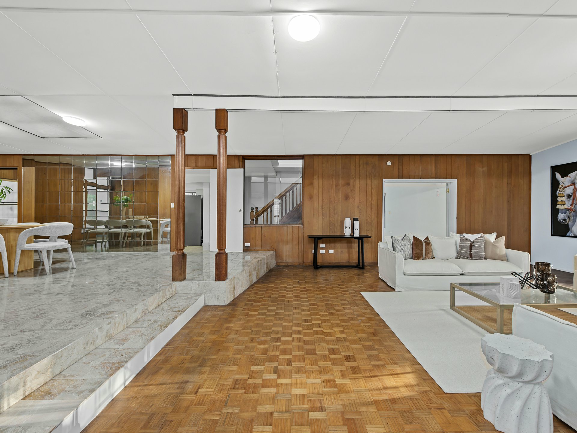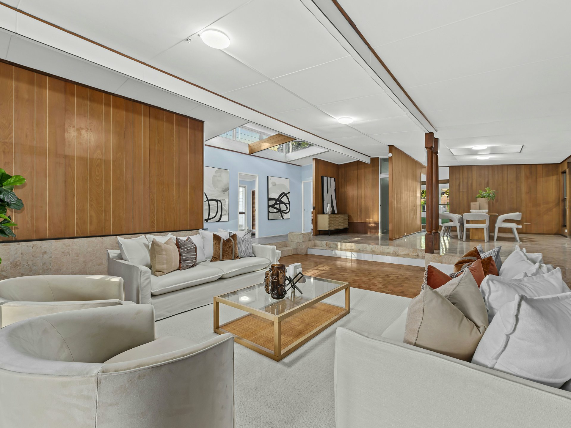 A striking sunken living area forms the heart of the residence, framed by warm timber wall panelling, parquetry flooring and skylights above that fill the space with natural light. The split-level design creates a sense of depth and architectural interest, while the adjoining media and living zones provide multiple spaces for relaxing or entertaining.