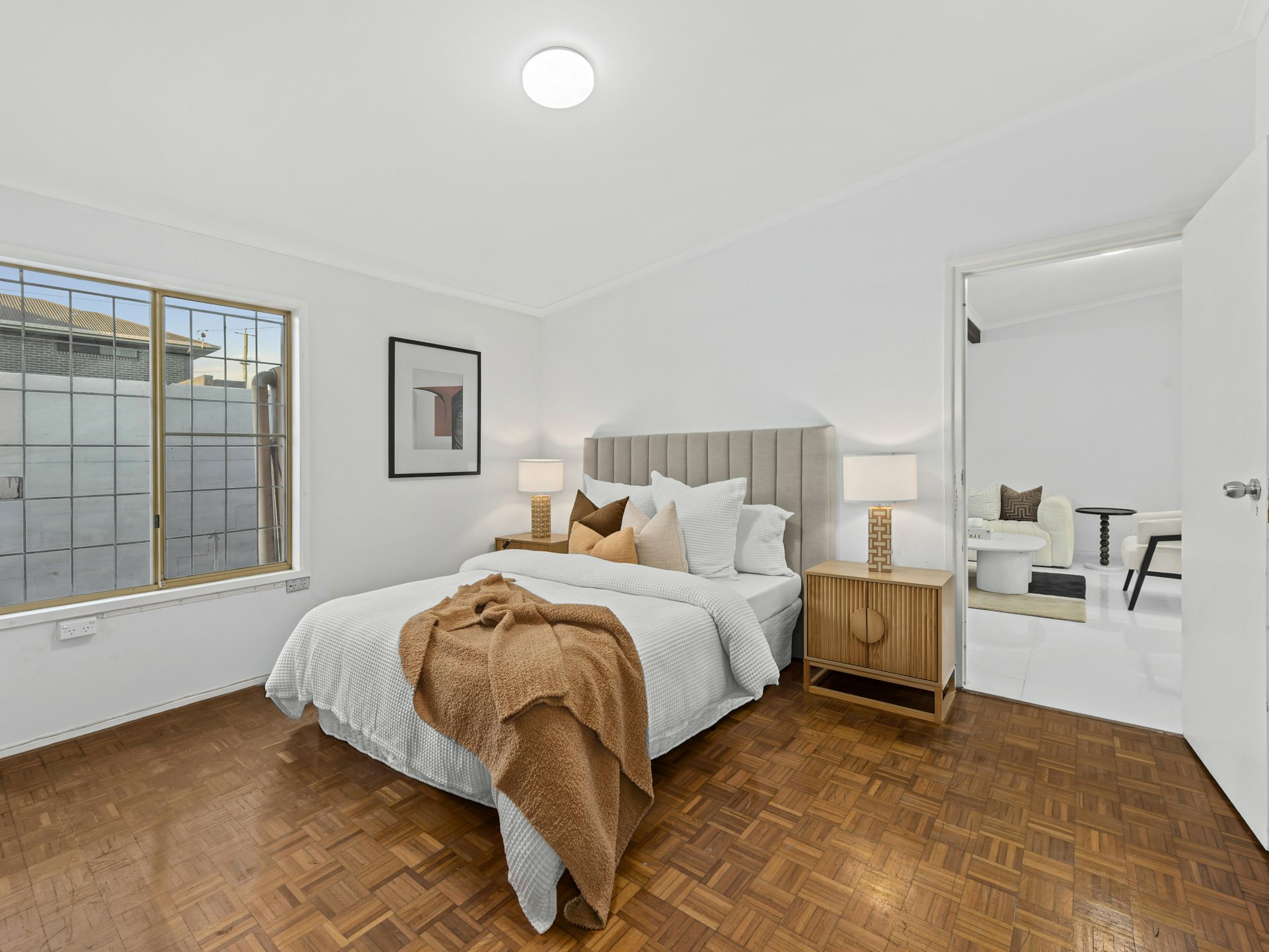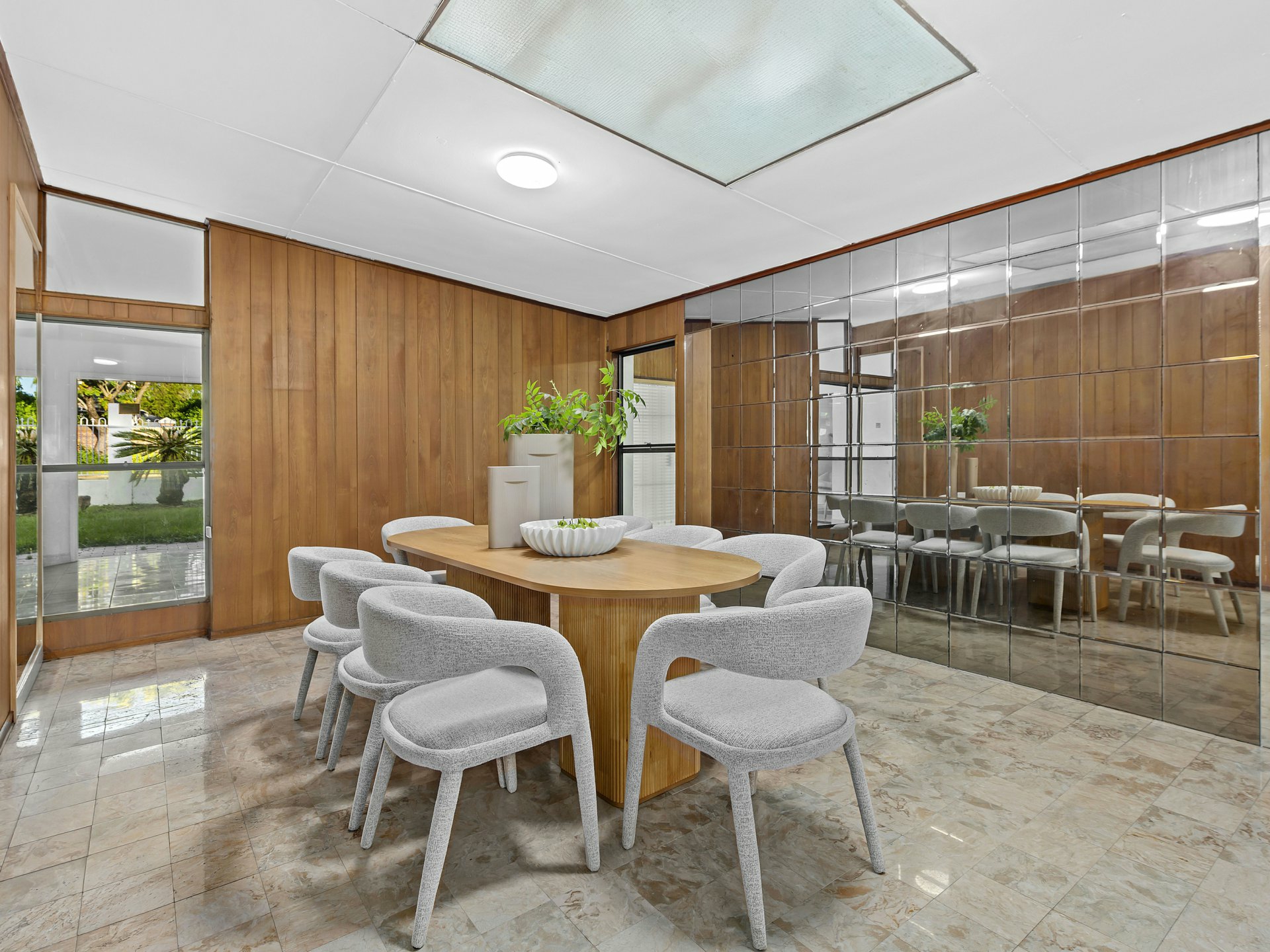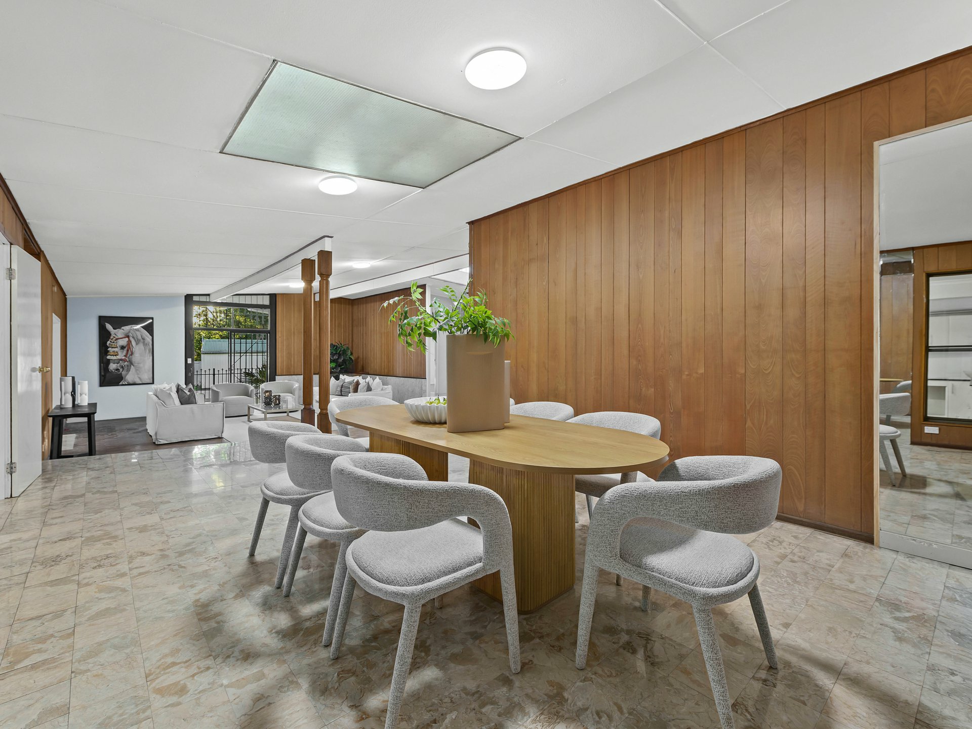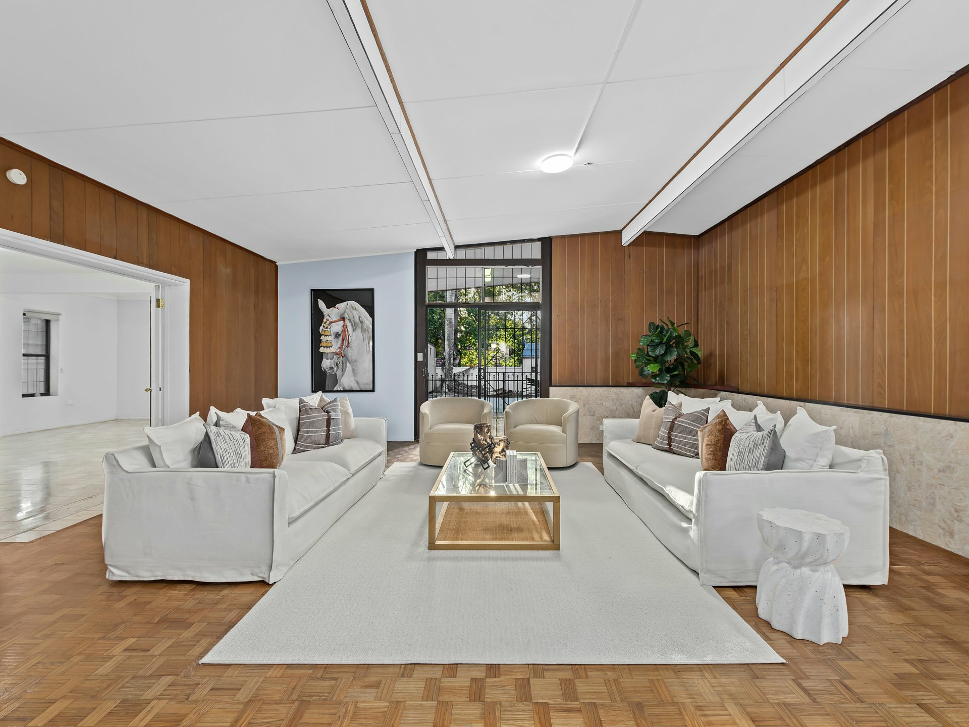A striking sunken living area forms the heart of the residence, framed by warm timber wall panelling, parquetry flooring and skylights above that fill the space with natural light. The split-level design creates a sense of depth and architectural interest, while the adjoining media and living zones provide multiple spaces for relaxing or entertaining.