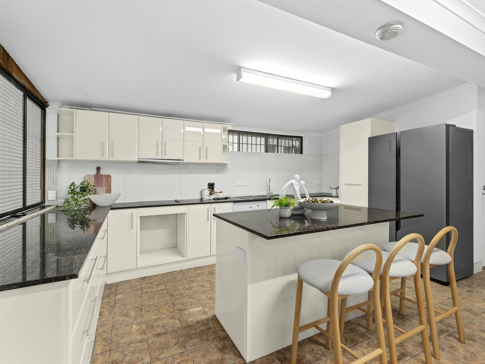 The kitchen is generously sized and highly functional, centred around a large island bench with stone benchtops and ample cabinetry and preparation space. Positioned alongside the dining area, it offers easy connection to the home's living zones and outdoor entertaining areas, making it ideal for busy family life or hosting friends and extended family.