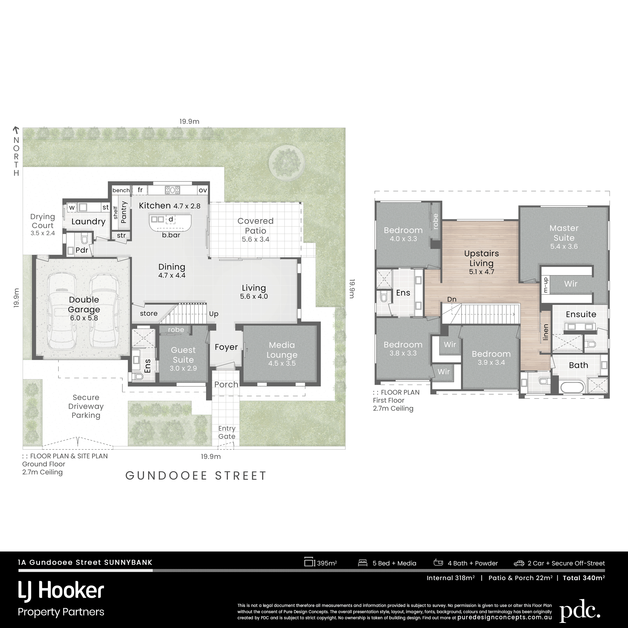 - Ground: combined tiled living/dining area, carpeted media lounge and grand covered patio