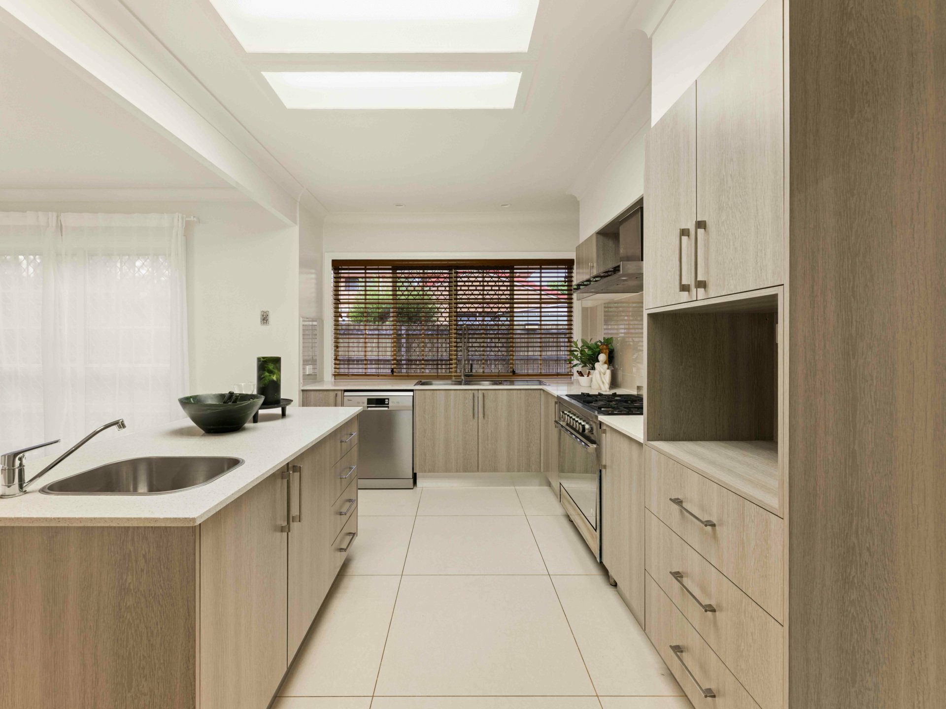 At the heart of the home, the fully renovated designer kitchen is a true statement piece. With its floating island bench, gleaming stone benchtops, and rich custom cabinetry, it's a space where form meets function. A huge chef's gas stove, gooseneck mixer, dishwasher and clever servery to the outdoor area ensure this kitchen performs as beautifully as it looks.