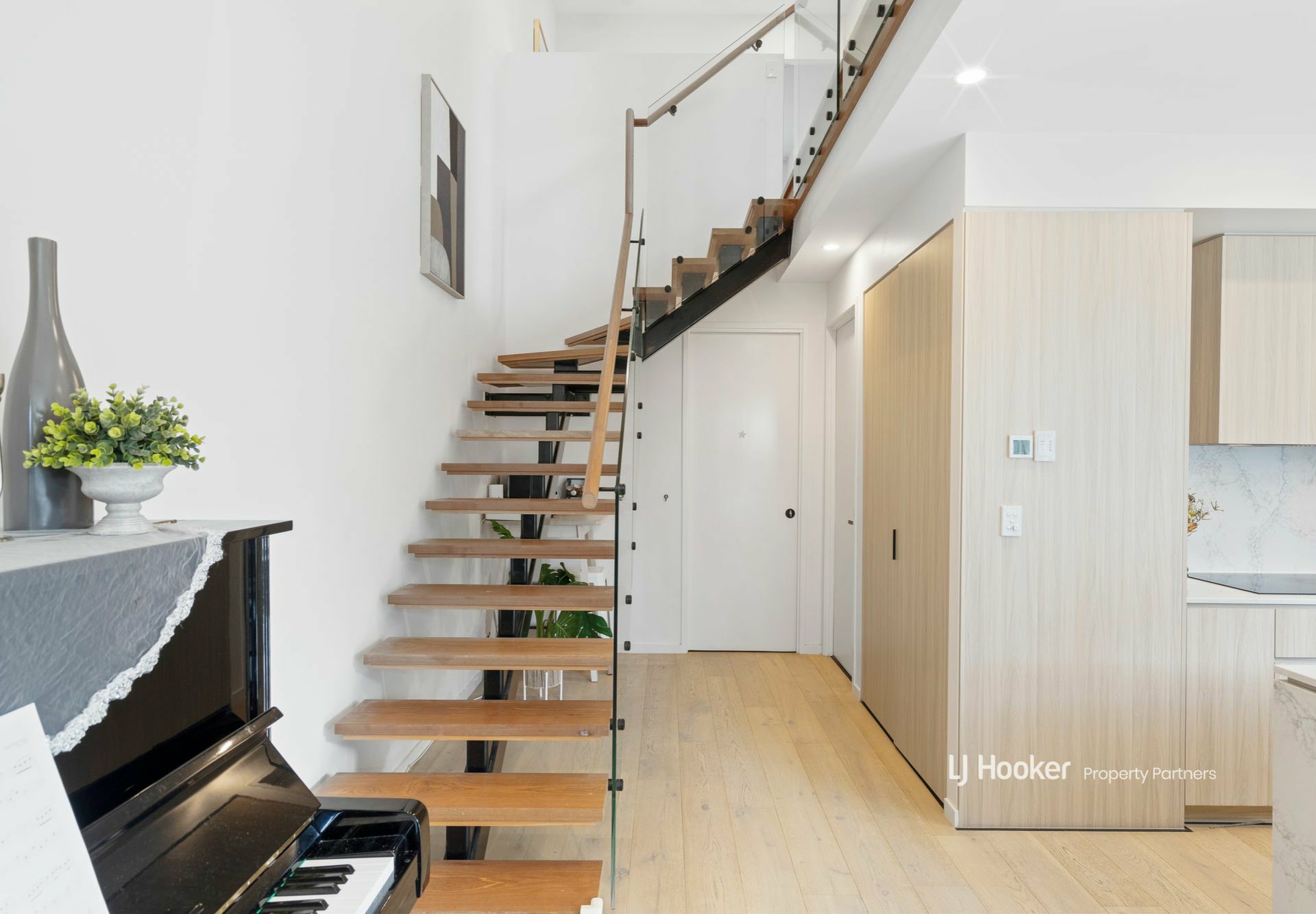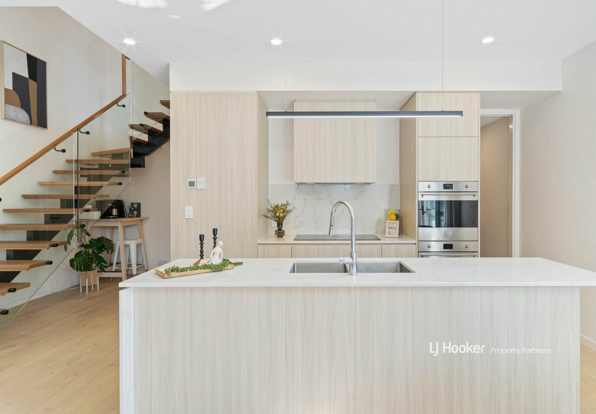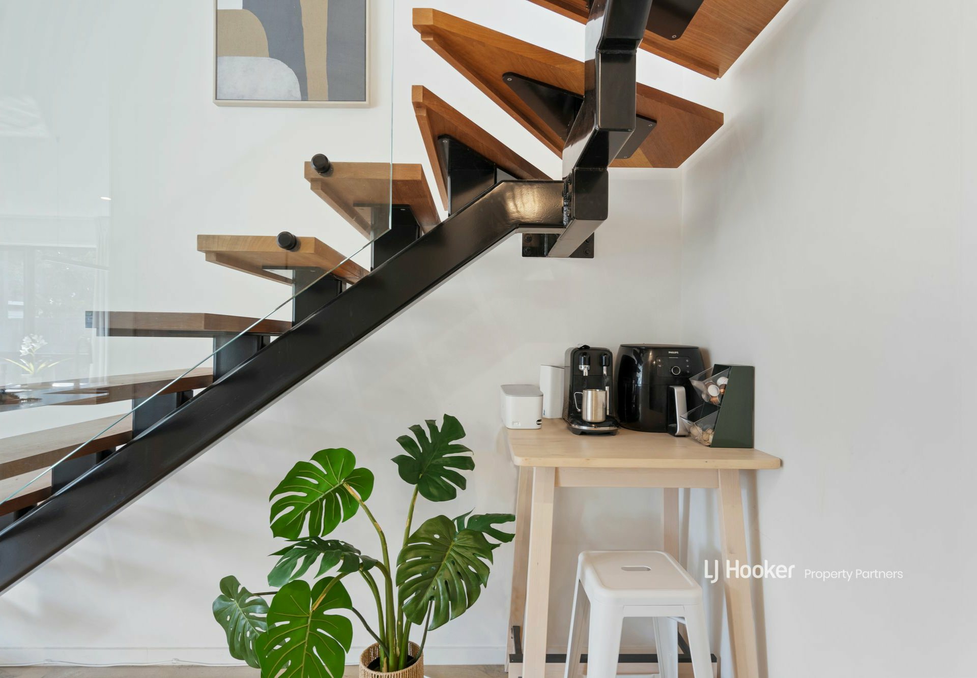 Behind the kitchen is a compact laundry, craftily concealed behind stylish cupboard doors, entry into a self-contained powder room, a slider to the double garage, and a dedicated coffee station under a floating staircase with solid timber treads and space-enhancing frameless glass balustrade.