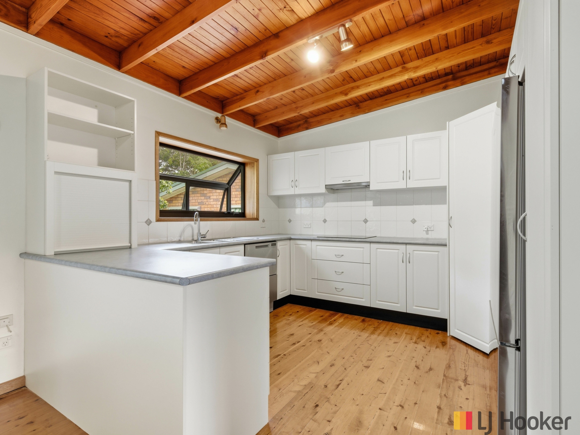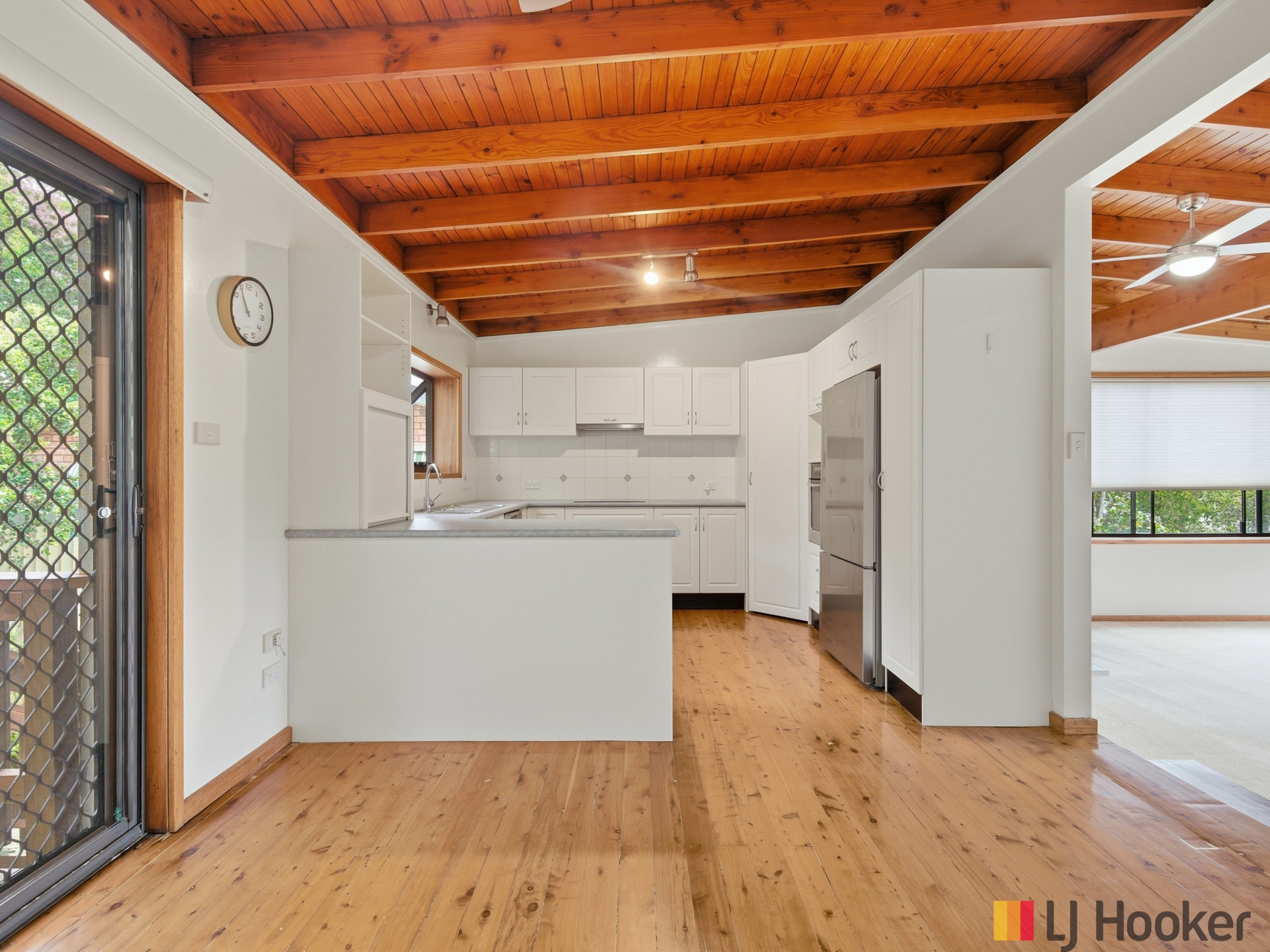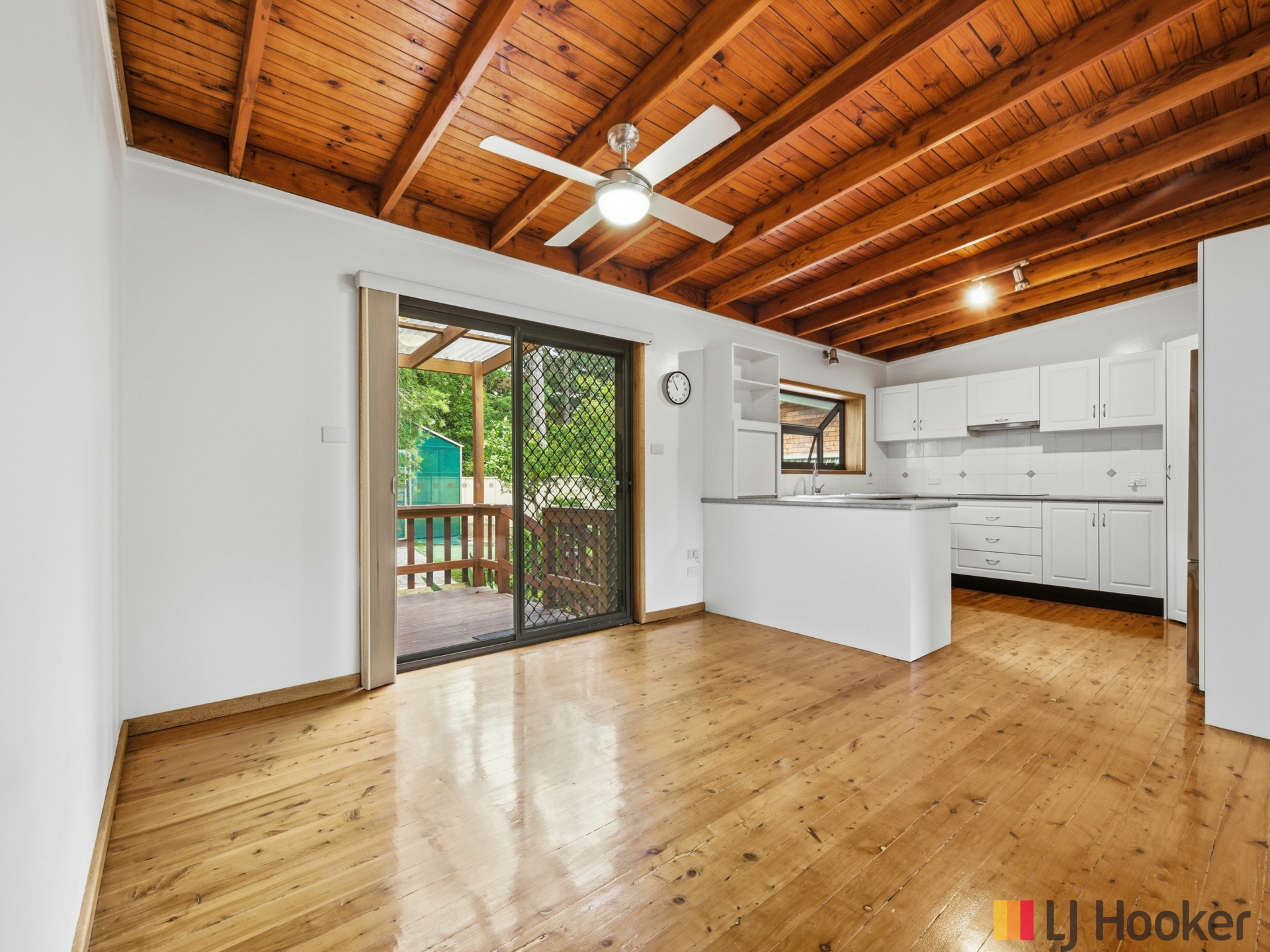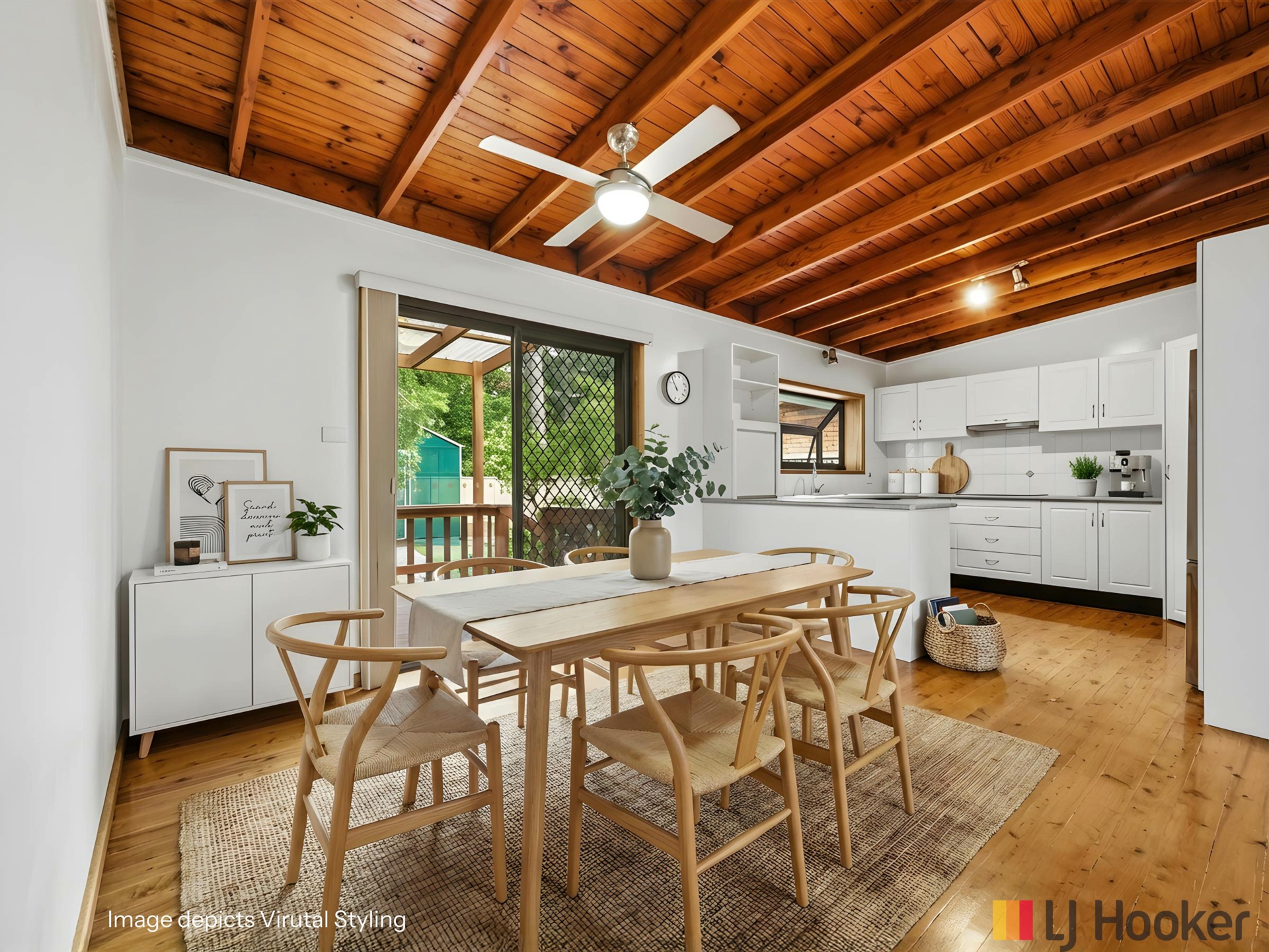The well-appointed kitchen offers electric appliances, ample bench space, excellent storage and a breakfast bar. The adjoining dining area, adorned with stunning Cypress Pine flooring, flows effortlessly through glass sliding doors to the undercover rear deck - perfect for entertaining family and friends in a relaxed environment.