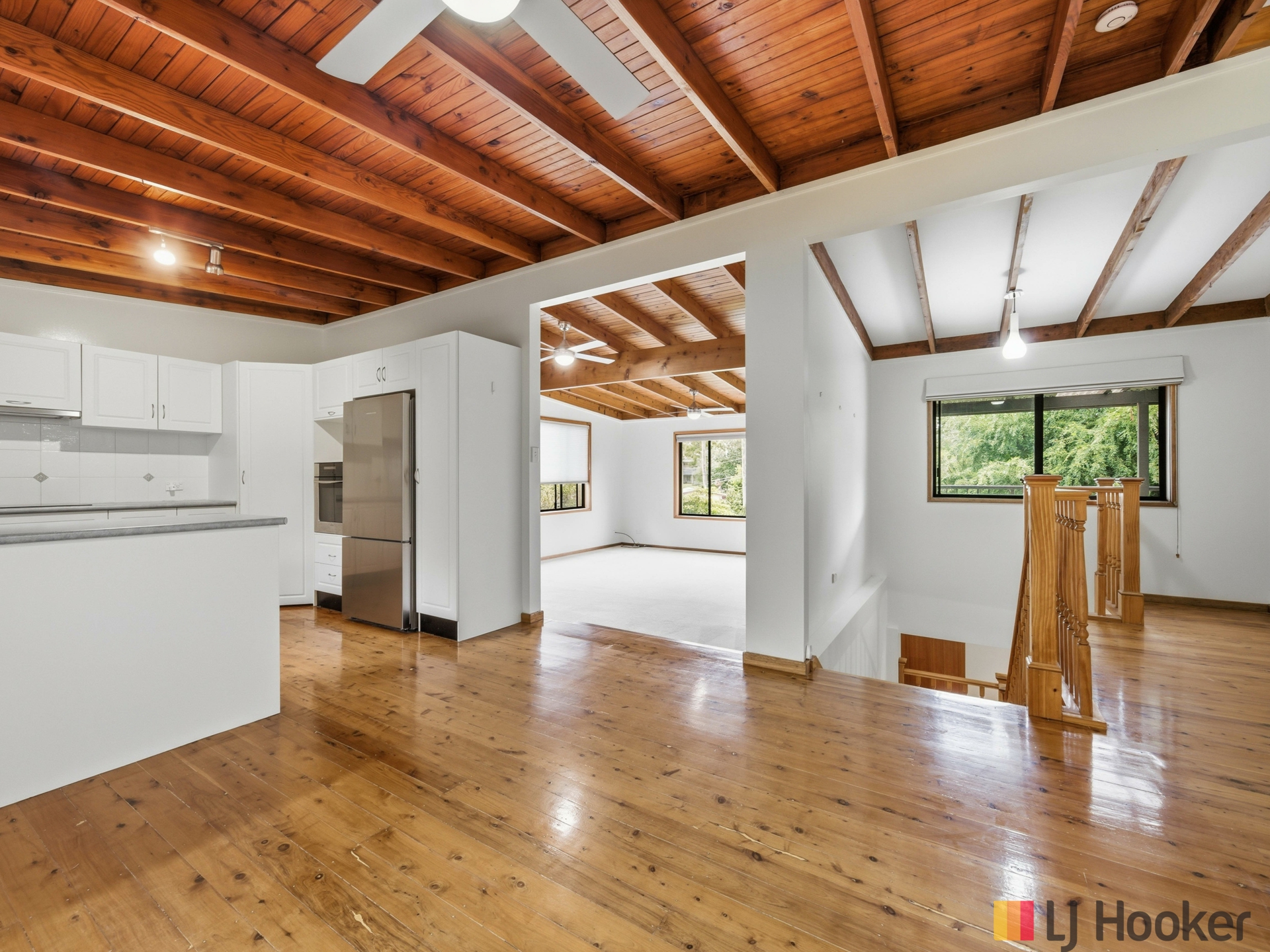Upstairs is the heart of the home - a huge open-plan living area complete with cosy fireplace, reverse-cycle air conditioning and access to the undercover front balcony. The master bedroom also opens onto this balcony and features large wardrobes. A second generously sized bedroom includes built-in robes, with a conveniently located main bathroom, while ceiling fans throughout ensure year-round comfort.