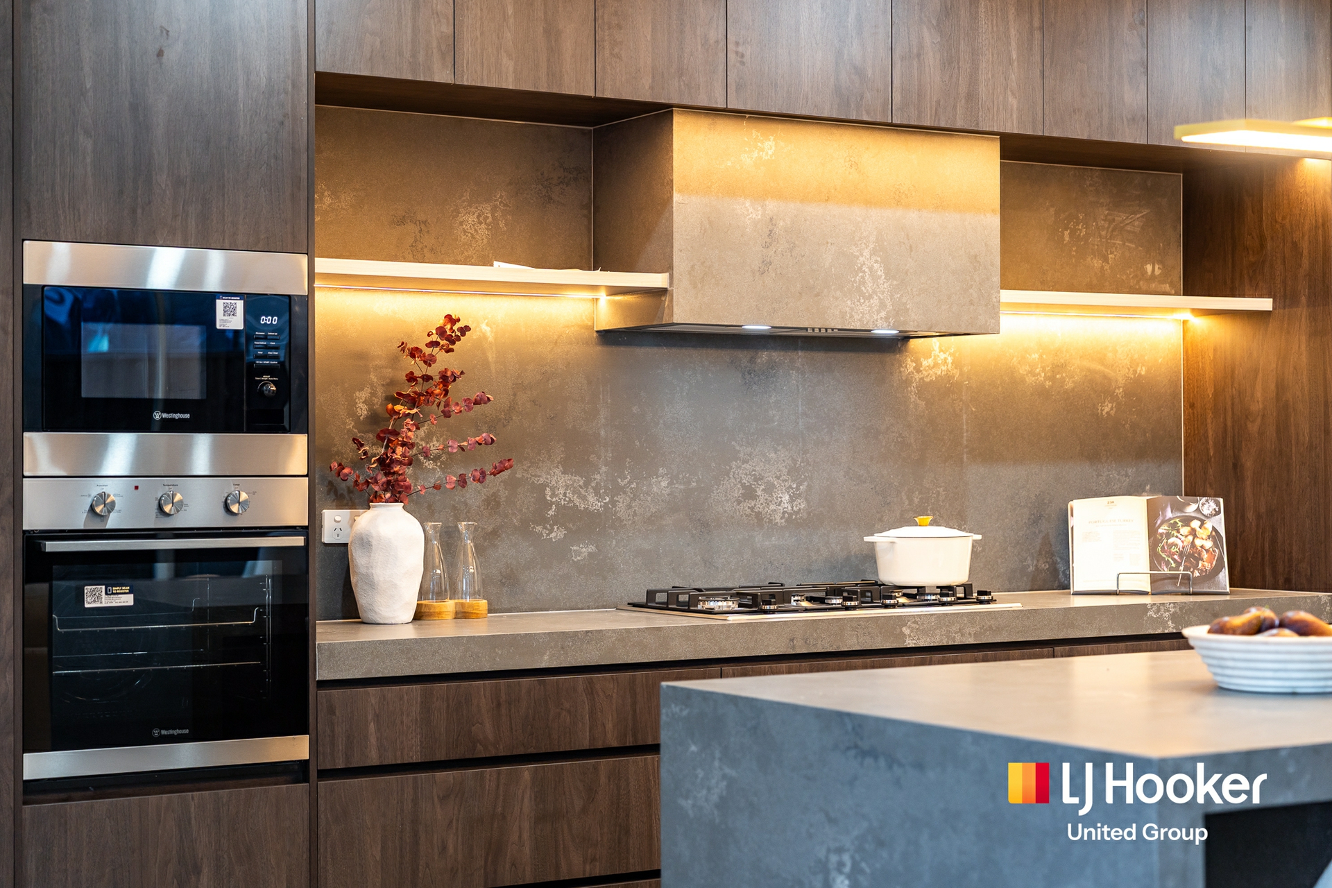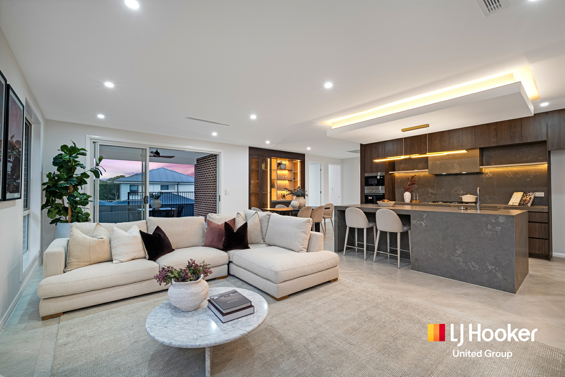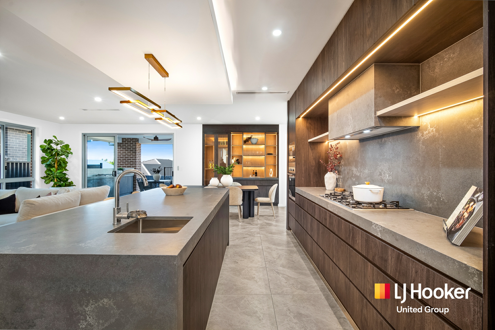 At the heart of the home, a luxe kitchen features gas cooking, a wall-mounted oven, stainless steel dishwasher and a stunning island bench with waterfall edges, all complemented by a fully equipped butler's pantry. Flowing effortlessly into the main lounge and dining area, the space is ideal for both everyday living and entertaining, while a separate front living room offers additional flexibility.