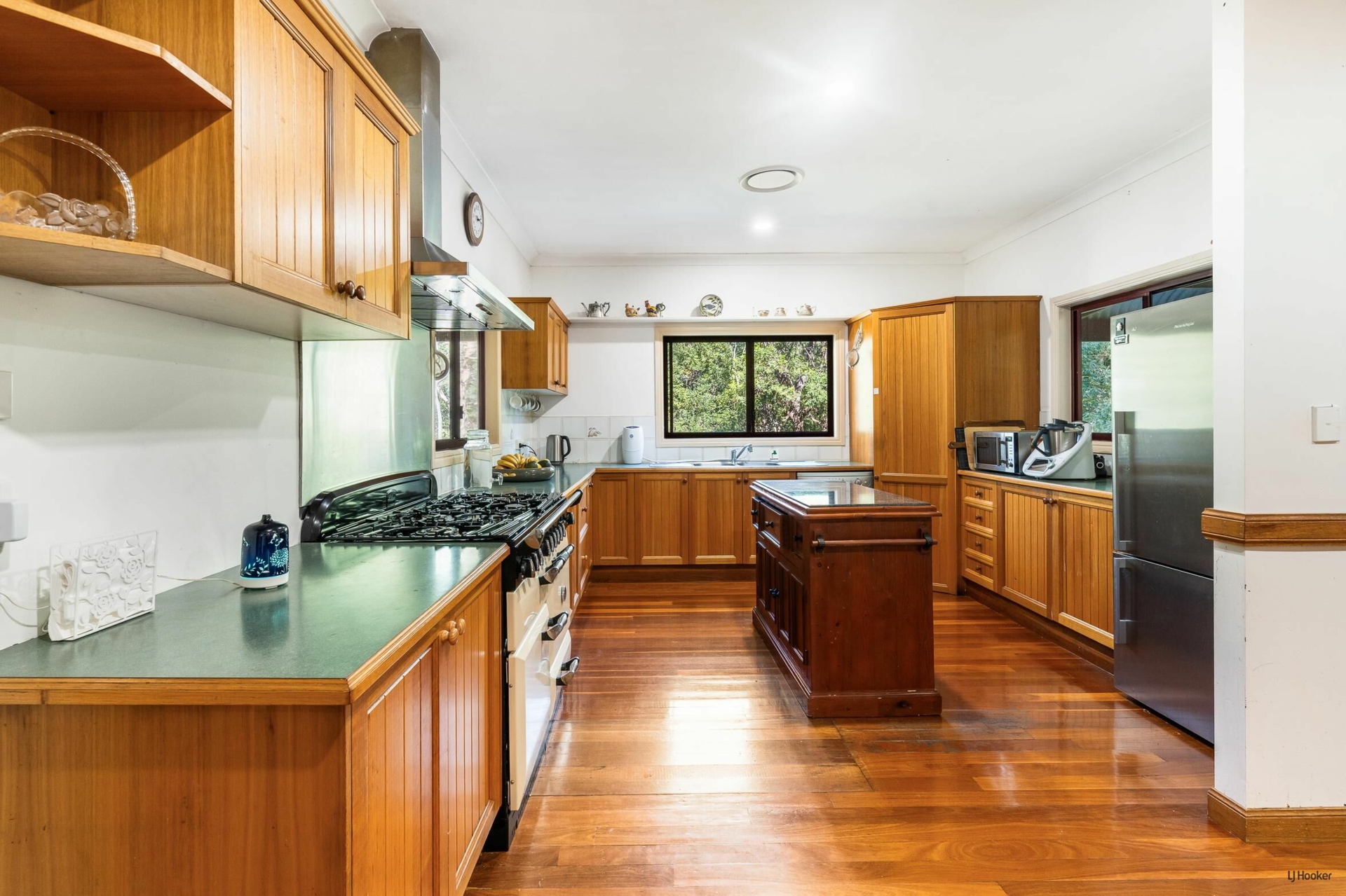 At the heart of the home, the spacious kitchen showcases classic timber cabinetry and a standout freestanding oven with gas cooktop, ideal for those who love to cook and entertain. Positioned to overlook the greenery beyond, it's a space that feels both functional and connected to the natural setting.