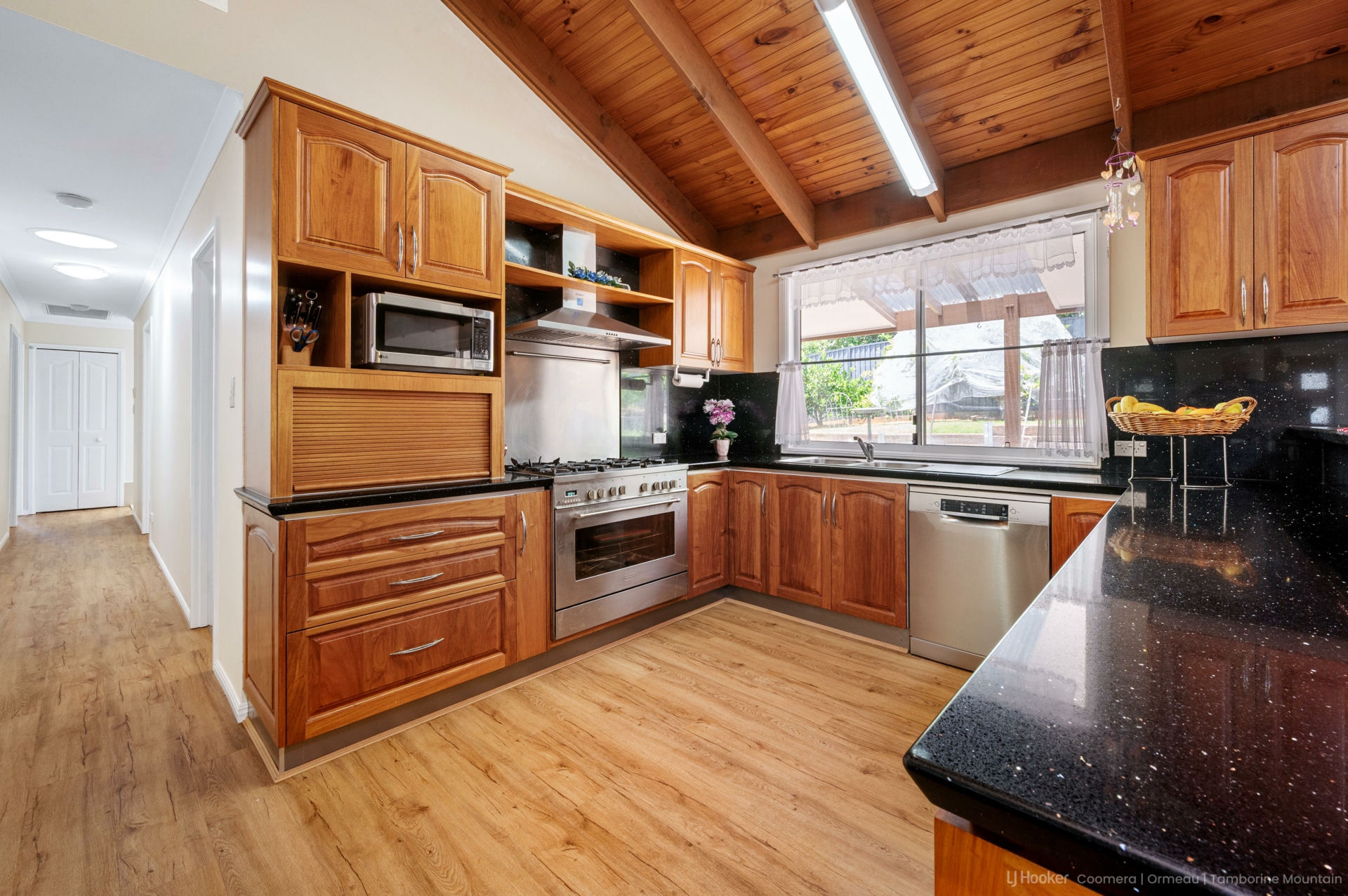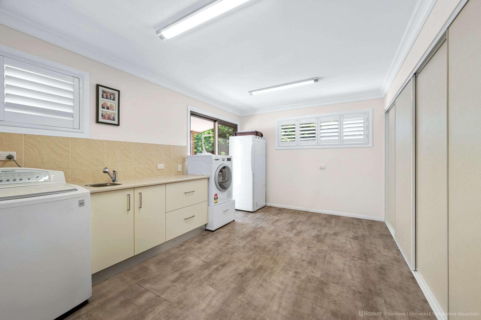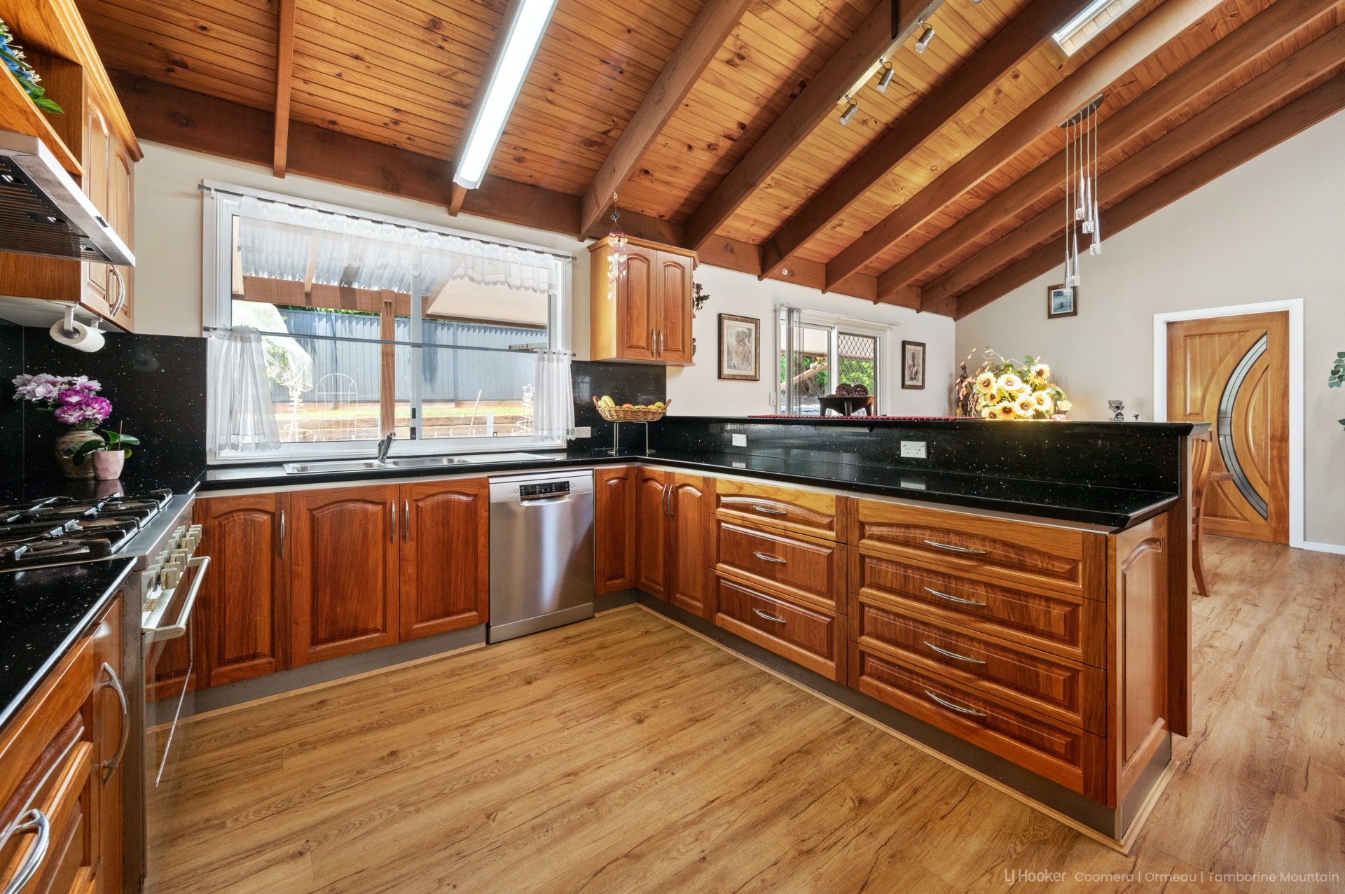 The heart of the home features combined living and dining spaces, complemented by a striking New Guinea rosewood kitchen with granite benchtops. A separate utility kitchen and extensive storage make entertaining and everyday living a breeze. Adding to the practicality is a huge laundry and utility room with wall-to-wall storage.