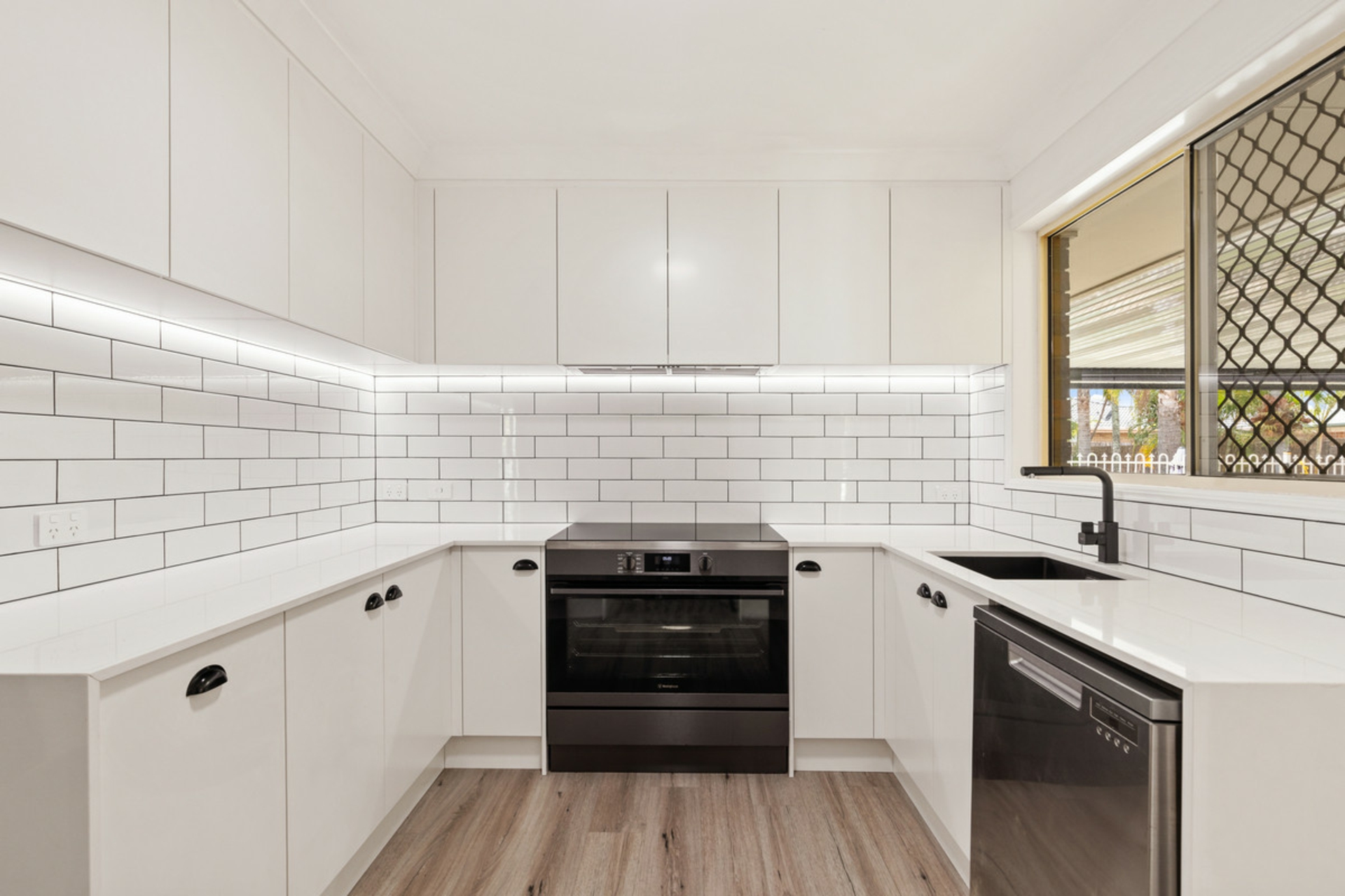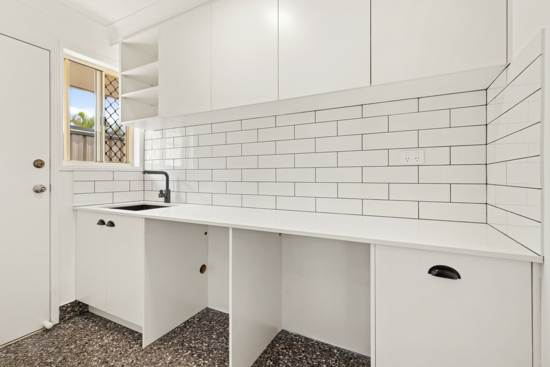 The laundry has been freshly updated with stone benchtop, overhead cupboards, and subway tile feature wall.