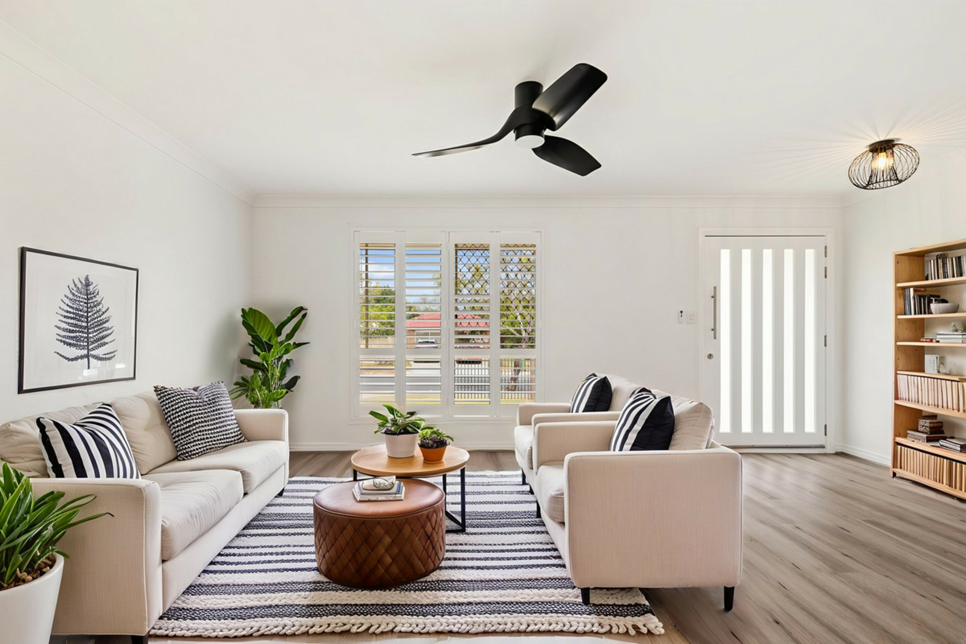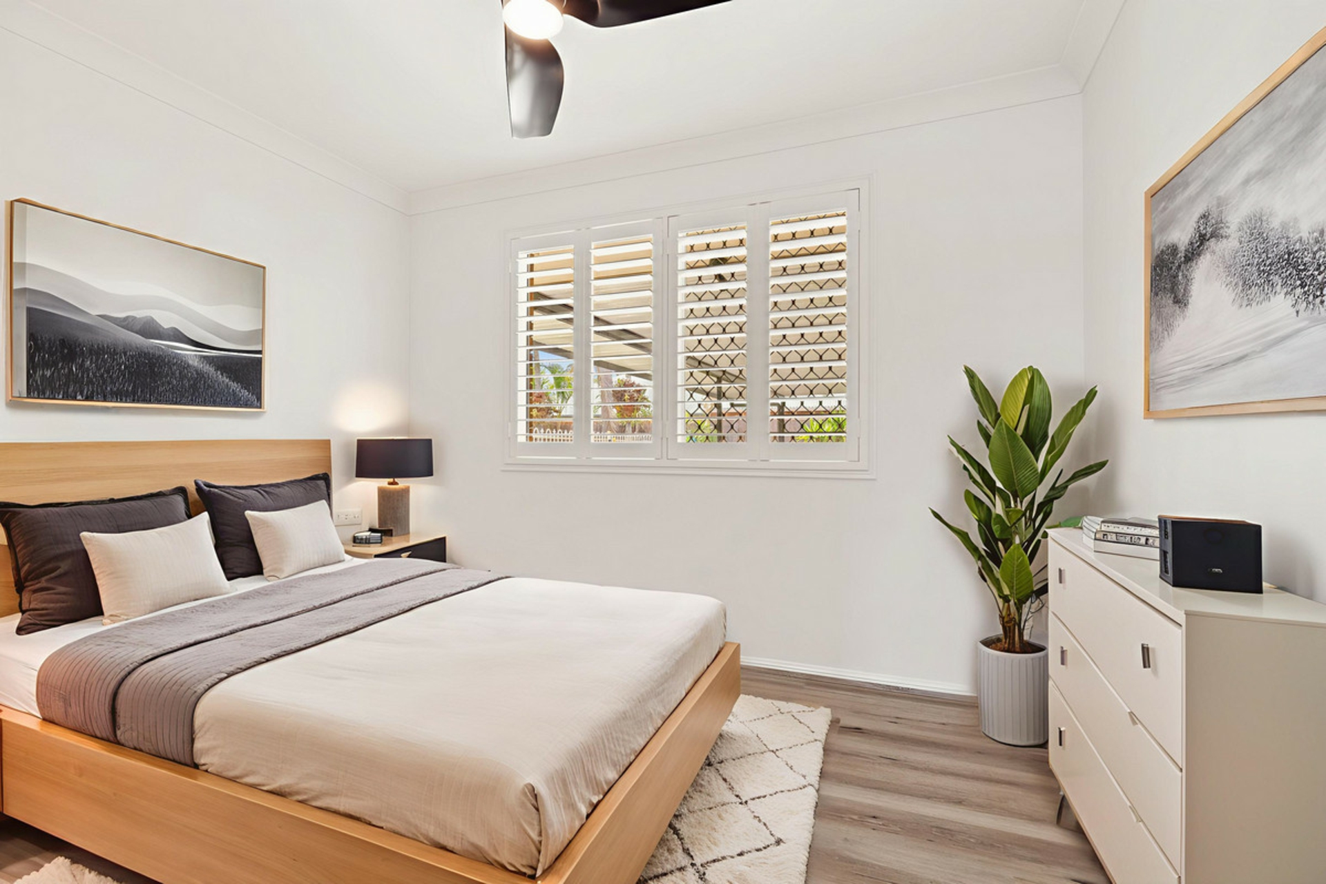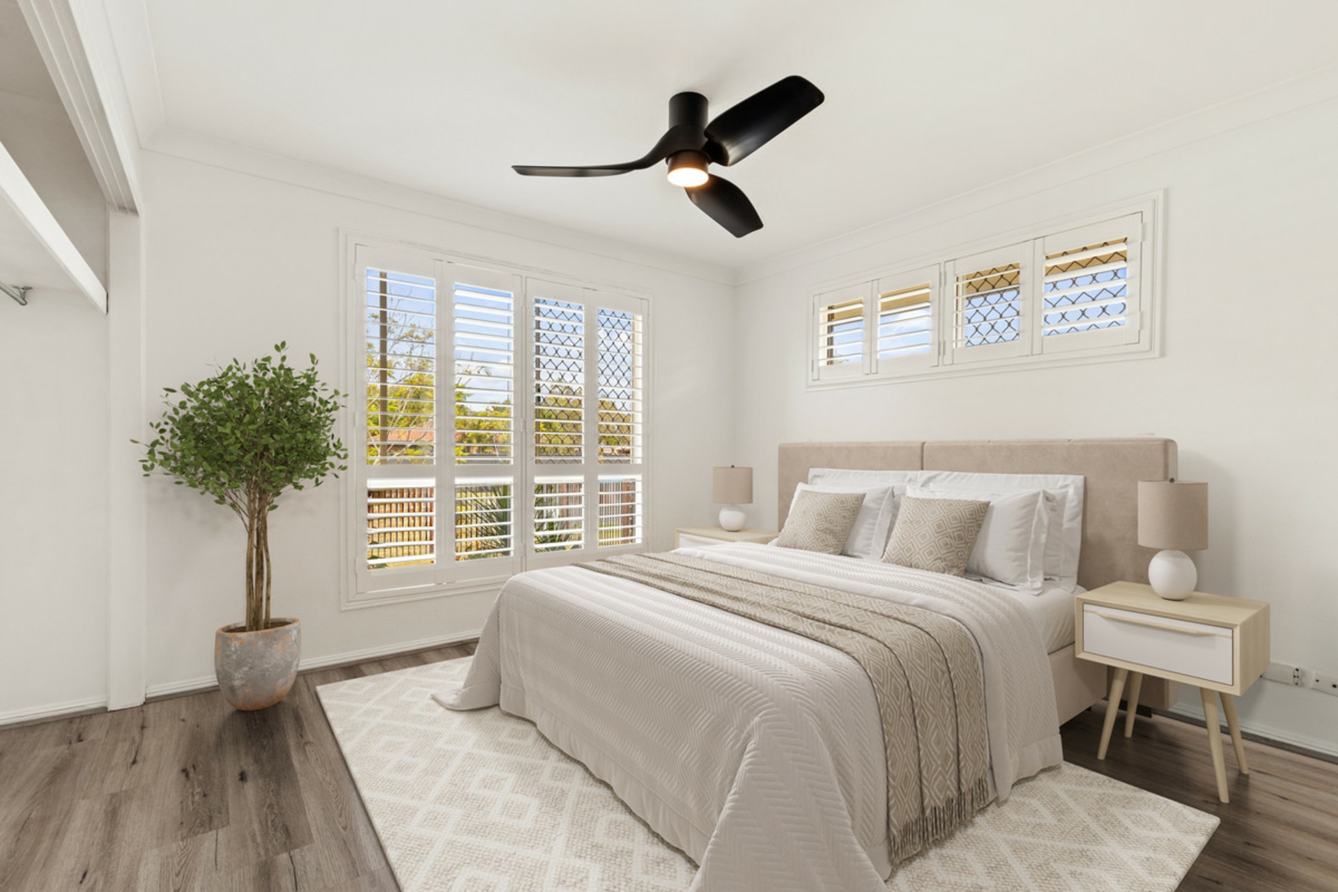 Three bedrooms all with Plantation shutters, black modern ceiling fans and built-in cupboards (doors are not installed on the cupboards).
