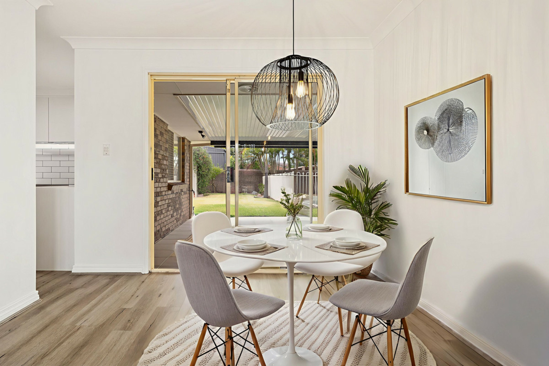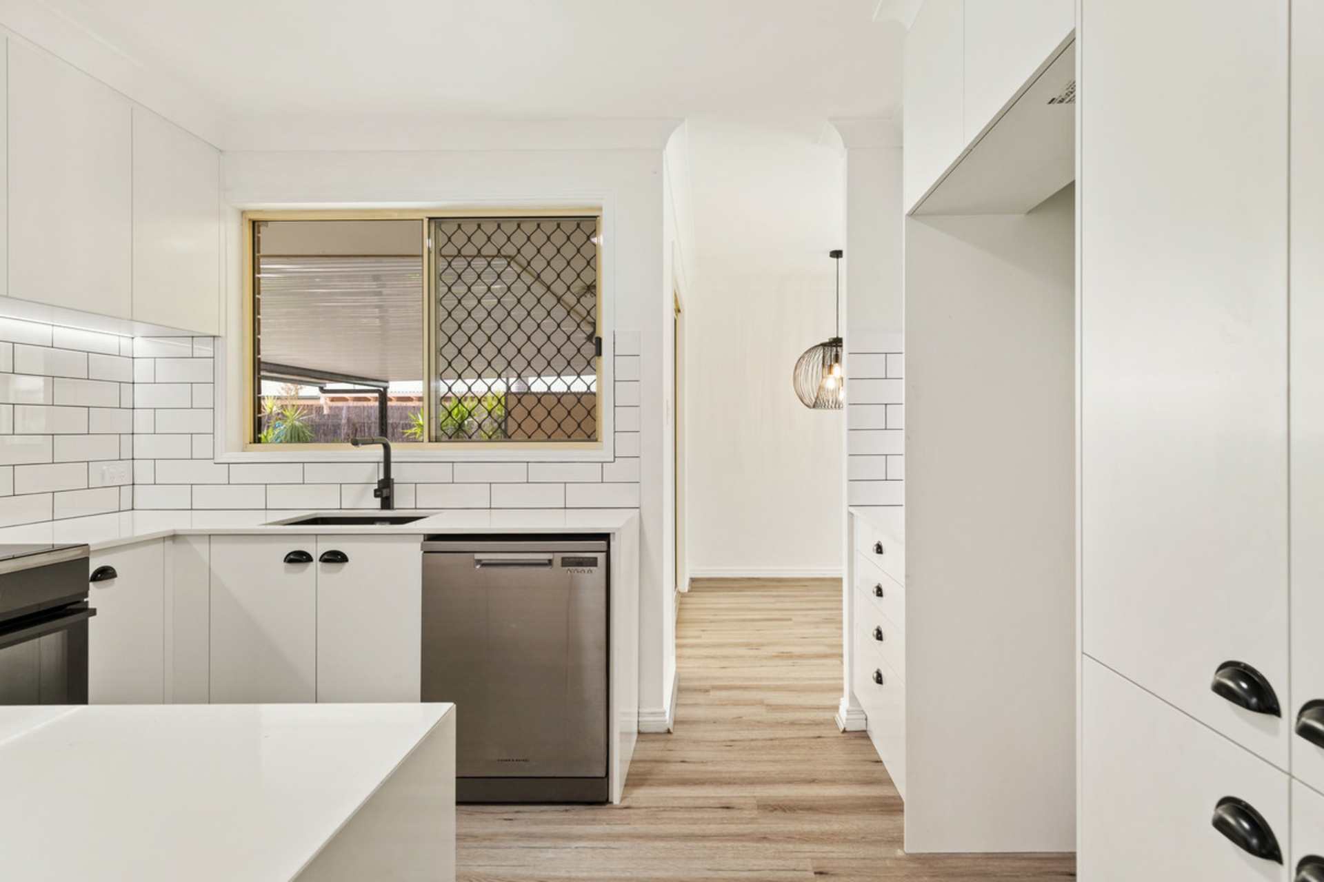As you enter you will be greeted by stunning hybrid floors, Plantation shutters throughout, a black modern fan and a contemporary pendant light over dining table and entrance. The dining room flows seamlessly to the entertainment area.
